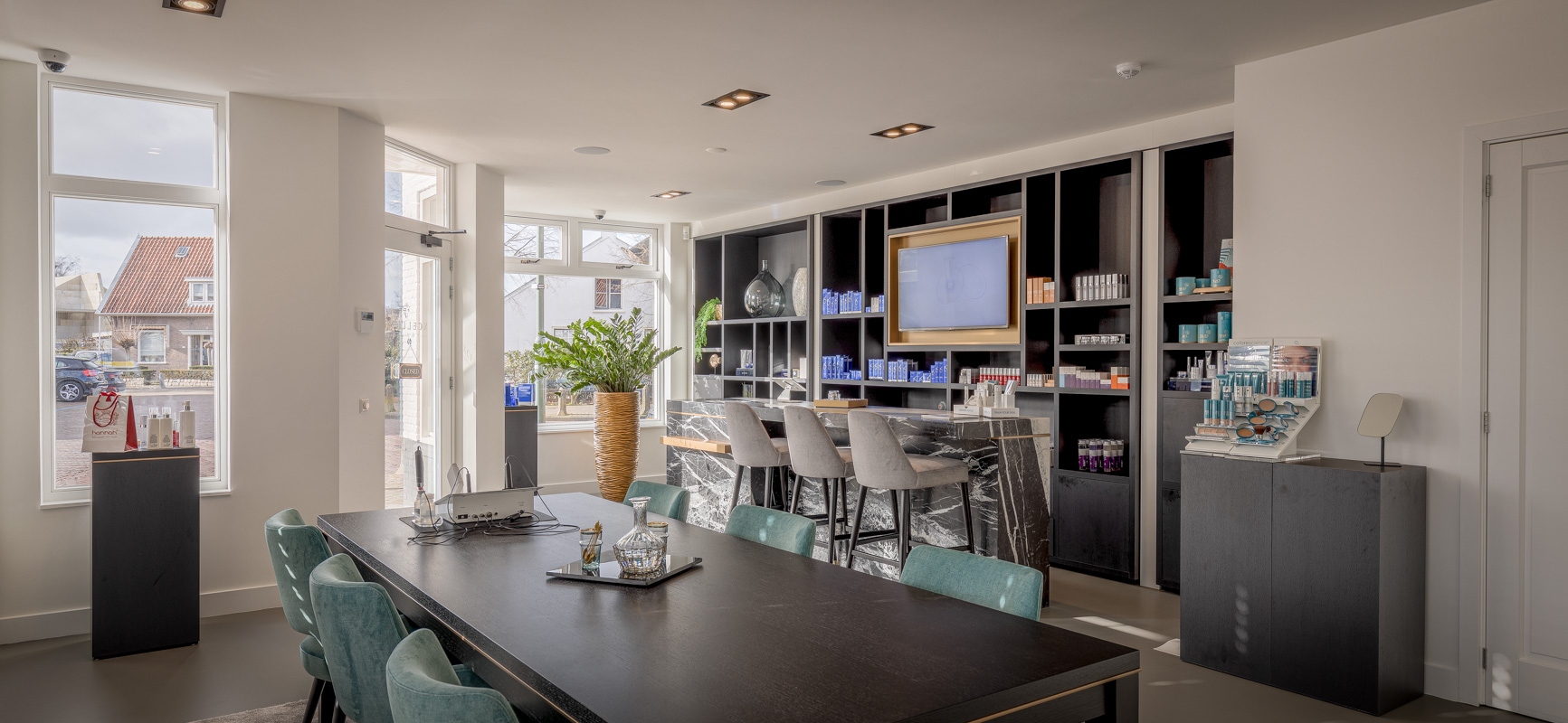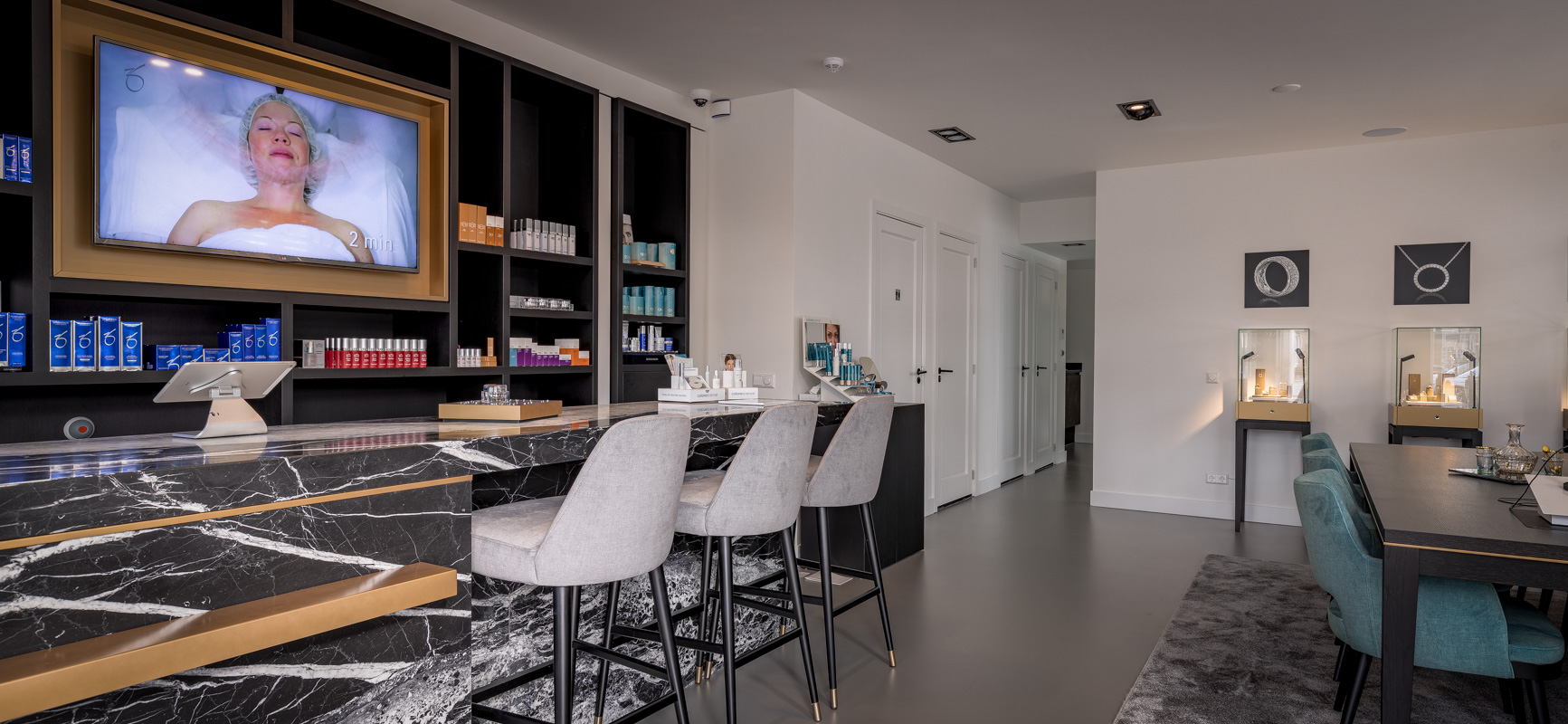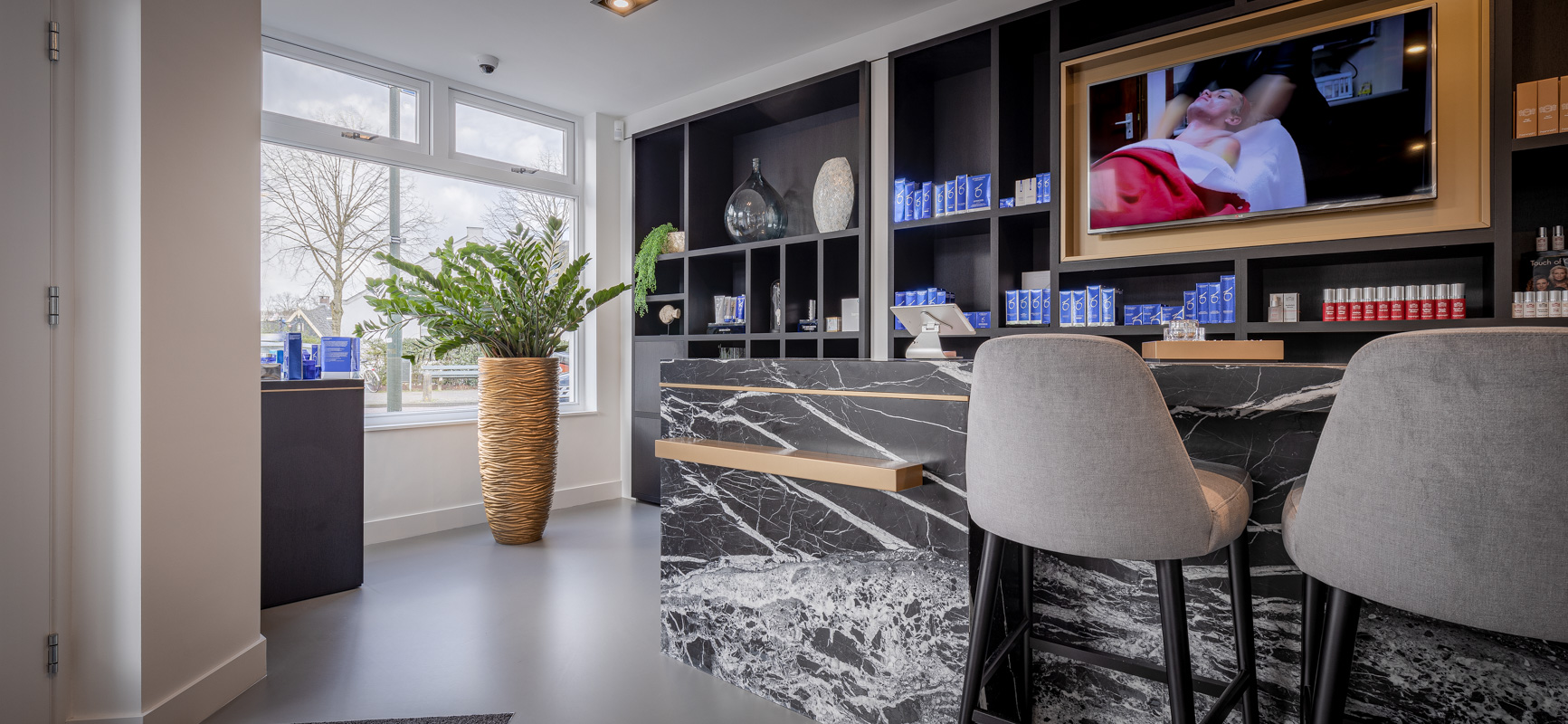 Xcellent Skin befindet sich an einem wunderschönen Punkt im Zentrum von Laren (NL). Die Hauttrainerin und Spezialistin für Hautpflege Silvia Atanasova hat hier ihre Praxis. Ein einzigartiges Gesamtkonzept mit wirksamen, hautverbessernden Behandlungsmethoden lockt Kunden aus der gesamten Region an. Für die Einrichtung mit maßgeschneiderte Innenausstattung ihres Salons kam Silvia zu WSB. Wärme, Gastfreundschaft und Professionalität soll das Interieur ausstrahlen. Die luxuriösen und edlen Materialien in Kombination mit dem Gebäude führen zum gewünschten Ergebnis; Ein wunderbares Geschäft, in dem sich jeder sofort vertraut fühlt. Neben Schönheit verkauft Silvia auch eine Reihe exklusiver Schmuckstücke, die mit den schönsten Diamanten veredelt sind. Edle Vitrinen mit hochwertiger Beleuchtung geben der Sammlung eine fantastische Bühne.