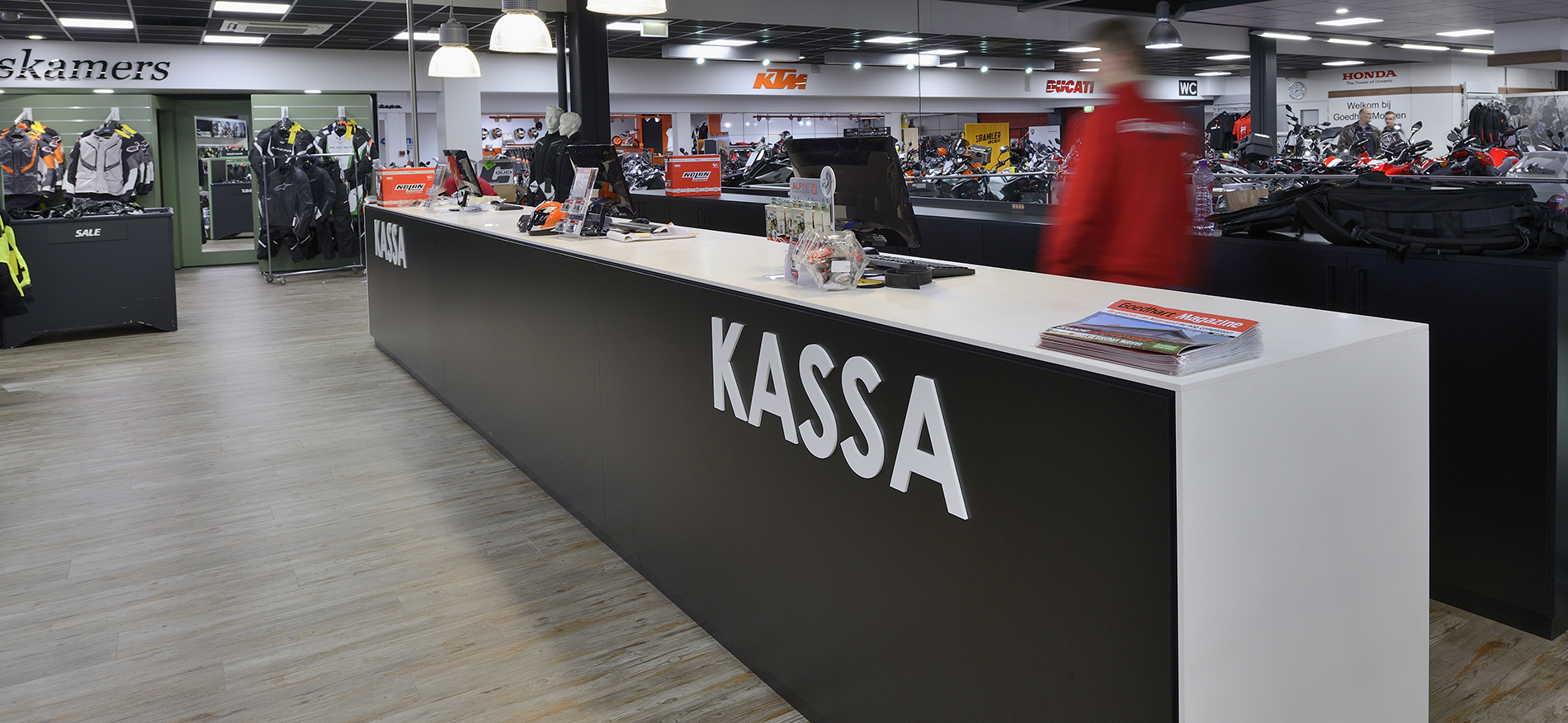 Die Marktposition des größten Motorradfachhändlers in den Benelux-Ländern hat sich durch eine Erweiterung des Showrooms um 600 Quadratmeter stark gefestigt. Möglich wurde diese Erweiterung durch die Überdachung des Parkplatzes. Auf diese Weise entstand im ersten Stock der erforderliche Raum für ein Shop-in-Shop-Konzept. Jede Motorradmarke hat eine eigene Abteilung erhalten, komplett mit Motorrädern, Zubehör und Merchandising-Produkten.