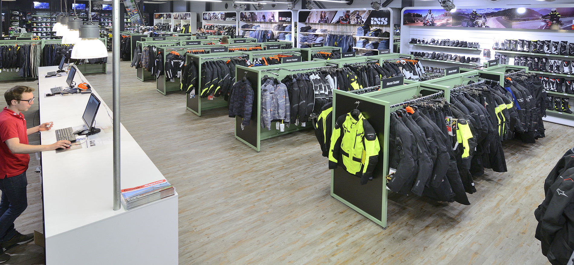 Neben der Erweiterung der Ausstellungsfläche für die Motorräder wurde auch die Abteilung für Motorradkleidung, Helme und Schuhe vergrößert. In dieser Abteilung hat man sich für Schwarz, Rohstahl und Elemente in Grün entschieden. Dies alles soll eine gedankliche Verbindung zur Geschwindigkeit und zur Umwelt herstellen.