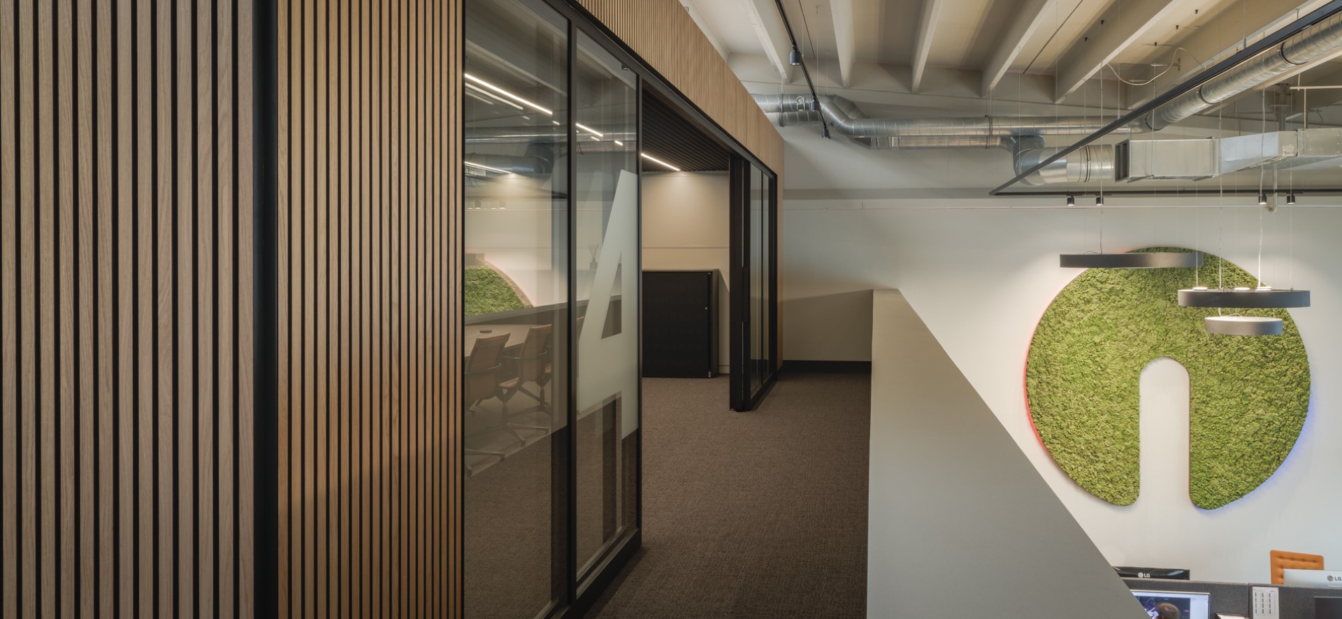 Viel Aufmerksamkeit für die Akustik dieses Raumes sorgt dafür, dass das Büro trotz harter Materialien angenehm zu hören ist. Aufgrund der Höhe war es möglich, im bestehenden Büro zusätzlichen Platz zu schaffen.