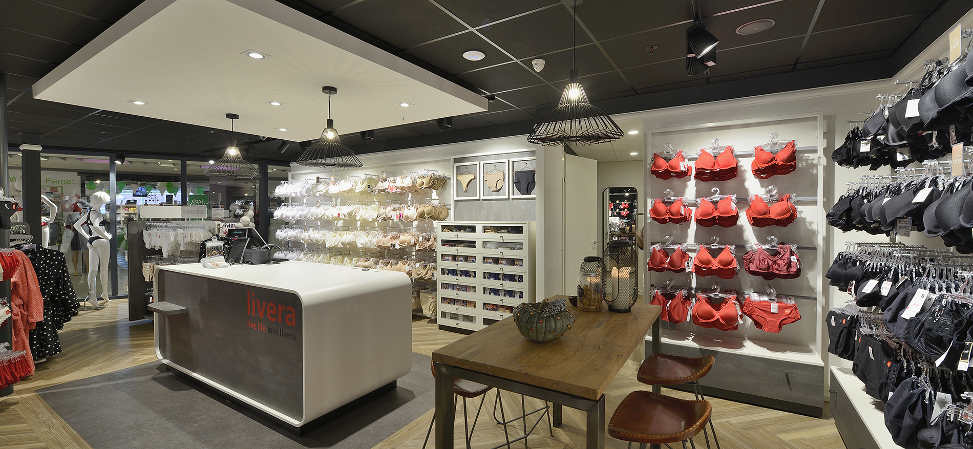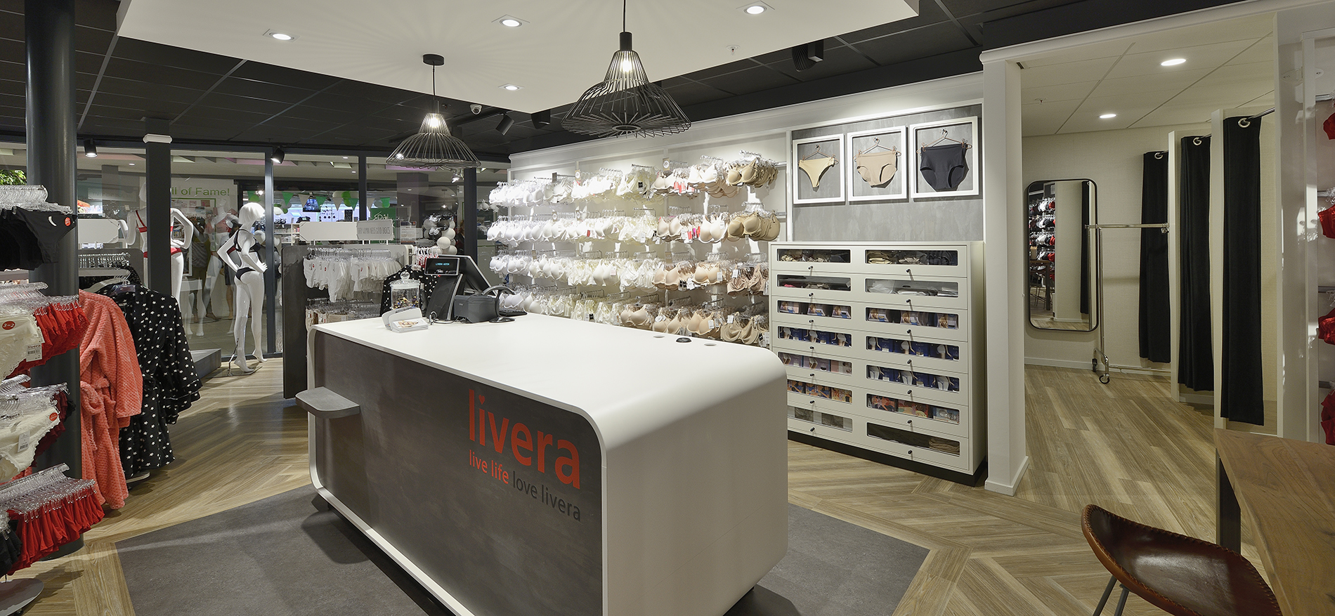 Mit der Einführung des neuen Ladenkonzepts bekommt die Body-Fashion-Formel einen neuen, frischen Impuls. Die Einrichtung von Livera in Asten strahlt eine warme, persönliche Atmosphäre aus, und die Präsentation ist voll und ganz innovativ. Der Geschäftsraum ist in drei Teile verteilt, die jeder eine eigene Atmosphäre ausstrahlen. Diese drei Teile schließen an die unterschiedlichen Stimmungen und Wünsche von Frauen an. Die Kollektion bekannter Marken wird in dieser Innenausstattung perfekt ins rechte Licht gerückt.