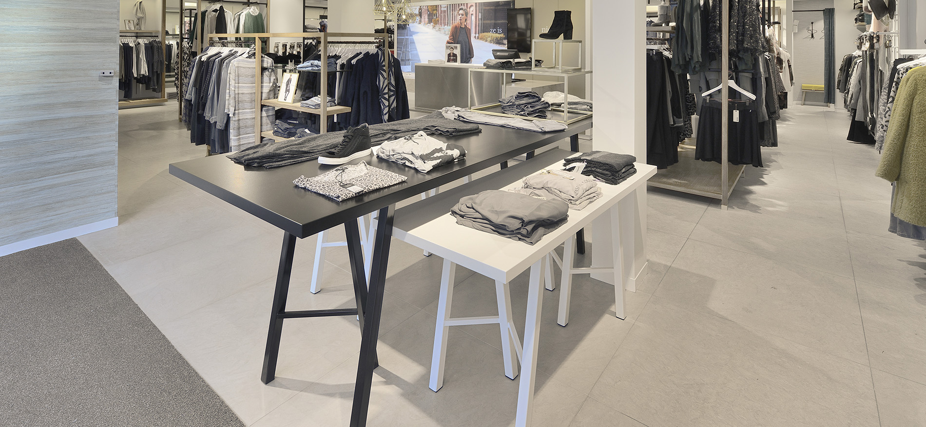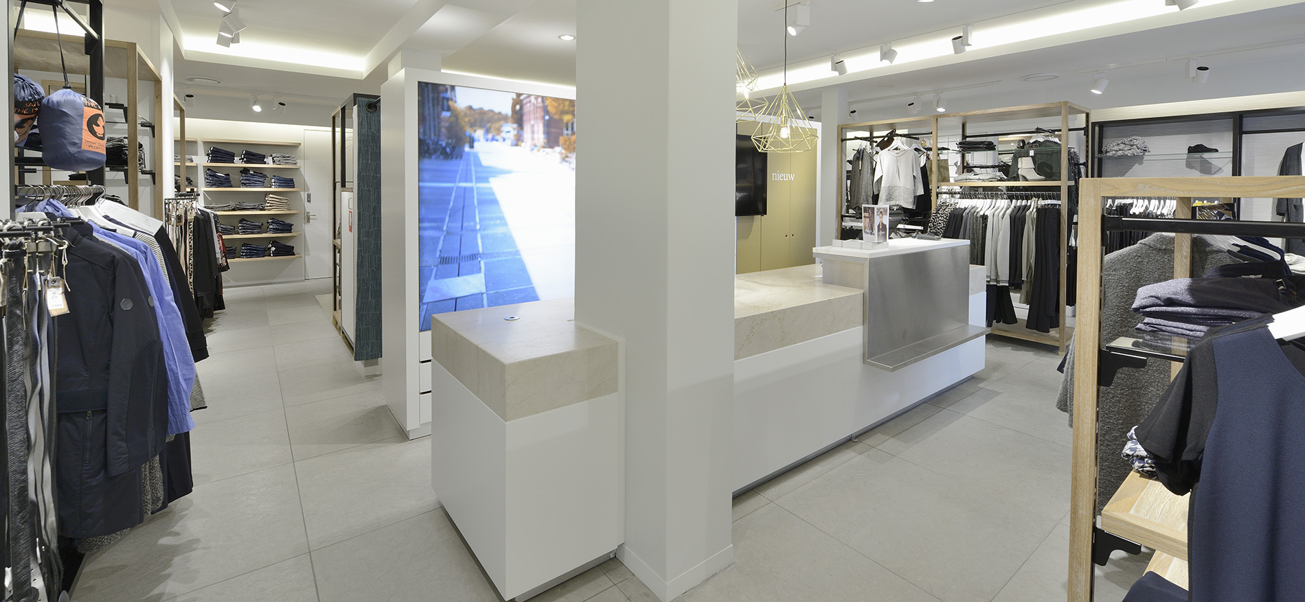 Eine echte Aufwertung des Erscheinungsbildes durch Shopdesigner WSB endet nicht mit einer neuen Farbpalette. Neue Materialien und Möbel runden den Shop ab und machen ihn fit für die Zukunft. Um die Kleidung attraktiv zu präsentieren, wurden verschiedene Präsentationsmöbel in verschiedenen Farben verwendet. Die Möbel sind hochwertig mit Materialien wie Eiche. Der veraltete Look mit Rottönen ist einem warmen, luxuriösen und dennoch offenen Look gewichen.
