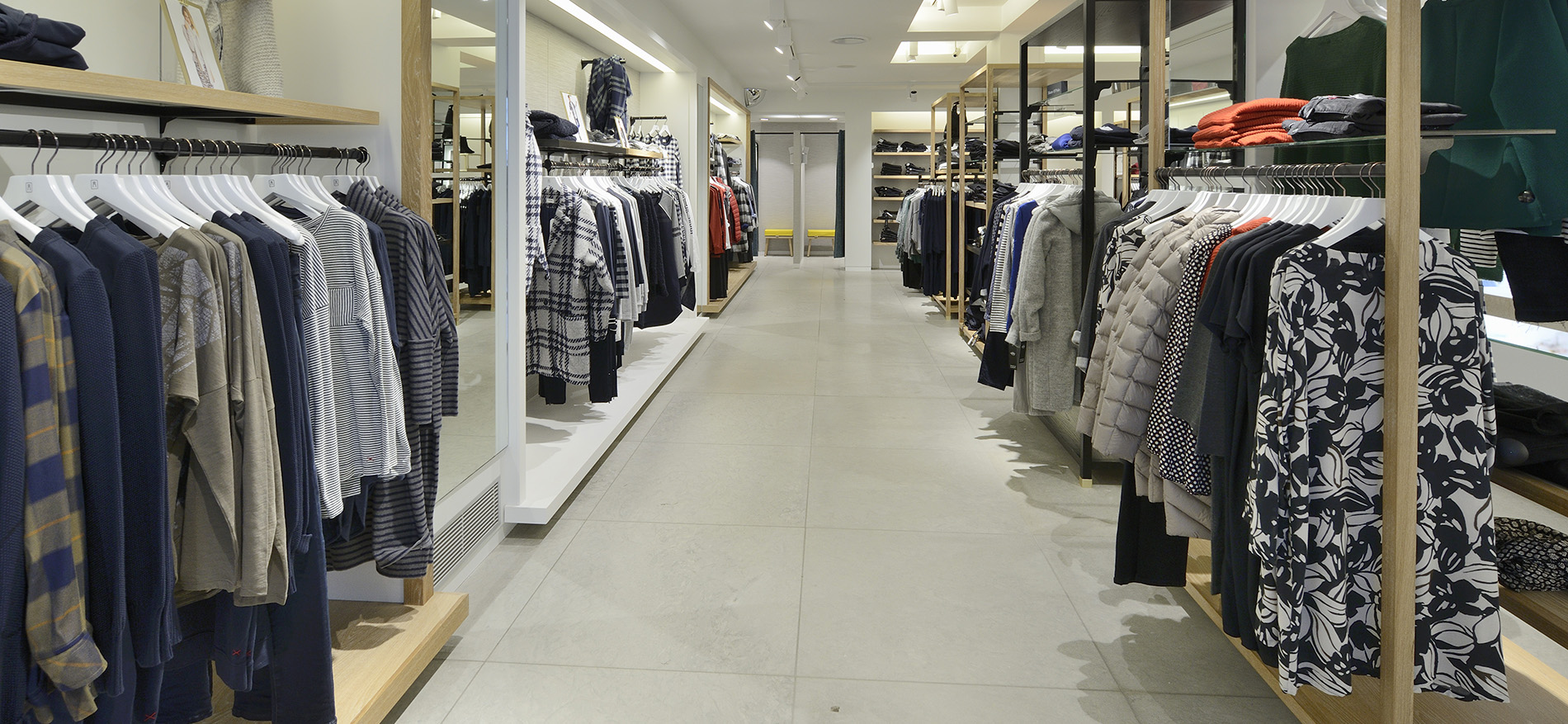 Ein echtes Upgrade der Ausstrahlung durch den Geschäftsausstatter geht jedoch viel weiter als einzig neue Farbtöne. Neue Materialien und Möbel sorgen für das optimale Gesamtbild und machen das Geschäftig zukunftsbereit. Um die Kleidung auf attraktive Weise ausstellen zu können, wurden unterschiedliche Ausstellungsmöbel in unterschiedlichen Farben benutzt. Die Möbel sind aus qualitativ hochwertigen Materialien wie Eichenholz gefertigt. Statt der veralteten Einrichtung mit Rottönen nun eine warme, luxuriöse und dennoch offene Ausstrahlung.