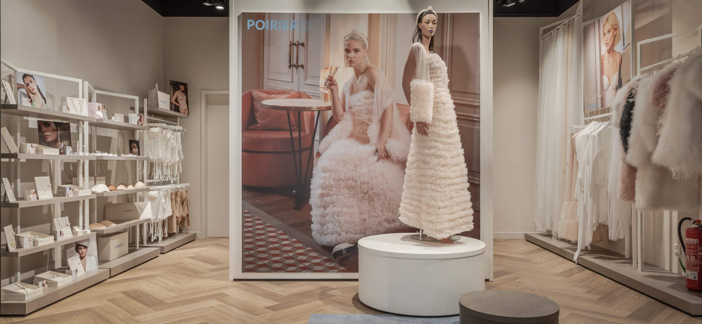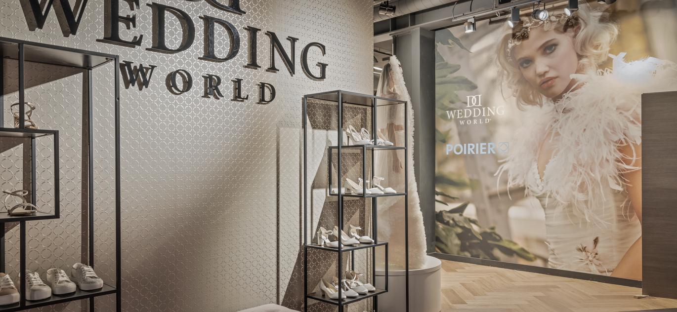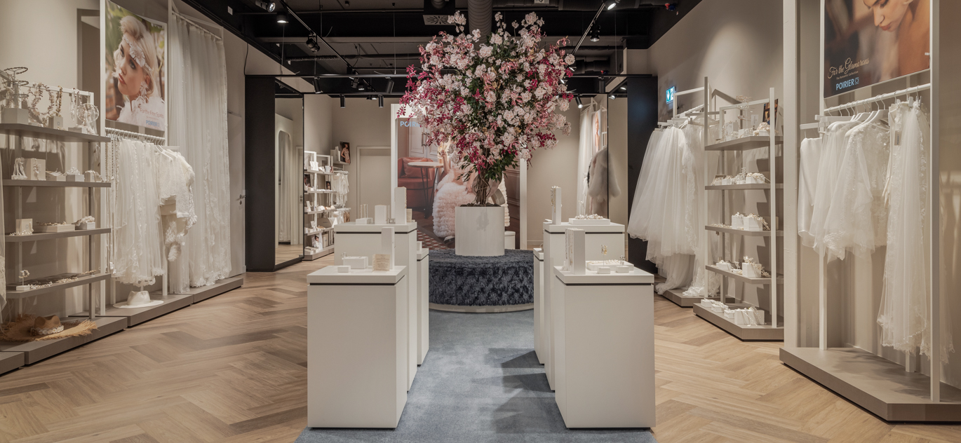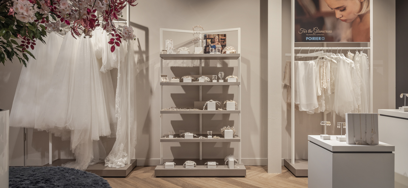 WSBdesign.com hat mit Stolz das Ladenkonzept für Poirier in Wedding World entwickelt, mit dem Ziel, einen inspirierenden und luxuriösen Shop-in-Shop für Brautmode-Accessoires zu schaffen. In der Welt der Brautmode und Brautaccessoires sind Poirier und Wedding World die bekannten und renommierten Namen. WSB durfte für sie das neue Poirier-Showroom-Design im Brautmodengeschäft der Wedding World in Oberhausen realisieren. Poirier ist die Brautmodemarke für Schmuck, Dessous, Petticoats, Schleier, Haarschmuck und verschiedene andere Brautaccessoires. Jeder, der die Website von Poirier besucht, sieht auf einen Blick eine wunderschöne und umfangreiche Kollektion an Brautmode mit Sinn für Mode und Atmosphäre.