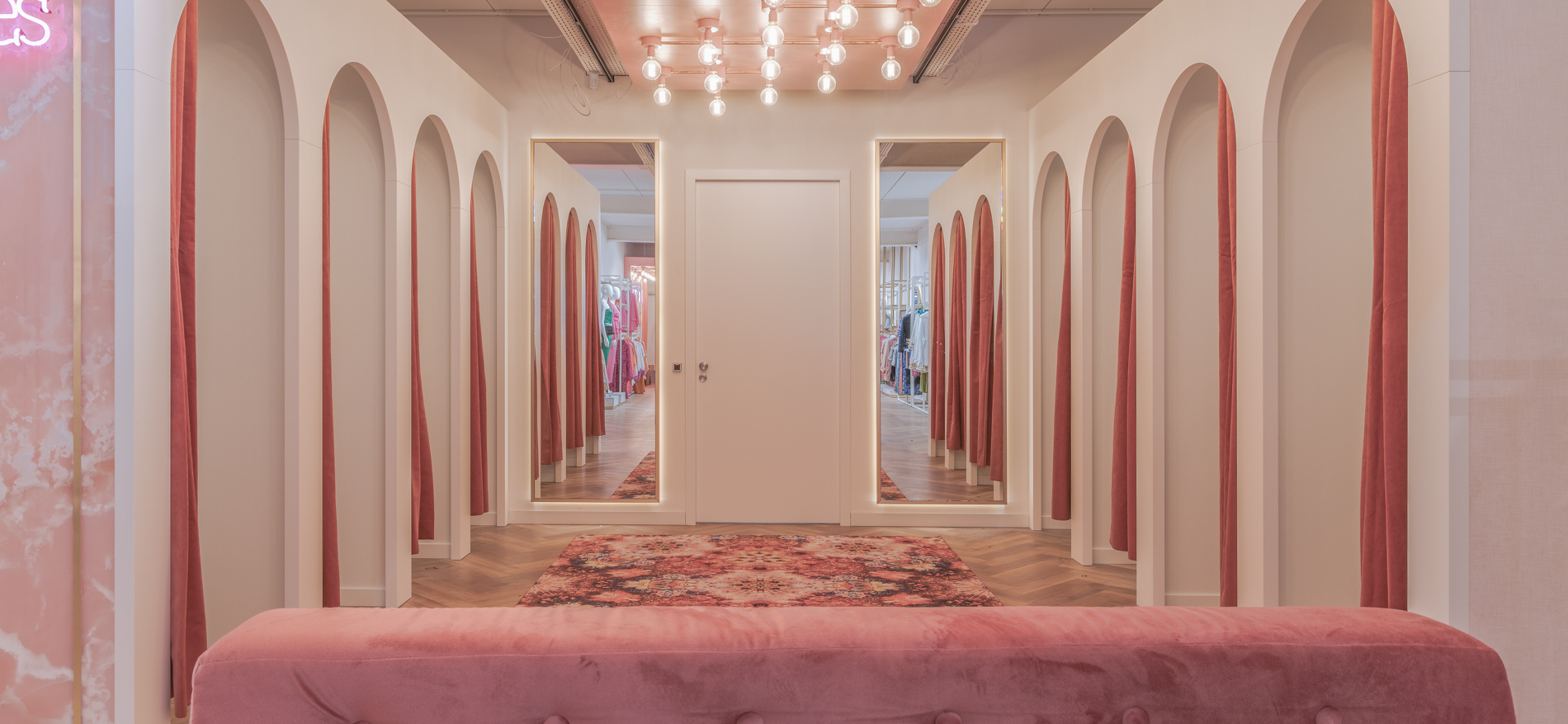 Die Schlüsselwörter sind; warm, hip und mit einer Anspielung auf die ausgeprägte „Barbie“-Atmosphäre, aber auf eine schicke Art und Weise. Ein hölzernes Fischgrätenmuster, goldene Regale, Velourstapeten, rosa Möbel und als Hingucker unter anderem jede Menge rosa Onyx auf der Theke und den Rückwänden. Eine intelligente Wegeführung sorgt dafür, dass der stark frequentierte Laden geräumig und zugänglich bleibt. Ein absoluter Hingucker in der Modewelt. Auf zum nächsten Eddy und Romy! :)