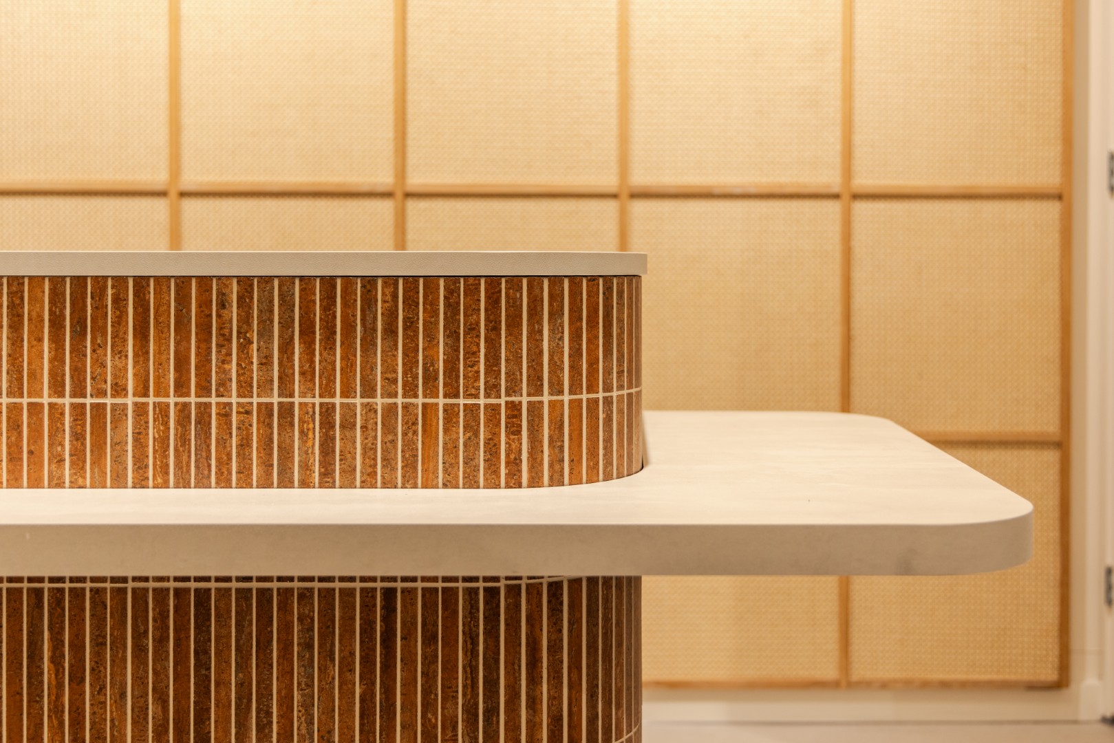 Wat deze winkel extra bijzonder maakt, is hoe het verleden zorgvuldig is meegenomen in het totaalbeeld. De mozaïektegelvloer achterin is origineel en bewust behouden, wat karakter geeft aan het pand. Ook achter de balie is gekozen voor natuurlijke materialen: een achterwand van gekalkt eiken met webbing zorgt voor een verfijnde maar moderne uitstraling. Samen met het warme kleurgebruik en de moderne elementen ontstaat er een interieurontwerp dat zich duidelijk onderscheidt van de doorsnee modewinkel.