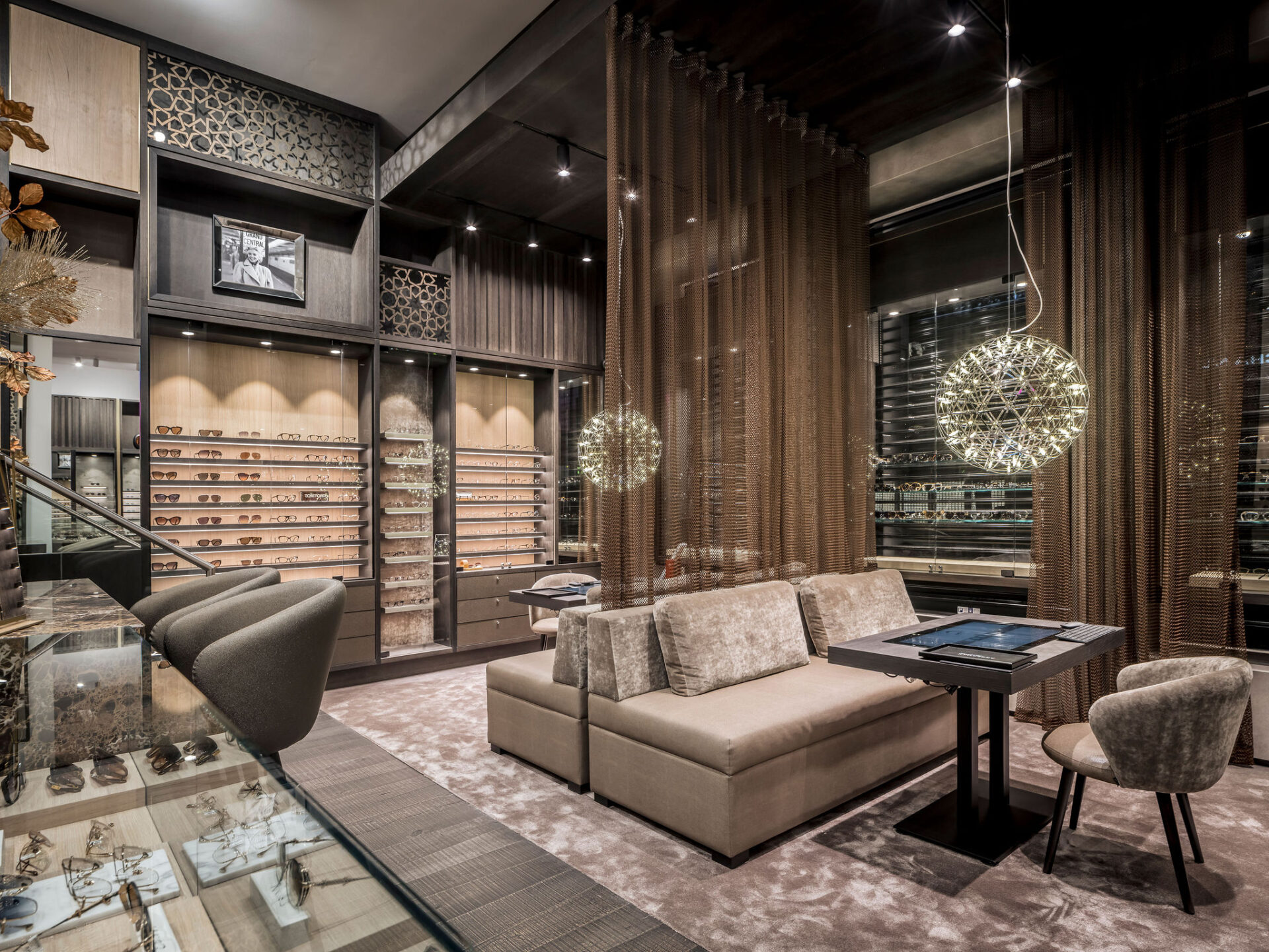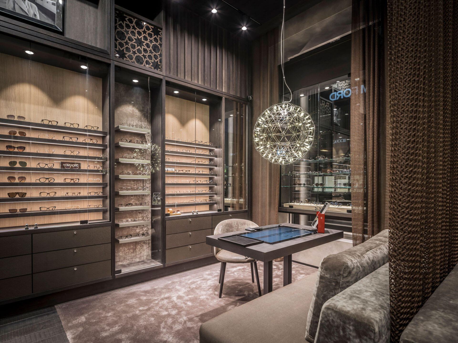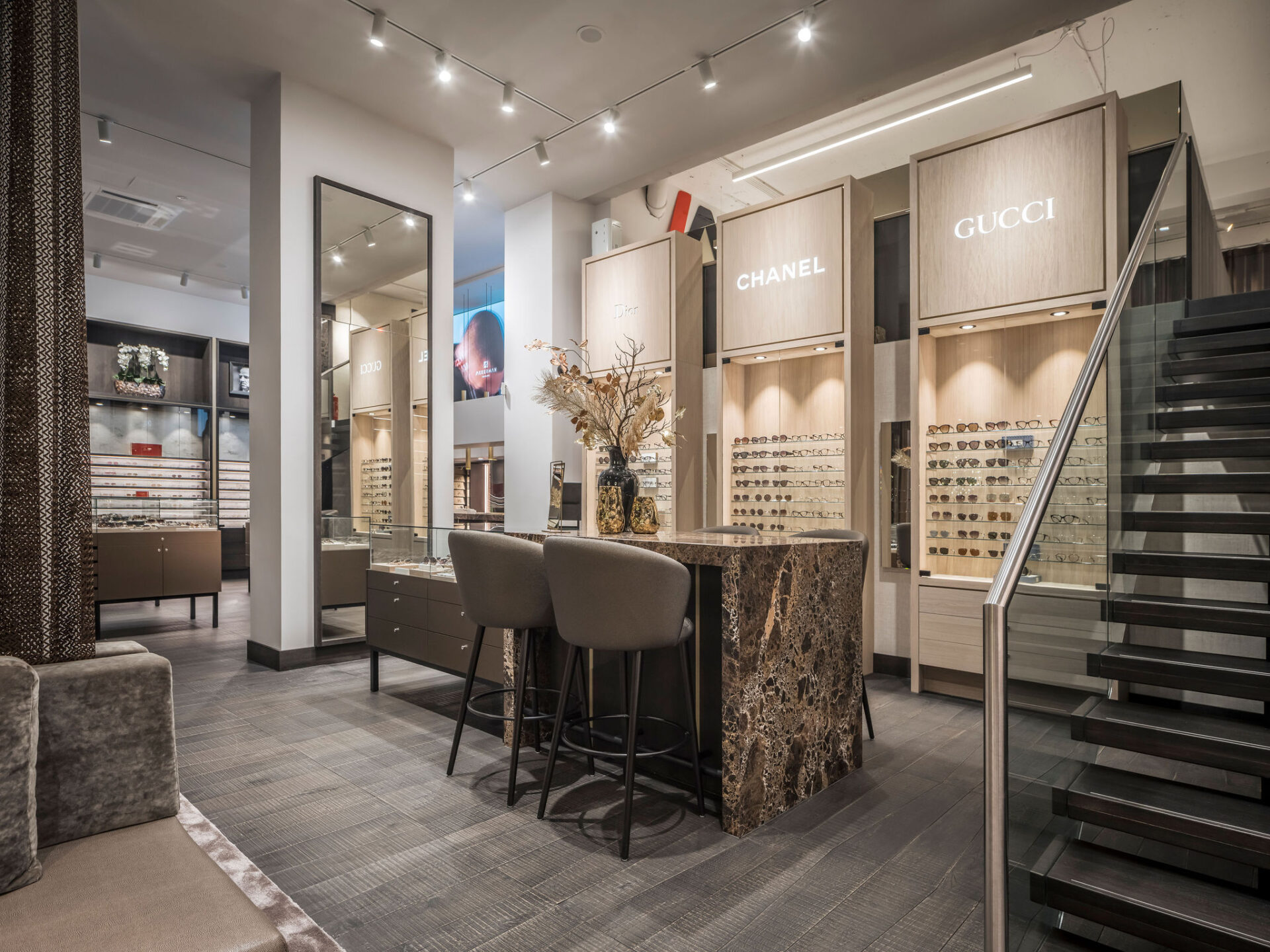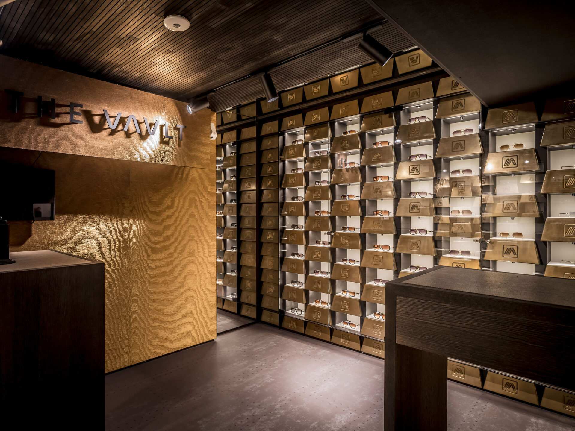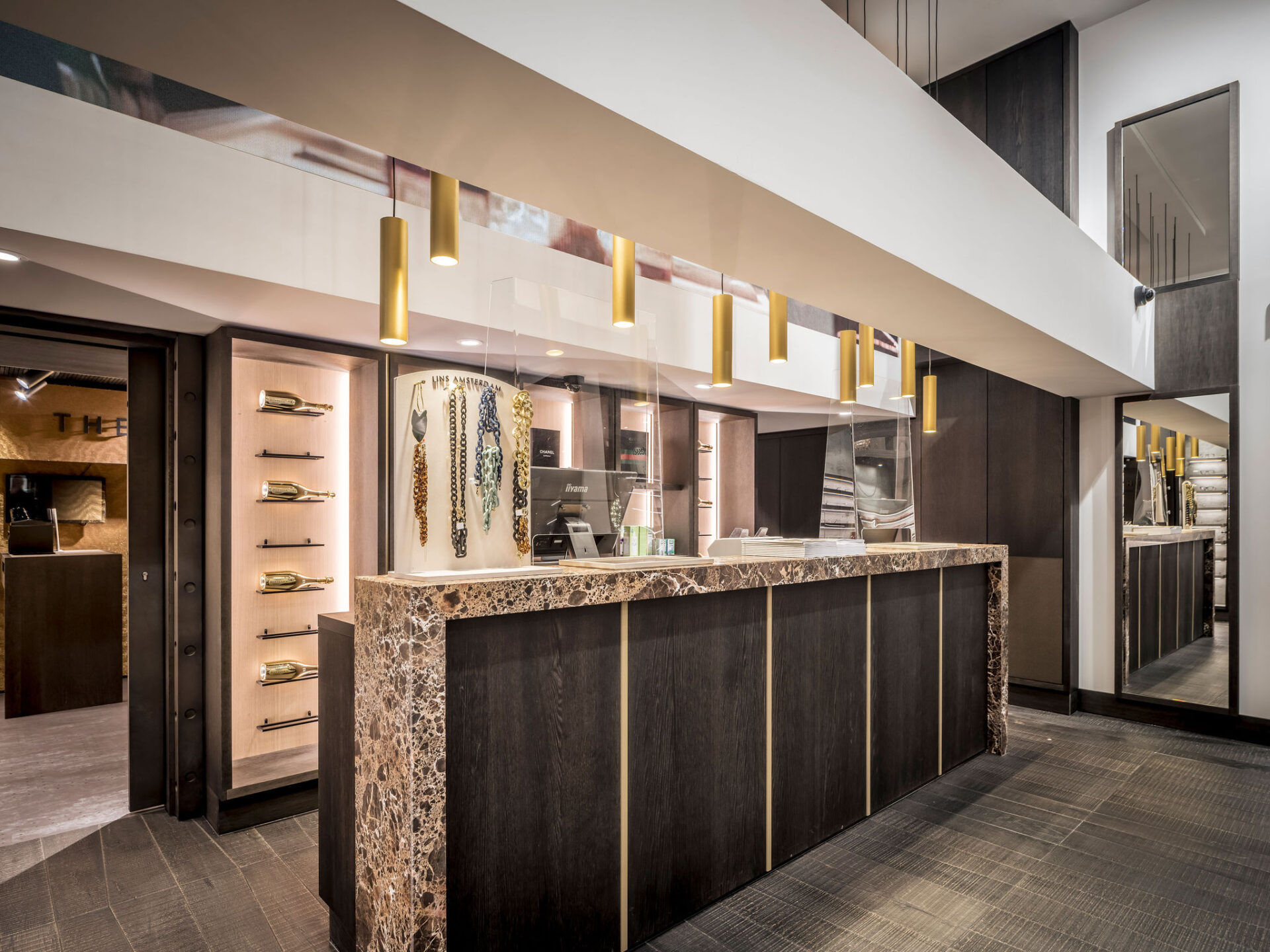 Rapper, mit dem Feeling einer internationalen Hotellobby’. Nun, der Ladenbau des Optikers ist uns gelungen: Mit Spiegeln und Goldtapeten von Elitis strahlt Ihnen schon beim ersten Schritt über die Schwelle eine Welt aus Gold und Diamanten entgegen. Über der mit Marmor und Leder veredelten Theke hängt ein breiter LED-Bildschirm. Die Treppe ist vollständig in die mehr als 5 Meter hohe Spektakelwand integriert. Das Spitzenstück findet ihr ganz hinten im Shop: The Vault! Die dicke Tresortür gibt Zugang zur Goldbarrenwelt und dort ist nur ein Wort möglich: Wow!