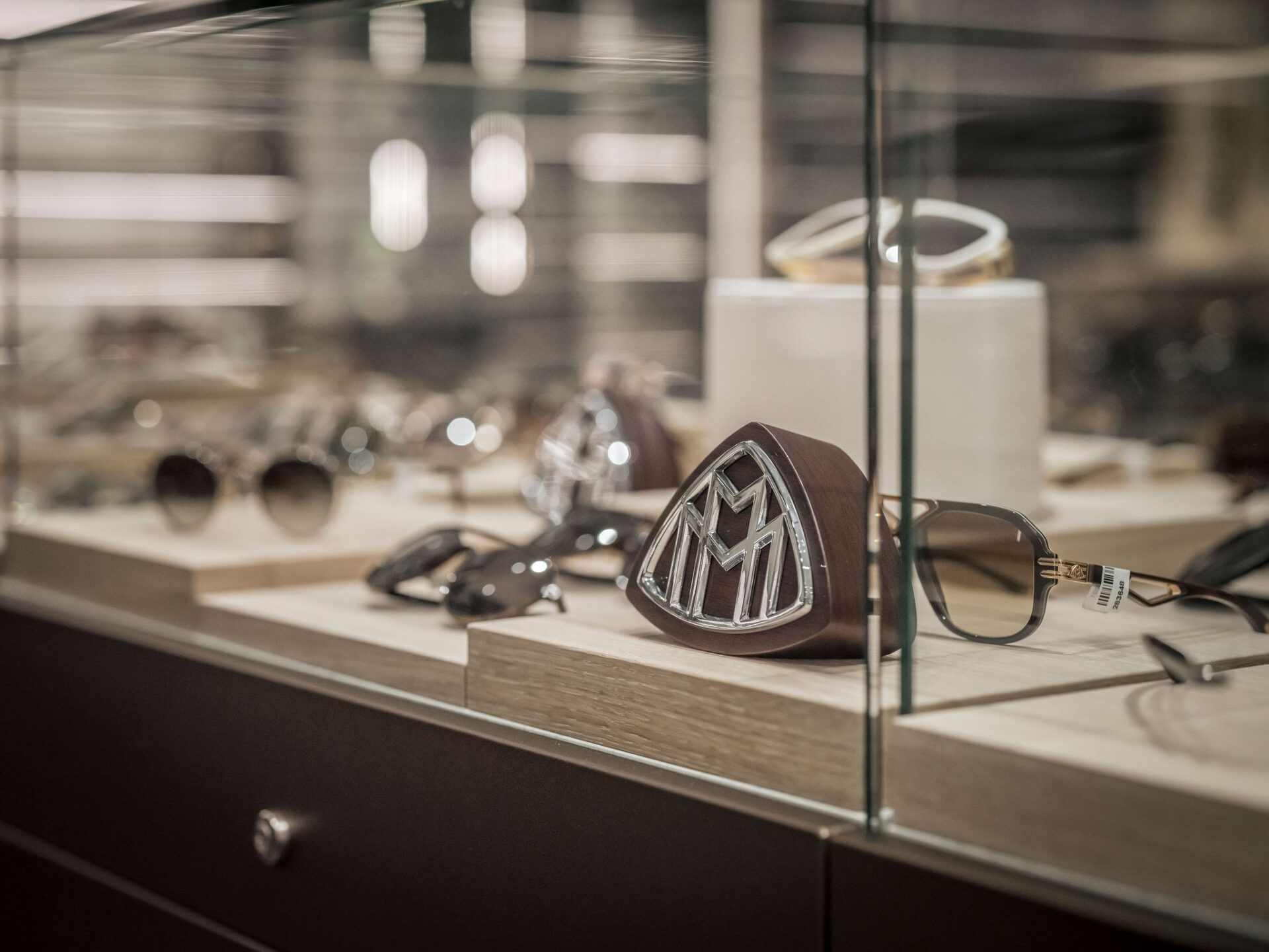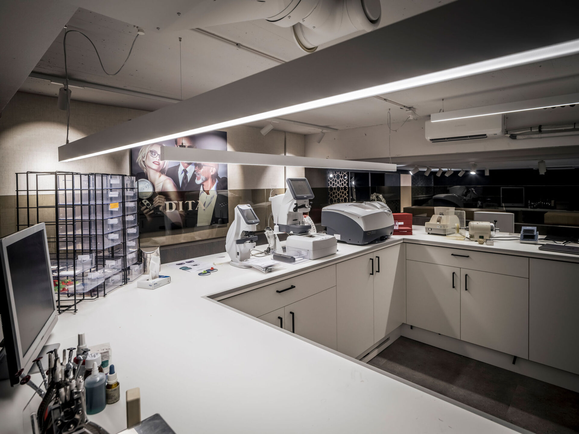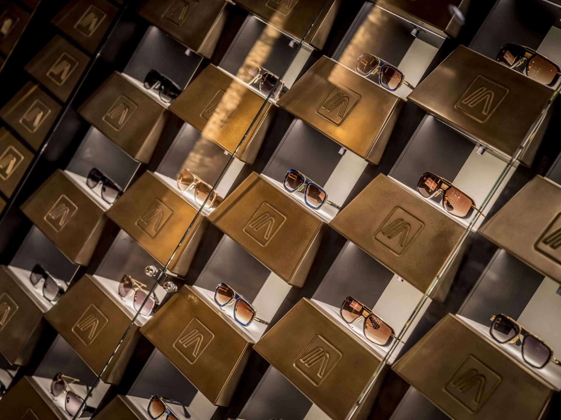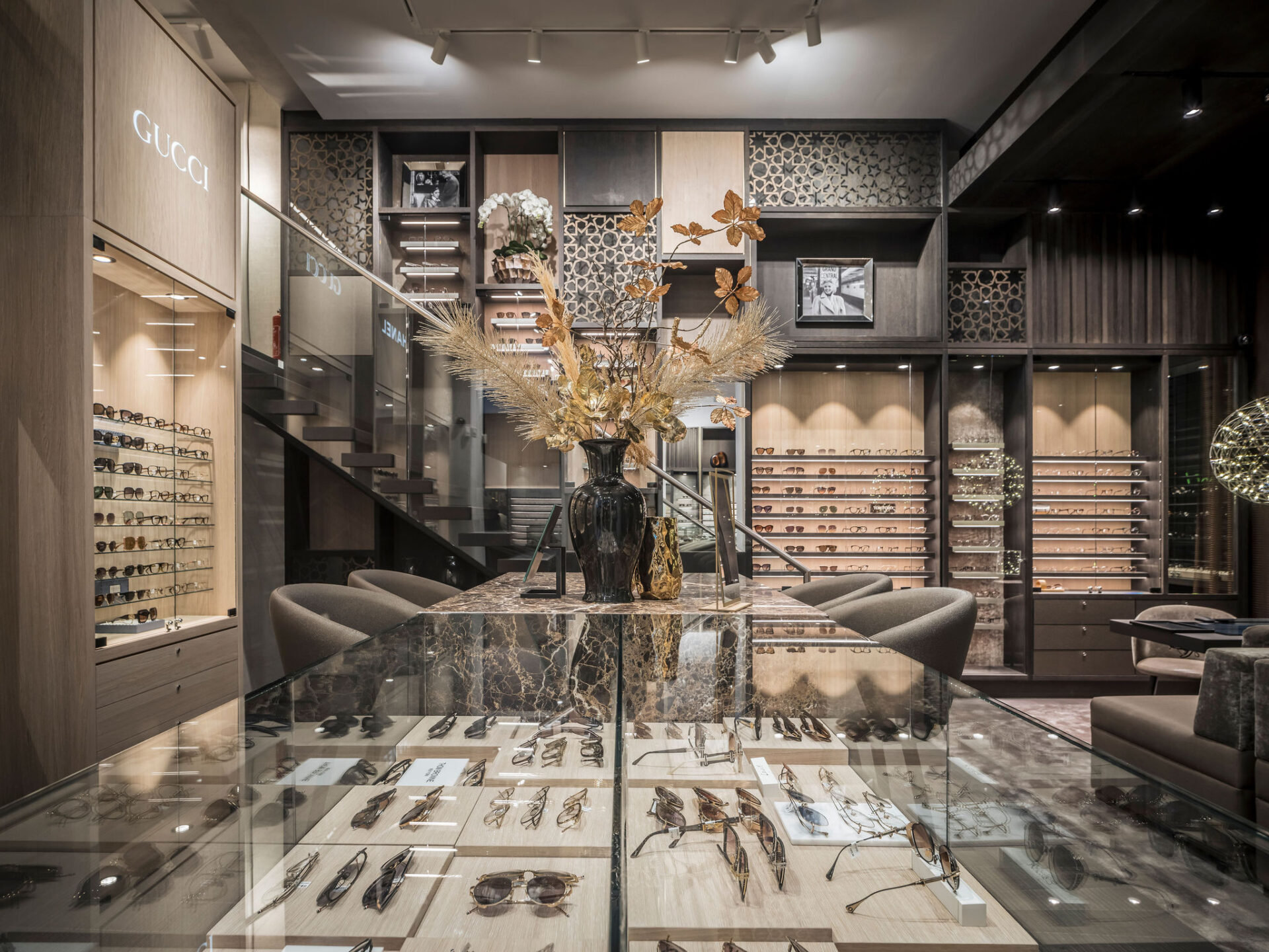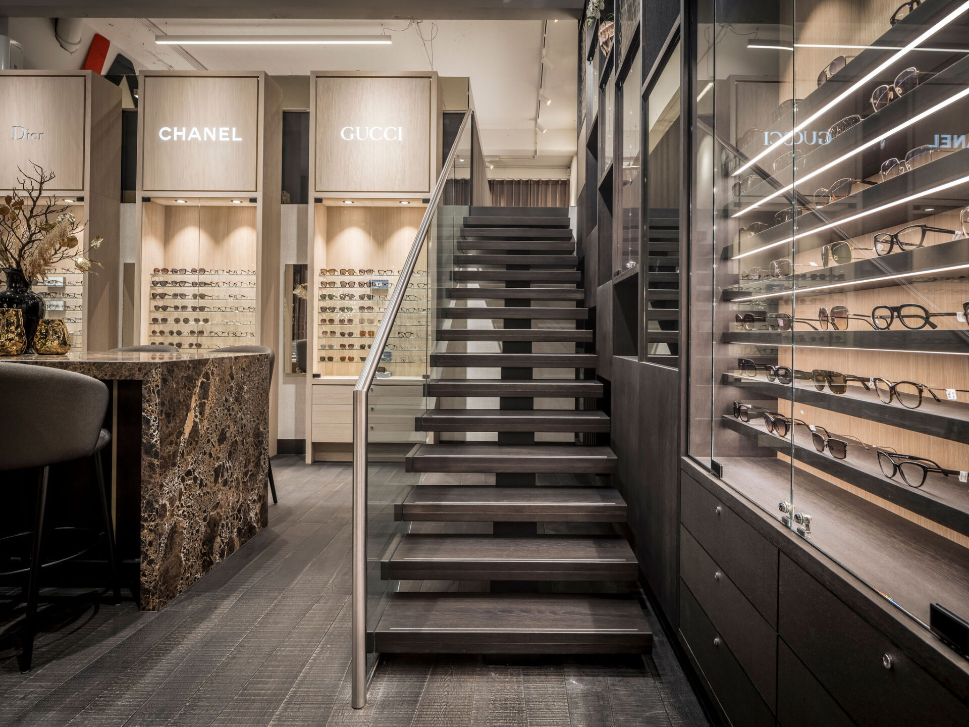 Rapper, mit dem Feeling einer internationalen Hotellobby’. Nun, der Ladenbau des Optikers ist uns gelungen: Mit Spiegeln und Goldtapeten von Elitis strahlt Ihnen schon beim ersten Schritt über die Schwelle eine Welt aus Gold und Diamanten entgegen. Über der mit Marmor und Leder veredelten Theke hängt ein breiter LED-Bildschirm. Die Treppe ist vollständig in die mehr als 5 Meter hohe Spektakelwand integriert. Das Spitzenstück findet ihr ganz hinten im Shop: The Vault! Die dicke Tresortür gibt Zugang zur Goldbarrenwelt und dort ist nur ein Wort möglich: Wow!