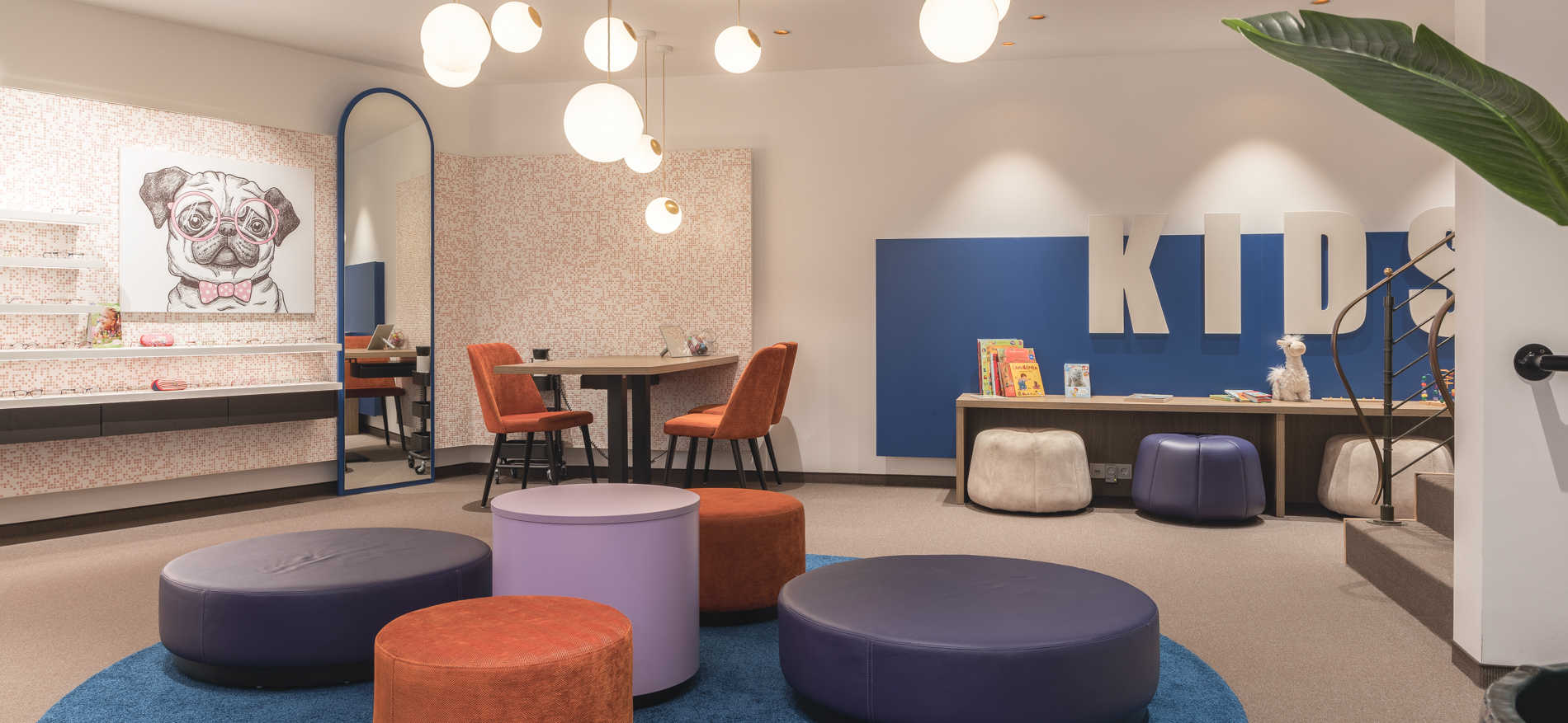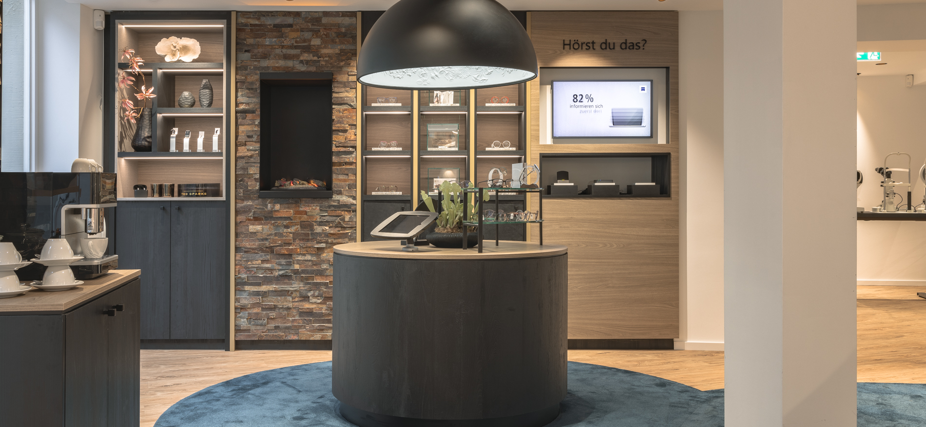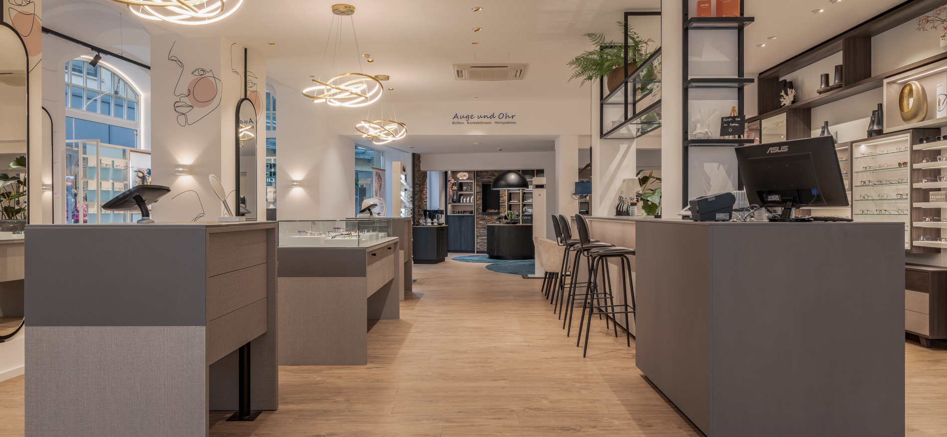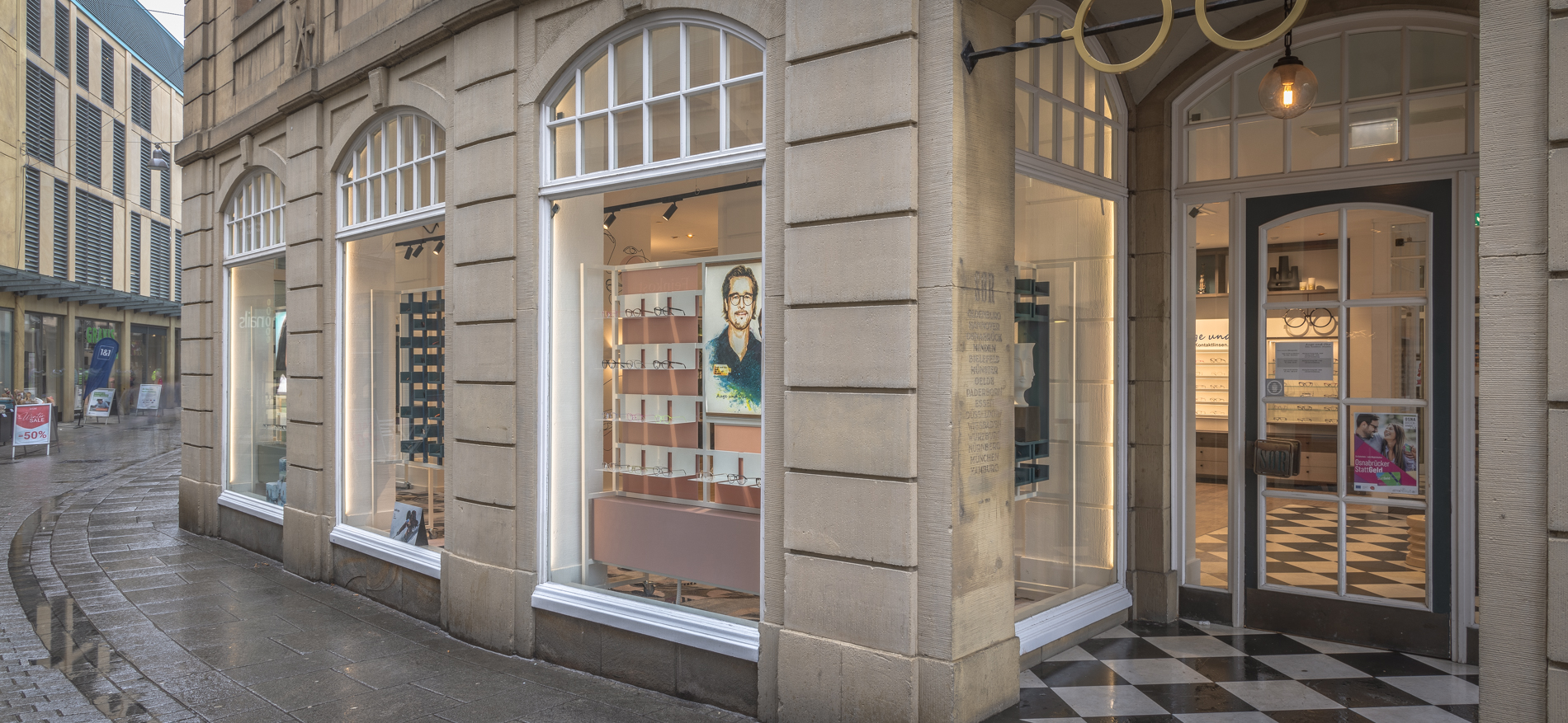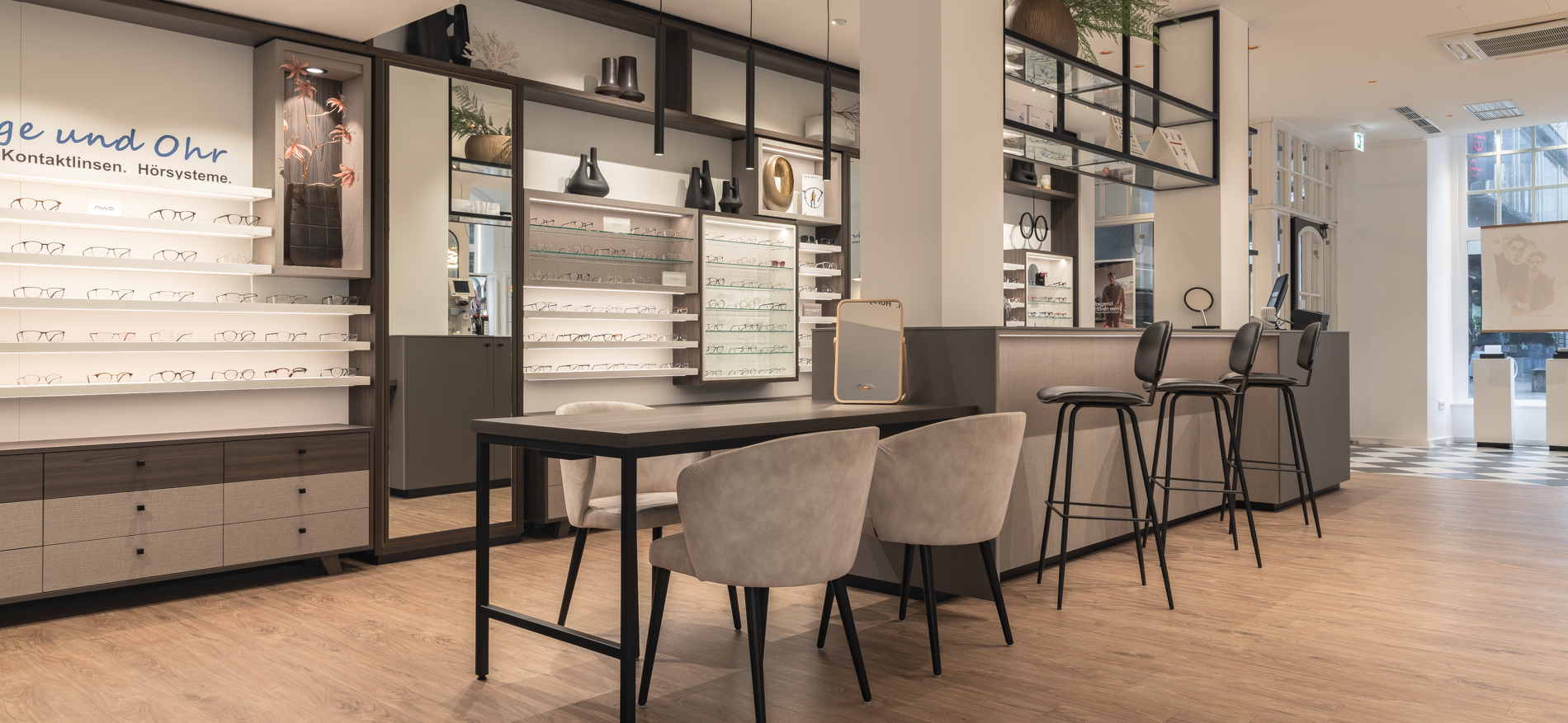 Das ist die Geschichte von Thomas Wolherr, als WSB ins Bild kommt, um die Möglichkeiten zu besprechen. Fantastische Lage und Oberfläche, wo Sehen und Hören beide ungeteilte Aufmerksamkeit erhalten. Jung, modisch und hochwertig sind Schlüsselwörter im Briefing. Die Kinderabteilung sollte nicht vergessen werden. Die physische Situation des Gebäudes wurde gut genutzt. Die jüngere Brillenpräsentation ist sehr schön im Erker (dort wo früher eine Fußgängerzone war) untergebracht.
