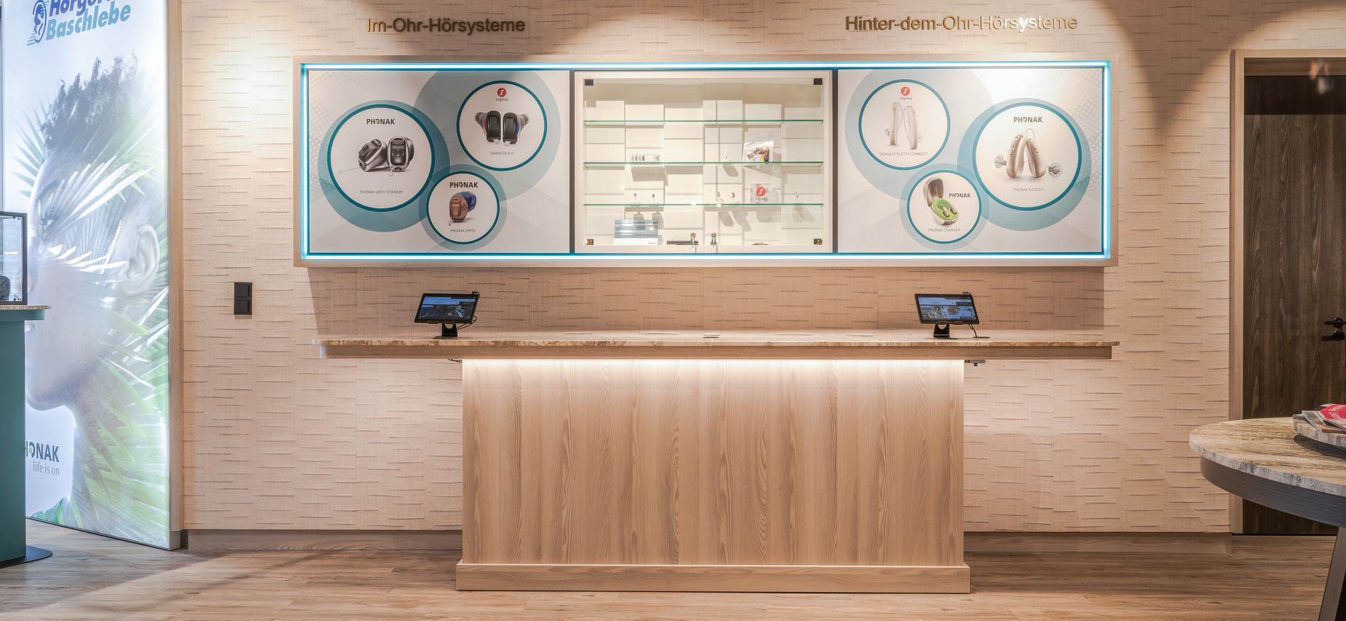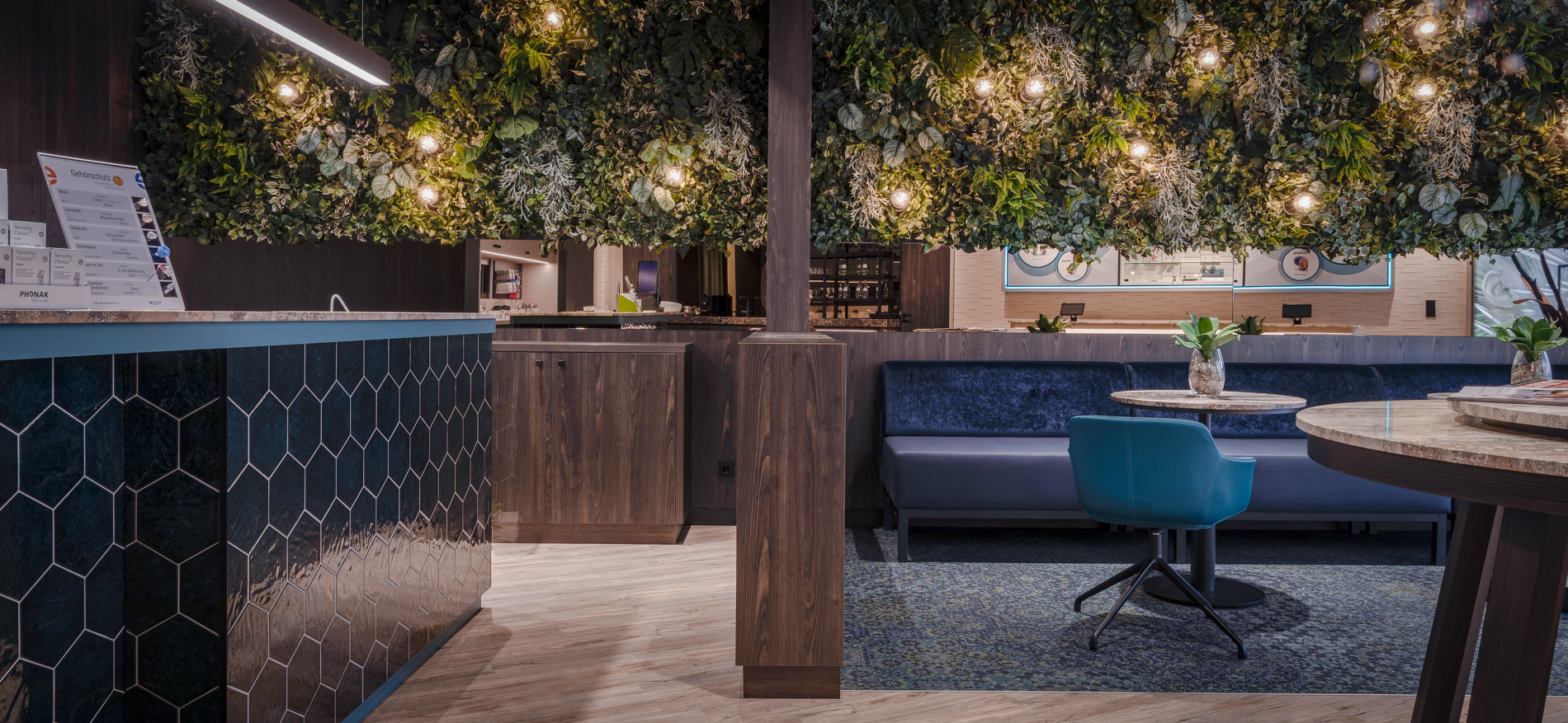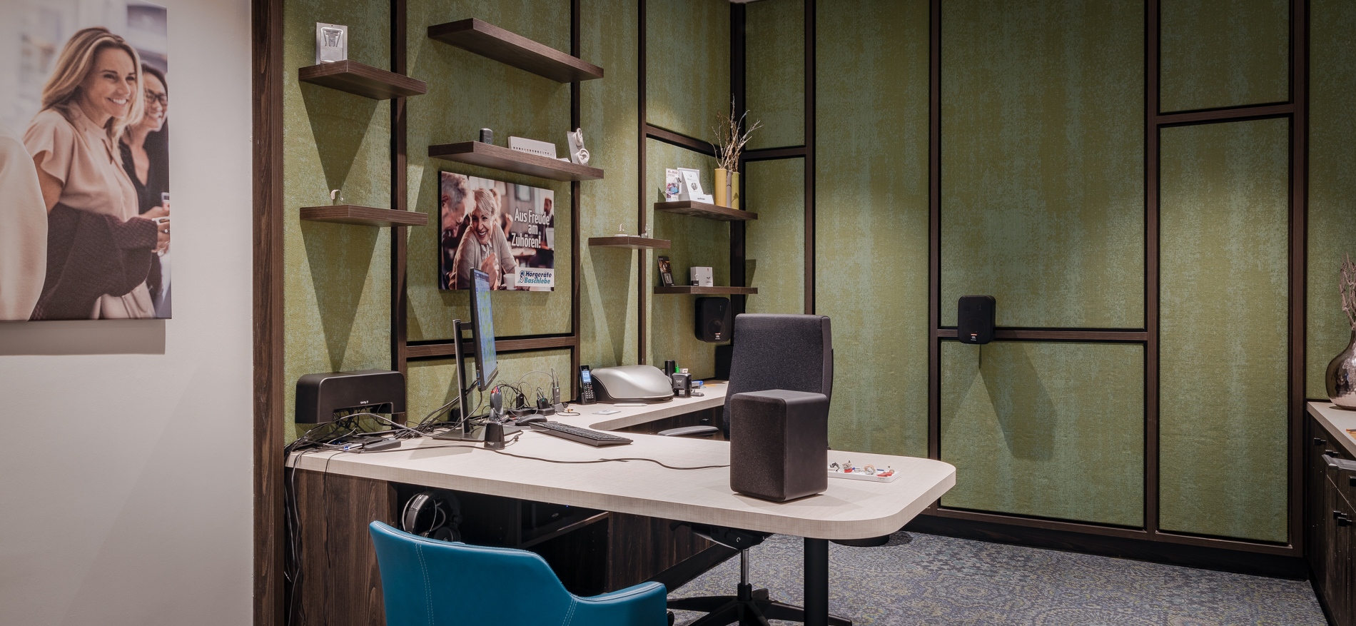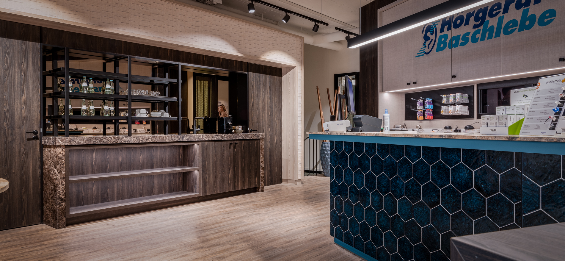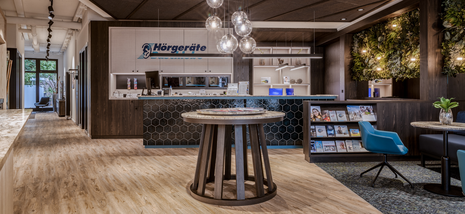 Ein sehr wichtiger Punkt, dem viel Aufmerksamkeit geschenkt wurde, ist die Akustik. Durch das Anbringen von schalldämpfenden Materialien an Böden, Wänden und Decken ist die Atmosphäre für Menschen mit eingeschränktem Hörvermögen großartig. Das steigert das Wohlbefinden und erhöht zusammen mit der zeitgemäßen Hotellobby-Atmosphäre auch die Aufenthaltsdauer. „Schöne warme Materialien, die auch noch hip und bunt sind, das will ich“, sagte Carsten Baschlebe im Aufnahmegespräch. Auch die Möglichkeit, den Garten in den Store einzubeziehen, haben die Designer von WSB mit Freude und Sinn fürs Detail in das Konzept aufgenommen. Eine schöne Kaffeebar mit warmem Naturstein und Holz sorgt für den einladenden Touch. Die medizinischen Hörsäle sind ansprechend als Wohnzimmer eingerichtet. Im Wohngartenraum besteht die Möglichkeit zum Ausprobieren und Üben mit Ton- und Filmerfahrung.