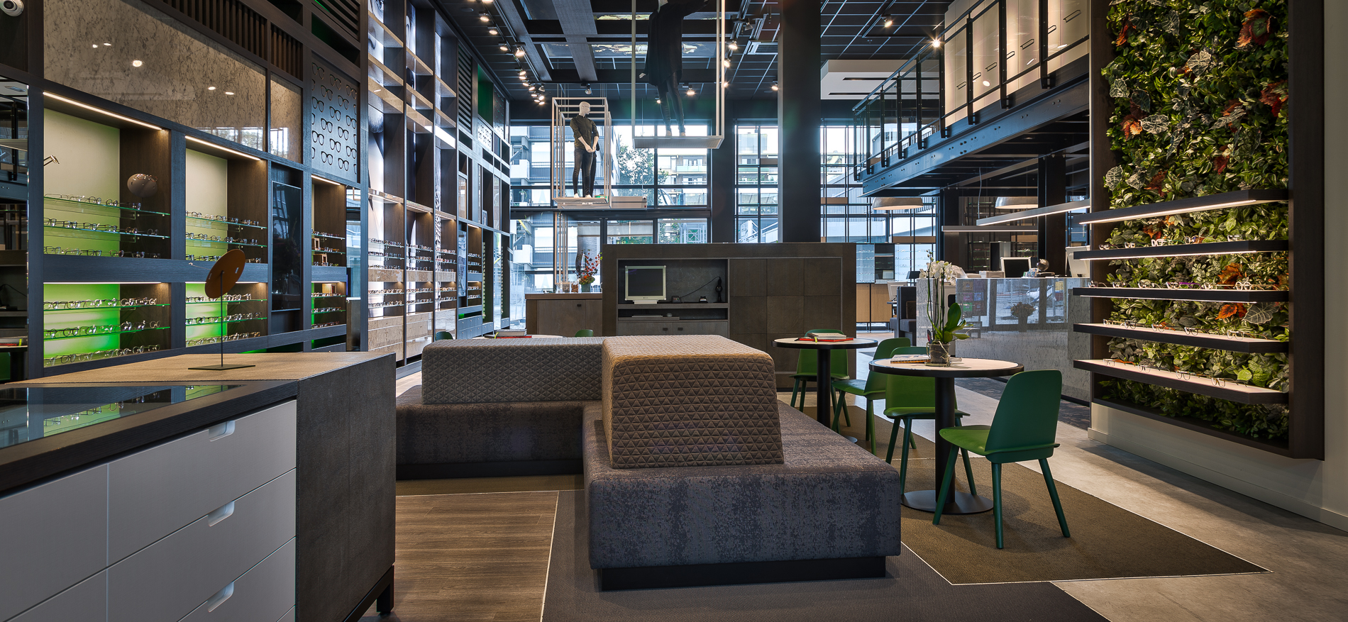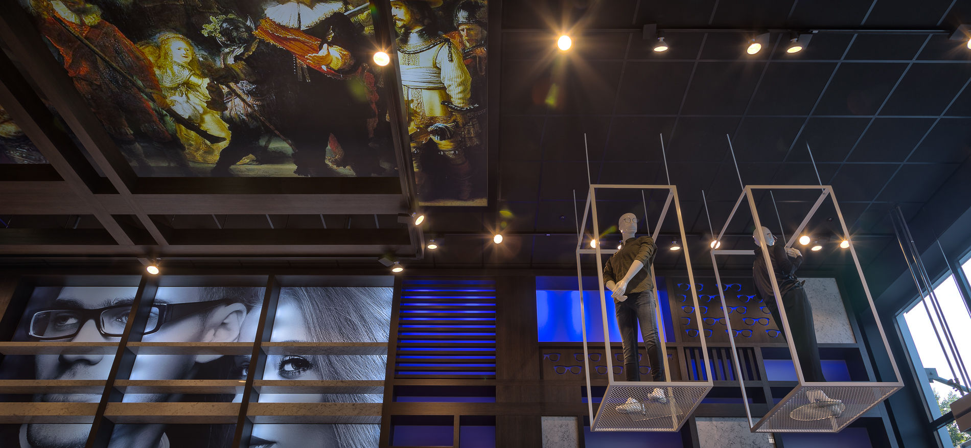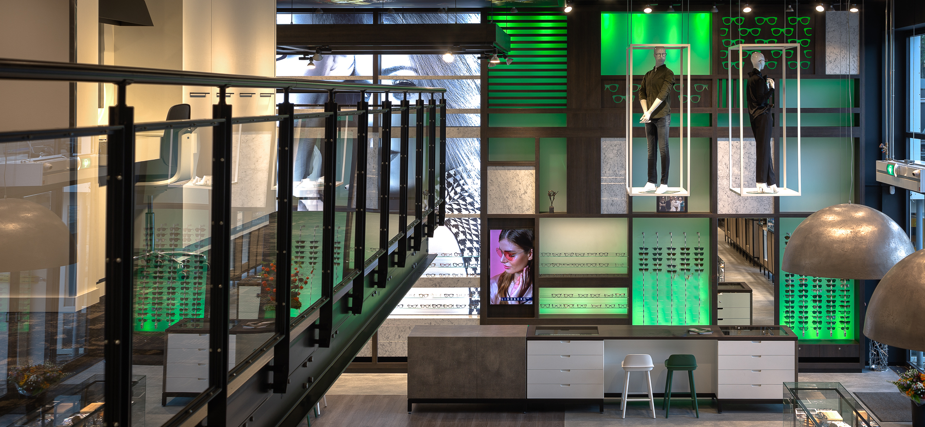 Mit Grün im Ladeneinrichtung und den berühmten alten Meistern, die aus der Raumfahrt auf die Meisterzunft der Optikbranche aufpassen. Groenhof ist der Spezialist für schöne Brillen, gute Maße und superfreundliche Bedienung über Tage bekannt. Das Design des Ladens will die Kunden überraschen und die Aufenthaltsdauer verlängern.