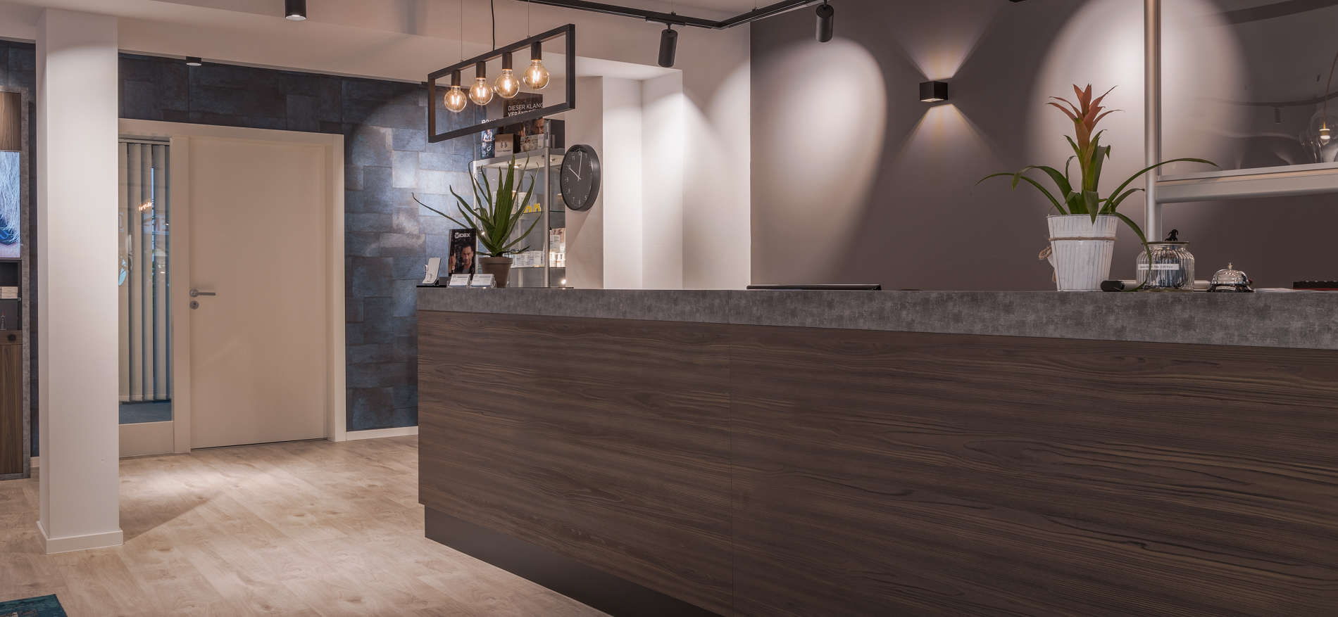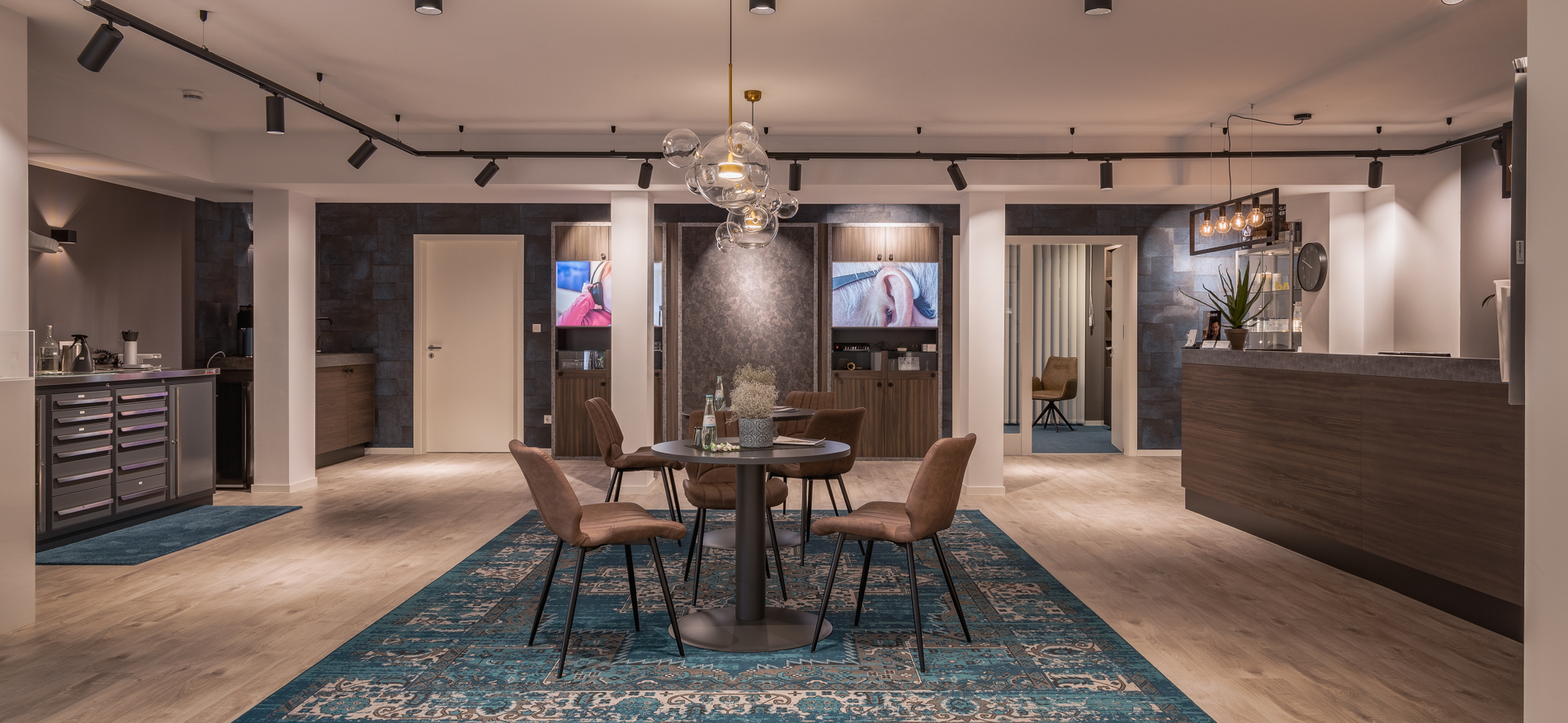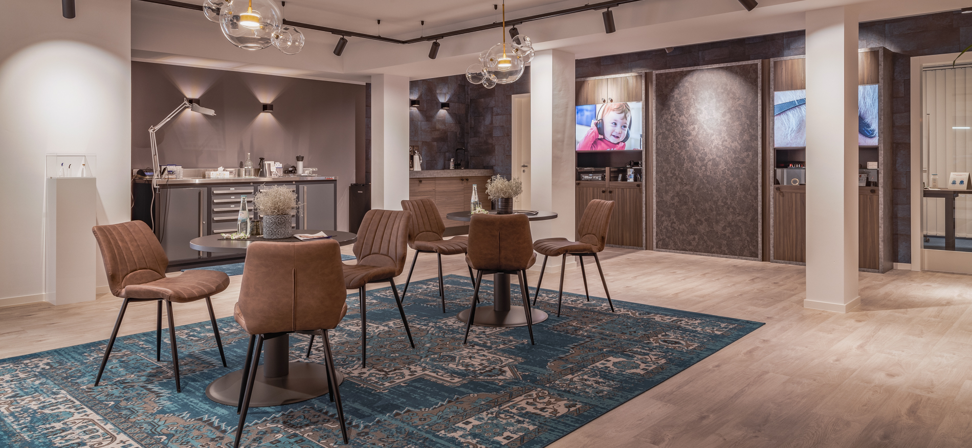 De uitdaging voor WSBDesign.com zat vooral in de budgettaire randvoorwaarde. Hoe creëer je een warme moderne sfeer binnen de gestelde kaders? Elke en Ralf zijn dol enthousiast en gelukkig met de reacties van de klanten en het werkplezier wat de nieuwe ruimte geeft. Een royale verkoop-oriëntatie ruimte met een prachtige grote hoor-aanpasruimte waar met de modernste technieken metingen gedaan kunnen worden. De sfeer met warme en heldere houttonen wordt kleurrijk gemaakt met aqua blauw in het kleed op de vloer en de wandbekleding van Elitis. “Job done” tevreden klant, zie ook de review van Elke en Ralf.