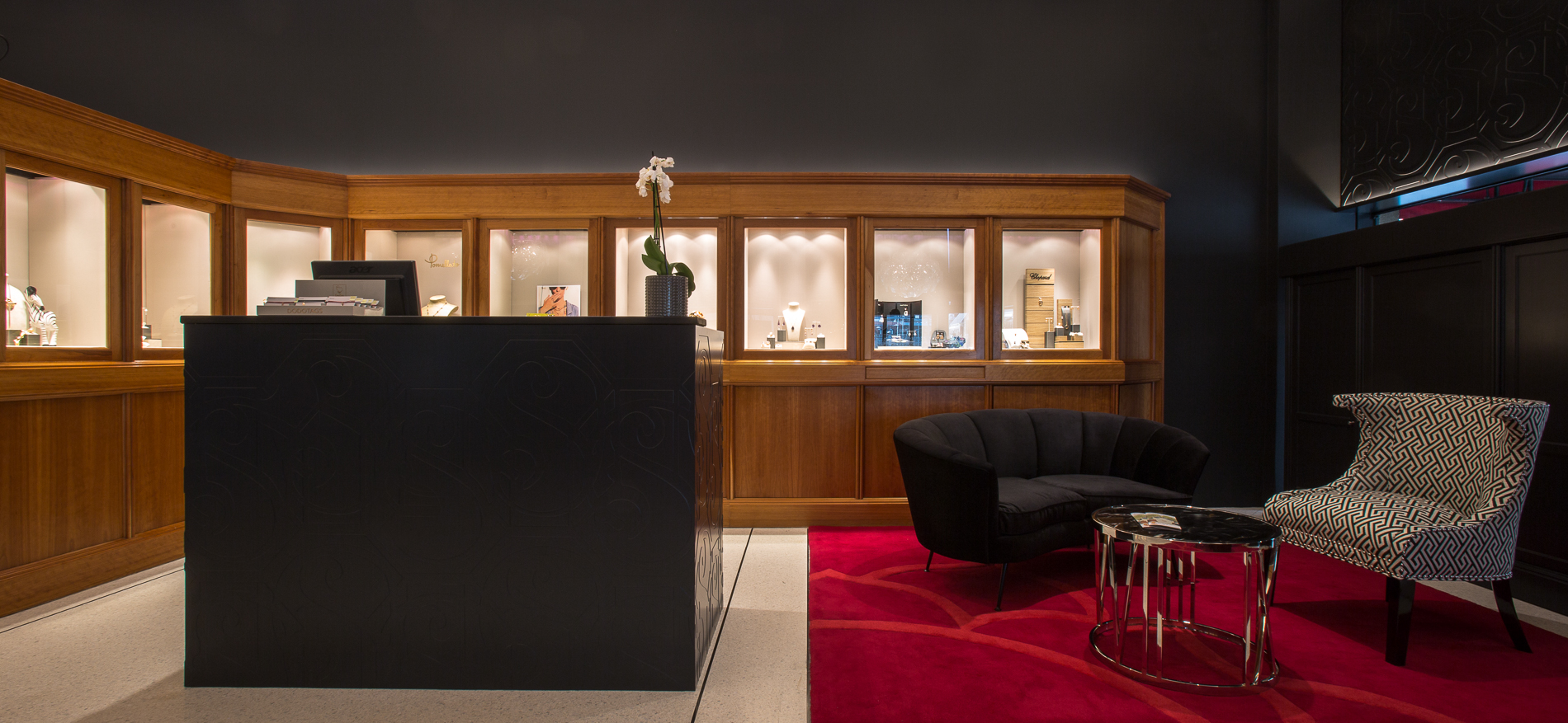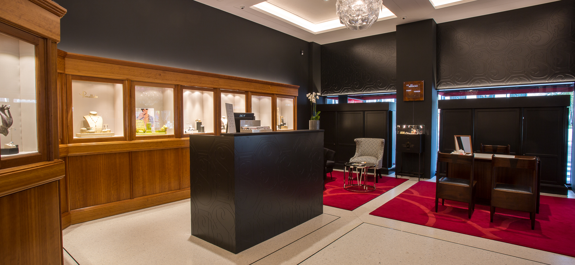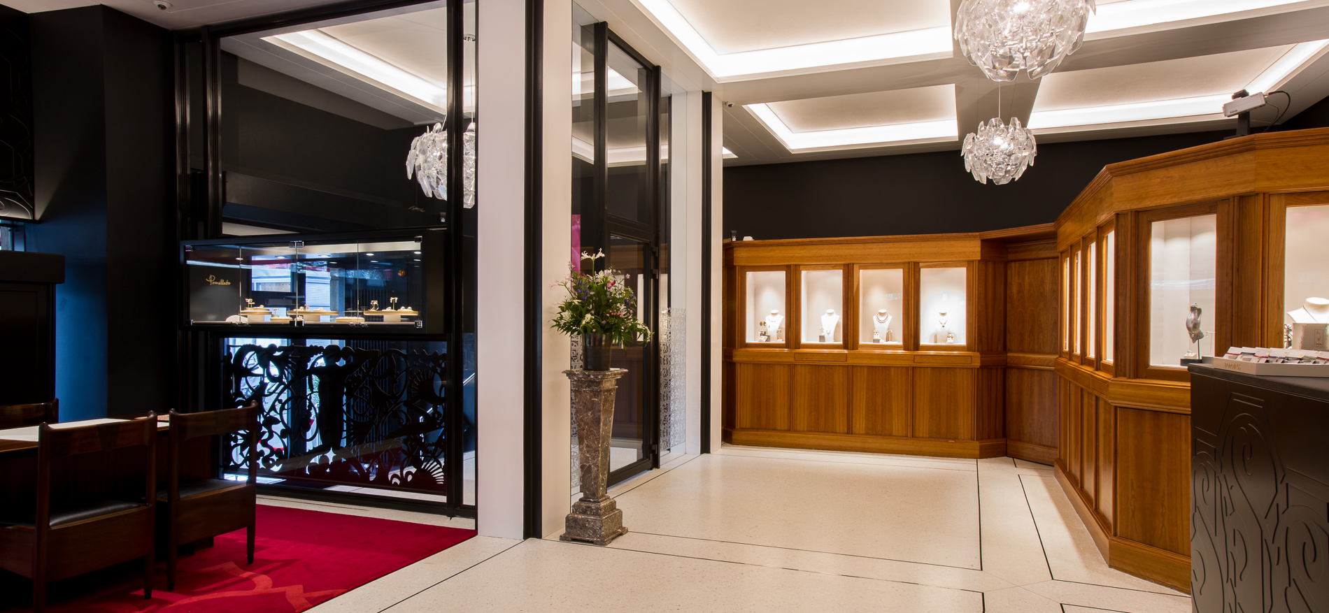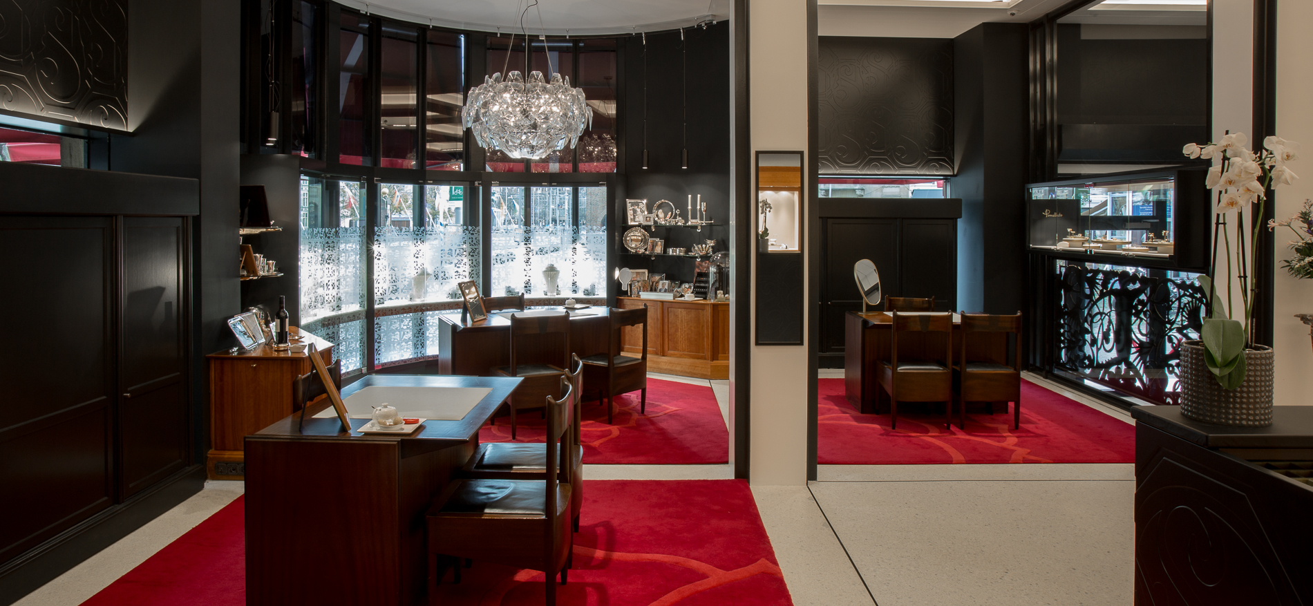 Unter den Schichten des alten Bodenbelags hat man auch den alten Originalfußboden entfernt und restauriert. Der Entwurf der Vitrinen im Laden wurde stilvoll angepasst und konsequent durchgeführt. Neue Teppiche und Lounge-Elemente sind hinzugekommen.