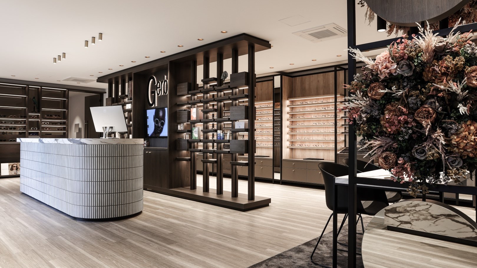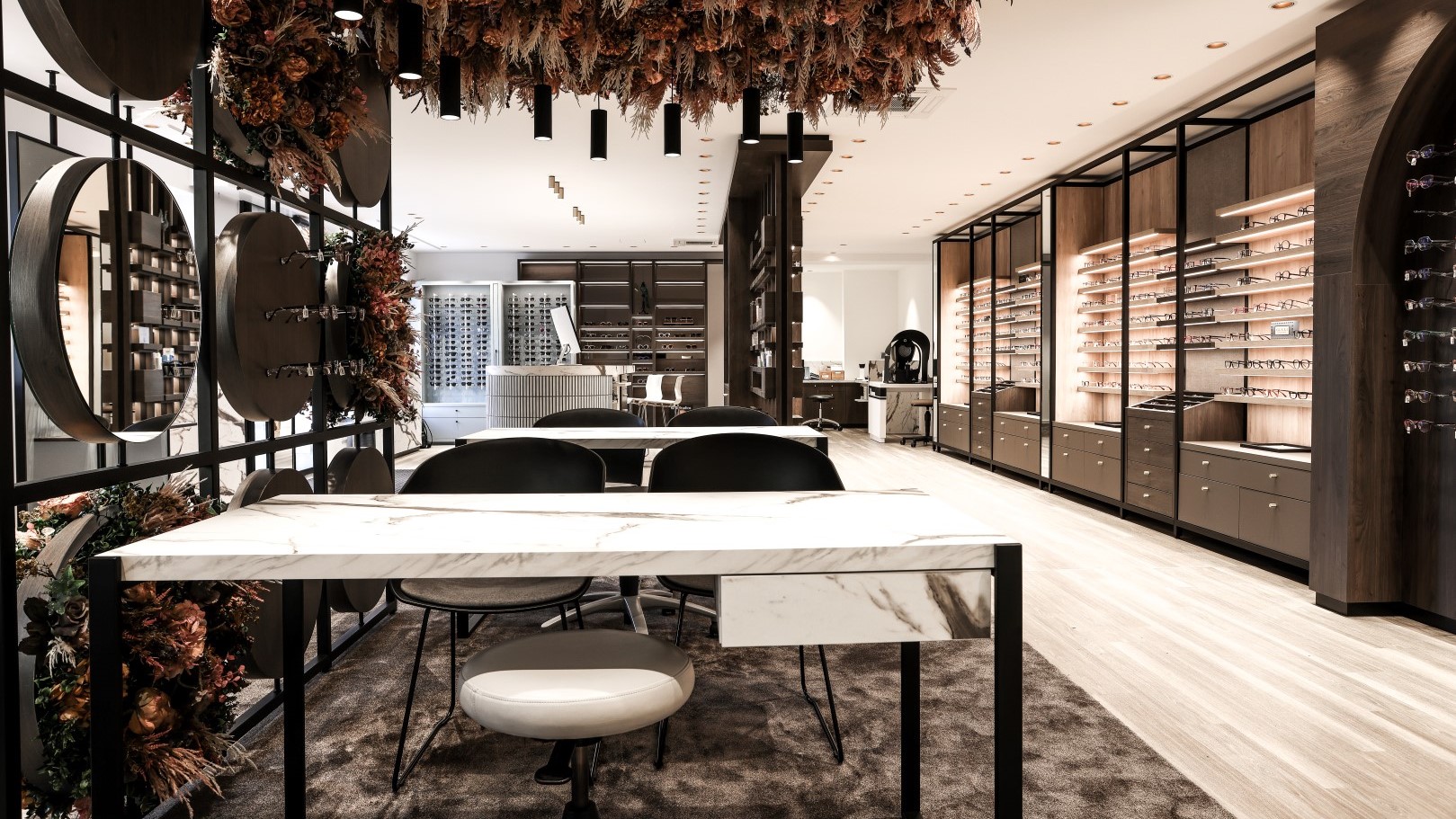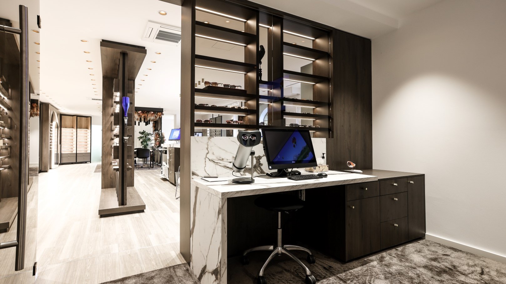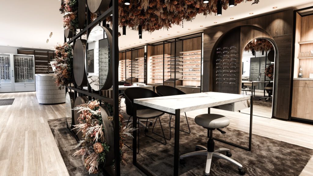 Der komplette Laden sollte auf den Prüfstand: Postionierung von Refra-Raum, Präsentationflächen, Beratungsbereiche und Wartezone, aber auch die Innenausbau wie Form, Materialien und Farben. Nach der Erstellung eines völlig neuen Optik Konzeptes wurde WSB Ladenbau dann auch mit der Durchführung beauftragt und in Koopertation mit ortsansässingen Gewerken in einem optimalen Zeitfenster realisiert. Dunkle Hölzer, warme Farben und eine Marmoroptik, dazu ein auf die Warenpräsentation abgestimmtes Lichtkonzept. Ein florales Deckenfeld über den Beratungstischen ist ein echter Blickfang!