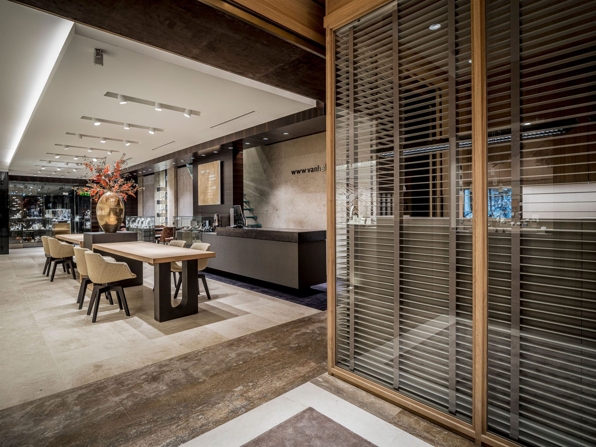 Im Einklang mit der bestehenden Ladeneinrichtung, in der der Natursteinboden und das Coromandel-Holz eine dominierende Rolle spielen, hat man sich dafür entschieden, den neuen Teil des Ladens anders, aber komplementär mit einem klassischeren Touch zu gestalten. Als Material wurde Naturstein verwendet (wie im vorderen Teil des Ladens), in zwei Farben kombinierbar mit dem gebürsteten Eichenholz. Die goldfarbenen Elemente in Kombination mit Visual Art Wandverkleidungen sorgen für Überraschung und Wärme. In der Trauringecke wurden die bestehenden Vitrinen renoviert und wiederverwendet. Diese kommen in einem ganz anderen Setting hervorragend zur Geltung. Wärme mit einer schönen Tapete von Arte, die auch eine akustische Funktion hat, sorgt für eine angenehme Schalldämmung.