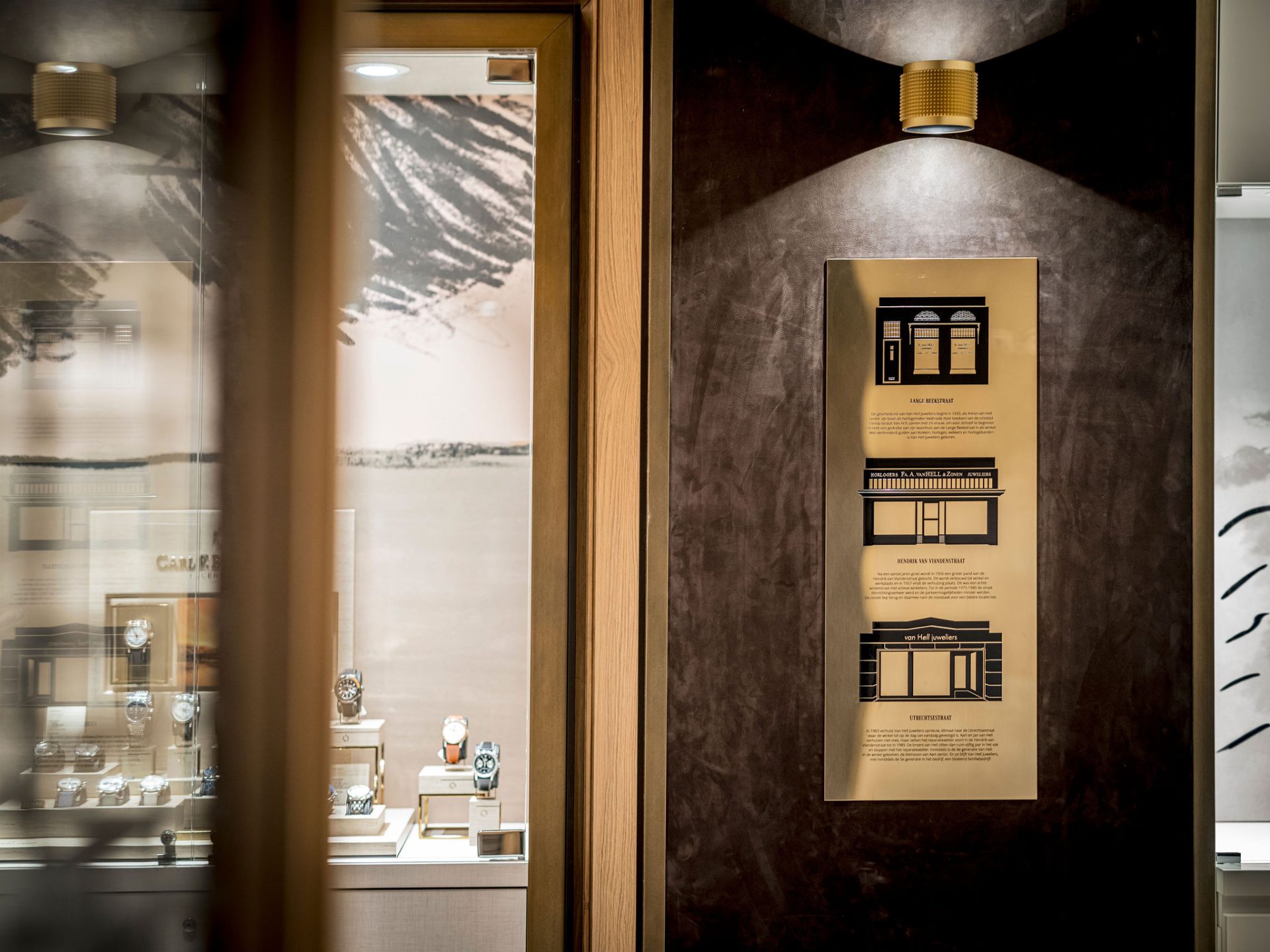 Van Hell ist seit den 1930er Jahren ein etablierter Name in Amersfoort und hat mittlerweile einen guten Ruf im Segment der Haute Couture Jewellers aufgebaut. WSB erhielt die Aufgabe, eine neue passende Ausstrahlung zu entwickeln, die der Kundschaft und der Kollektion gerecht wird. „Modern, warm und mit einem klassischen Touch“ waren die Schlüsselwörter, die maßgeblich waren für den Designprozess. Das vorhandene Budget wurde berücksichtigt, in dem der vordere Teil des (bestehenden) Ladens teilweise intakt gelassen wurde. Dieser sollte jedoch mit dem neuen Gebäudeteil verschmelzen.