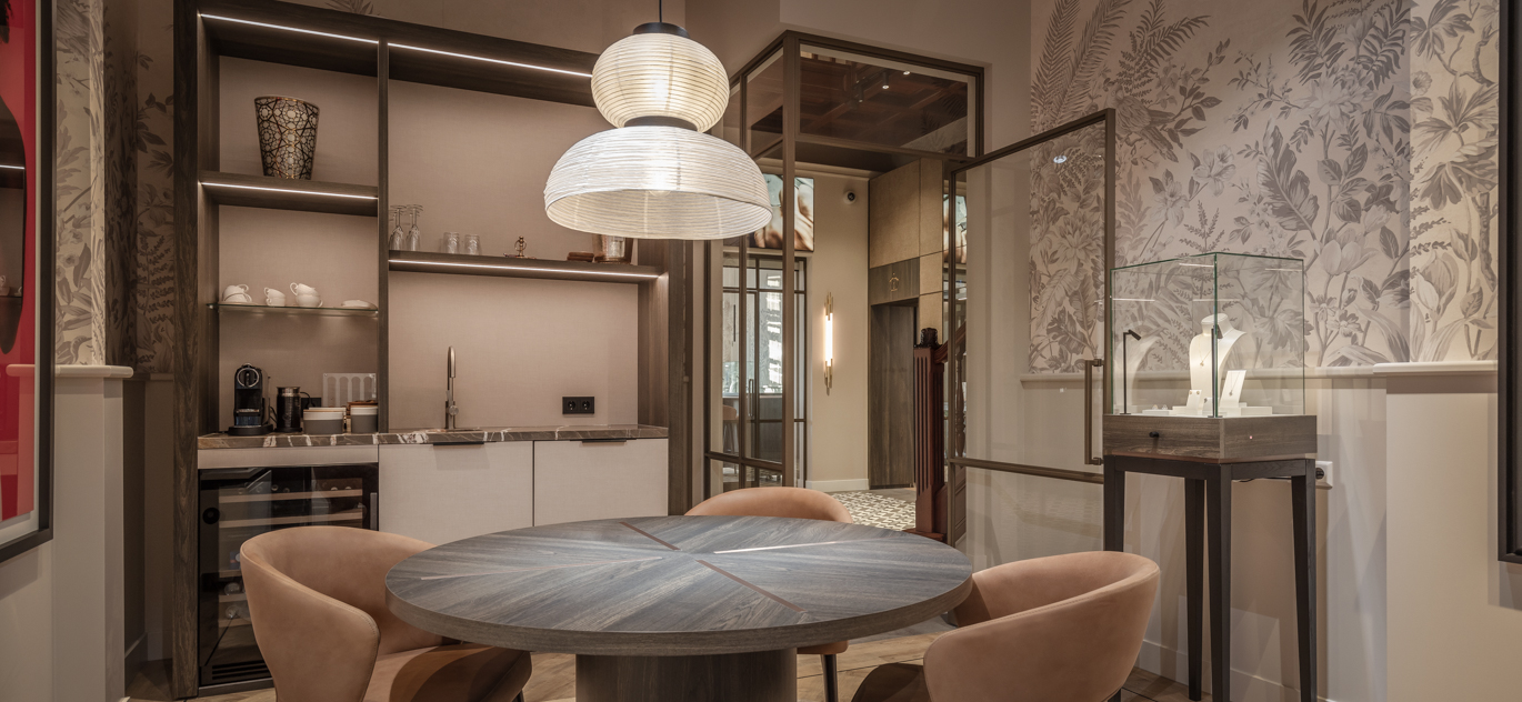 Das Ladeneinrichtung orientiert sich an der Schönheit des monumentalen Gebäudes. Warme und edle Materialien wie Élitis-Tapeten, Naturstein, Designerbeleuchtung und attraktive Kirkby-Stoffe wurden von WSB-Designern sorgfältig ausgewählt und passen zum Charakter und Niveau der Kollektion.