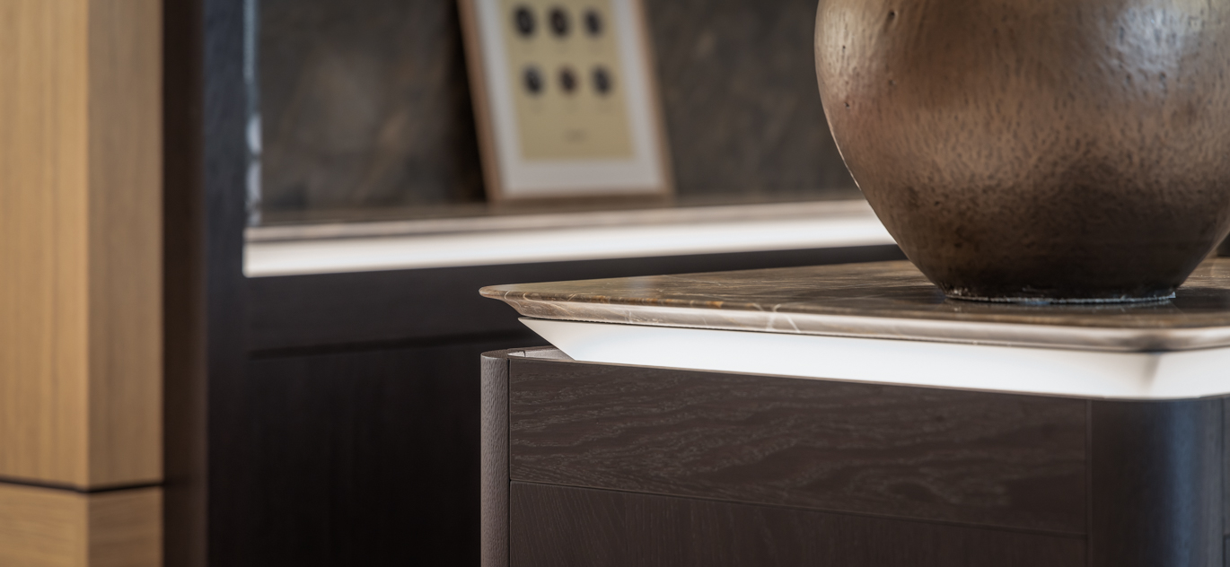 Dies wurde durch die Schaffung mehrerer Durchgänge erreicht, beispielsweise der Verbindung zwischen Omega und dem Verkaufsbereich. Die Verwendung von Materialien im gesamten Geschäft strahlt warmen Luxus aus, mit Naturstein auf dem Boden und einzigartigen Vitrinen mit Naturstein und raffinierten Details. Die Wandpaneele sind mit Akustiktapeten von Moooi ausgestattet. Die Theke verfügt außerdem über einzigartige Details, wie zum Beispiel eine integrierte LED-Beleuchtung in der Möbelplatte.