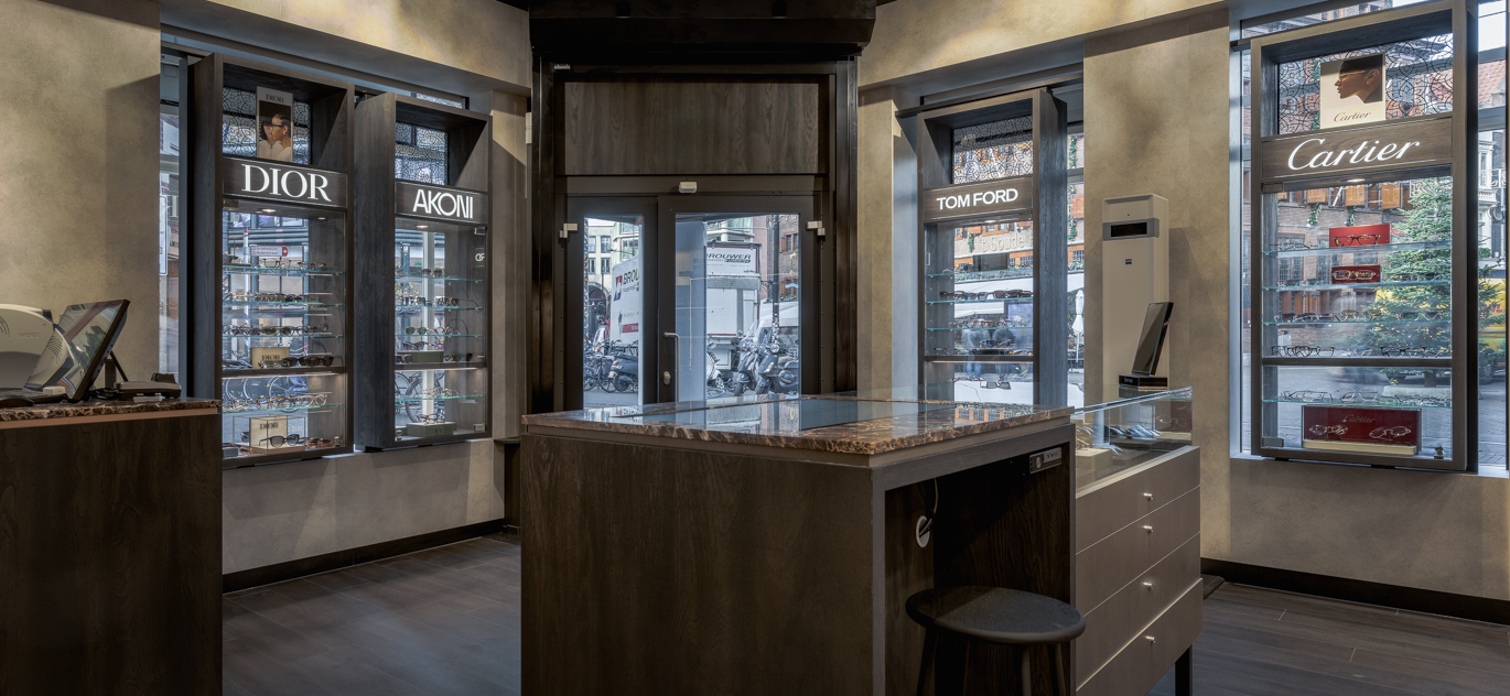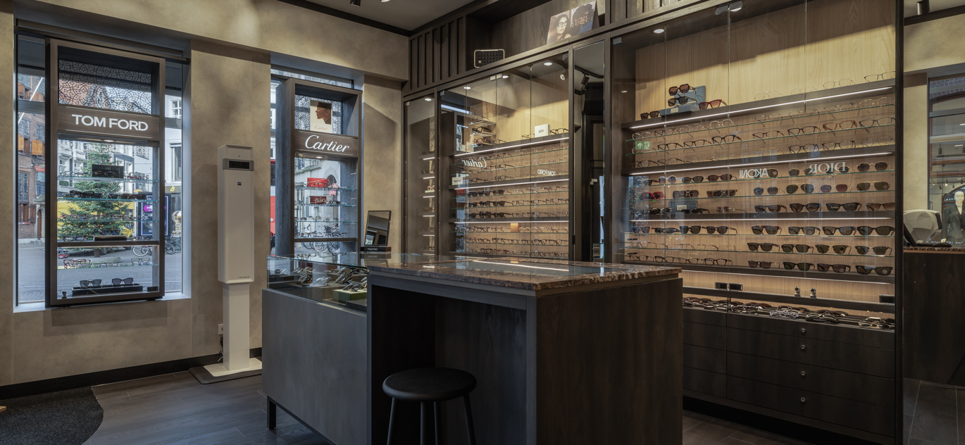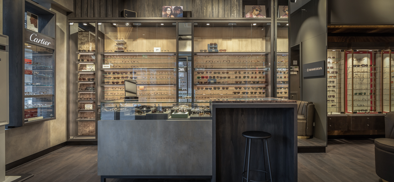 In Bezug auf Look und Feel ist es eine Weiterentwicklung des Konzepts aus Rotterdam, einschließlich des goldenen Tresors, in dem die luxuriösesten Brillen verkauft werden. Das Layout des Ladens bleibt großzügig, mit maximaler Transparenz von außen, ohne jedoch an Schaufenster- oder Präsentationsfläche einzubüßen. Im Inneren des Optikgeschäfts werden alle Brillen hinter Glastüren präsentiert. Dies sorgt nicht nur für eine luxuriöse Ausstrahlung, sondern auch für die notwendige Sicherheit der High-End-Brillenkollektion. Die Boutique ist oft sehr gut besucht, was diese Funktion unverzichtbar macht.