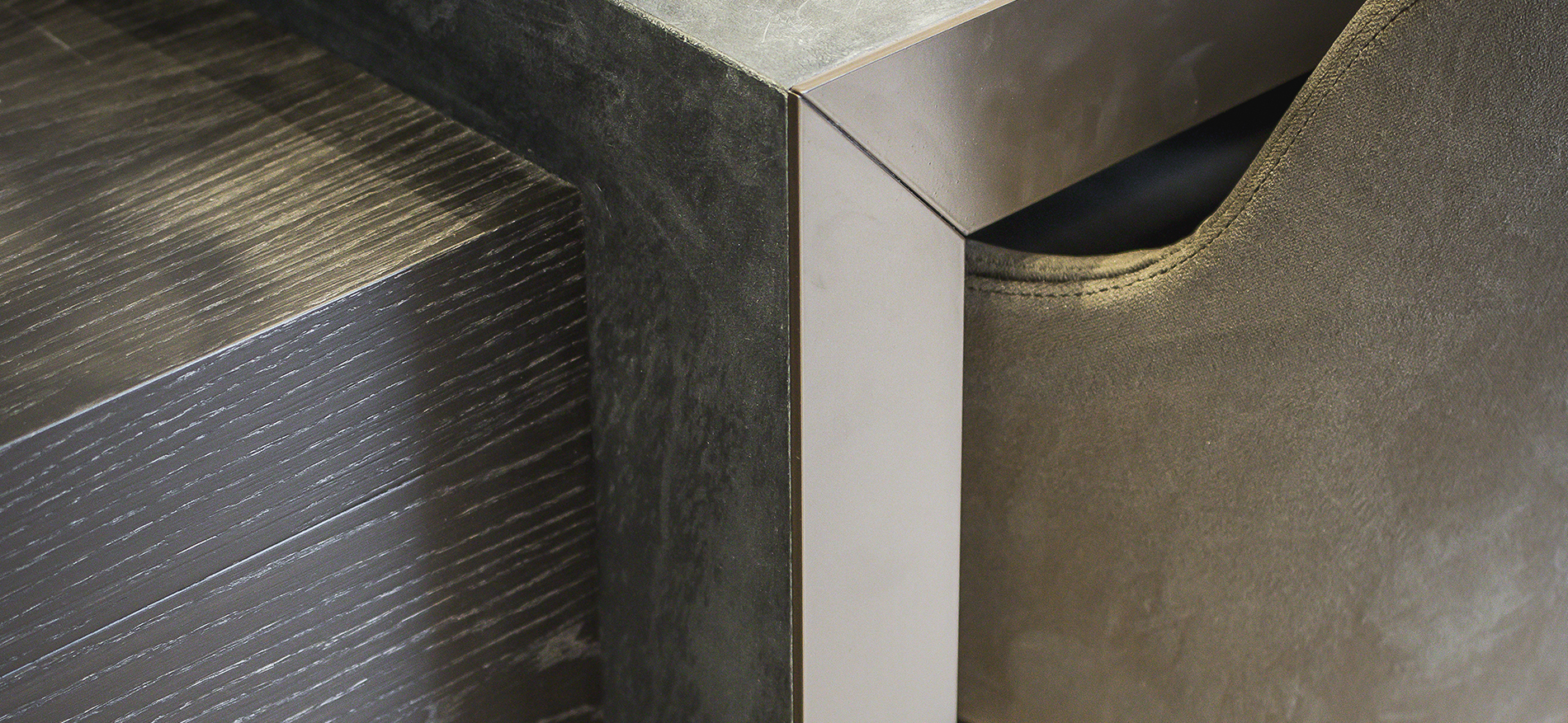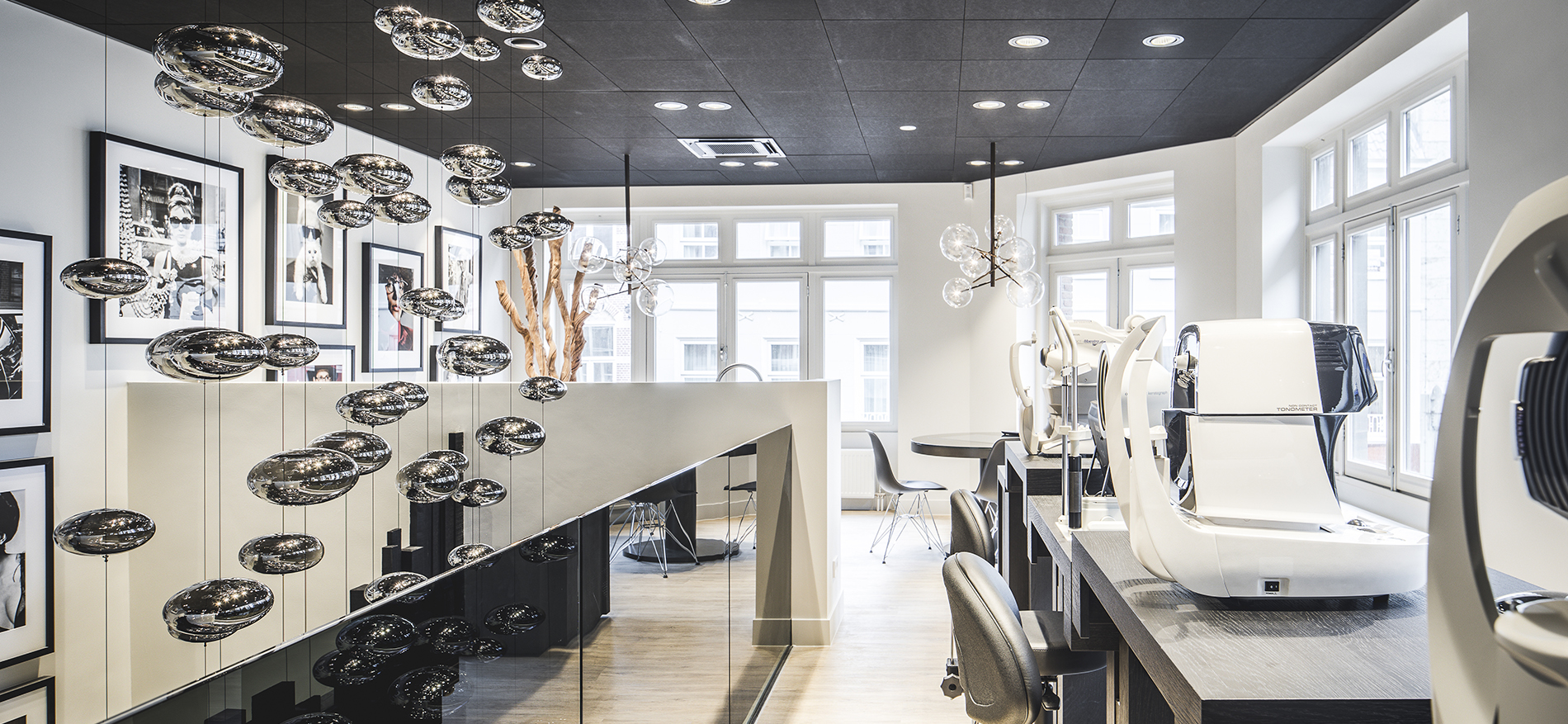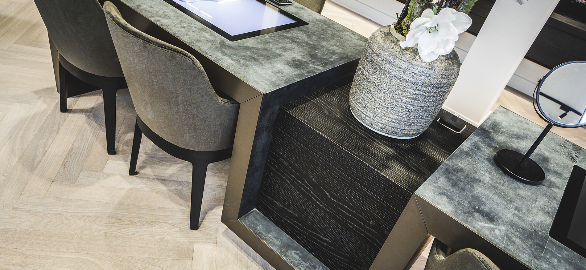 Mit Anwendungen im Innendesign aus reiner Eiche gebeizt, Naturstein, Leder und LED-Applikationen sowie glänzenden Stoffen wurde im Optikfachgeschäft ein angenehmes Ambiente geschaffen.