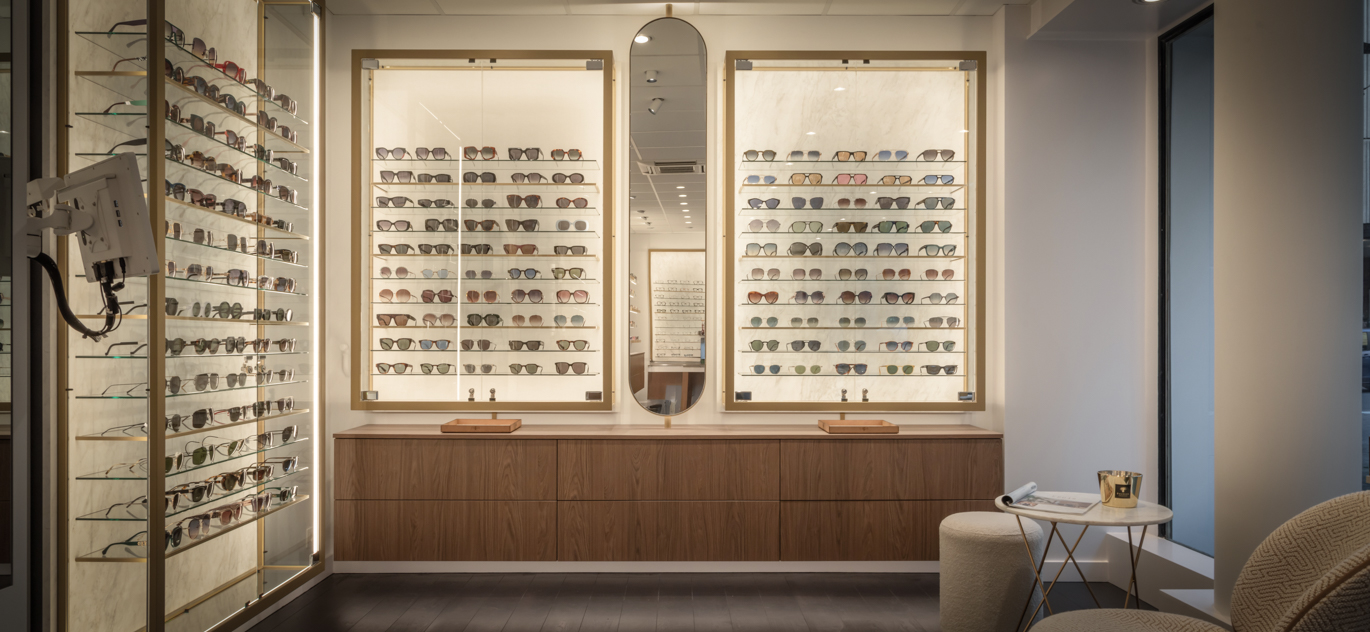 Die Sonnenbrillen und Brillen werden auf eine wunderschöne Weise in luxuriösen Vitrinen präsentiert, die ein hochwertiges Ladeninterieur verstärken. Das Ergebnis ist ein Optikgeschäft, das den Kunden ein raffiniertes und inspirierendes Einkaufserlebnis bietet. Die Wahl eines stilvollen Ladeninterieurs für dieses Optikgeschäft war eine bewusste Entscheidung, die die Qualität und den einzigartigen Charakter von Edgar Optique unterstreicht.