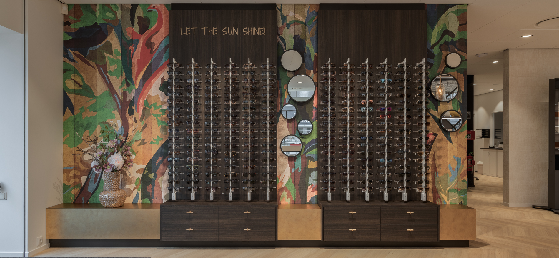 Der Einsatz von Farben ist auffällig und frivol mit vielen auffälligen Farben. Die Basis blieb jedoch warm und vermittelte eine „dörfliche“ Gemütlichkeit. Für die Brillenpräsentationen kamen beleuchtete Regale zum Einsatz, die die Brillen besonders hervorheben. Alles in allem ein sehr schönes Ergebnis. Wir sind stolz, dass wir für diese engagierten friesischen Unternehmer den zweiten Store realisieren konnten!