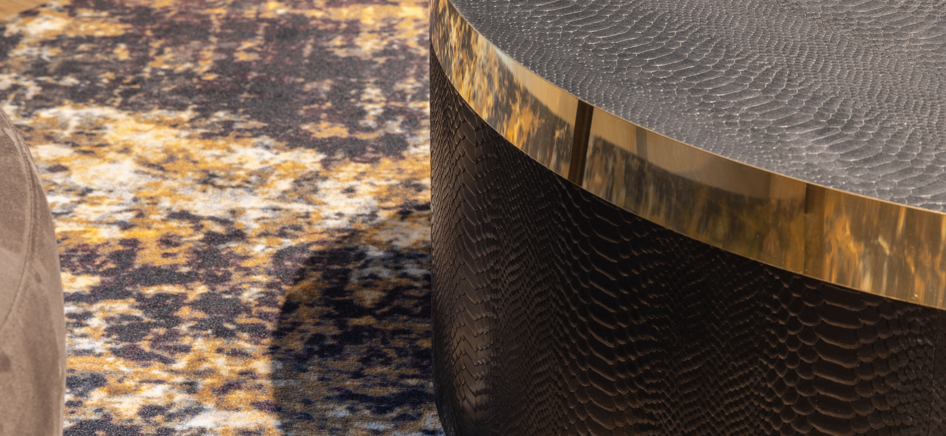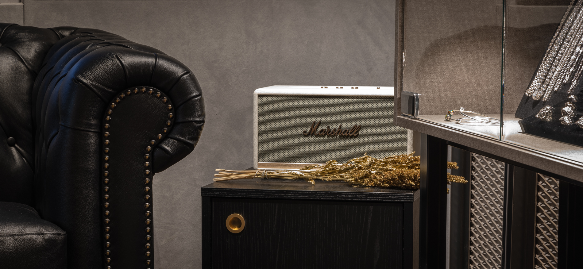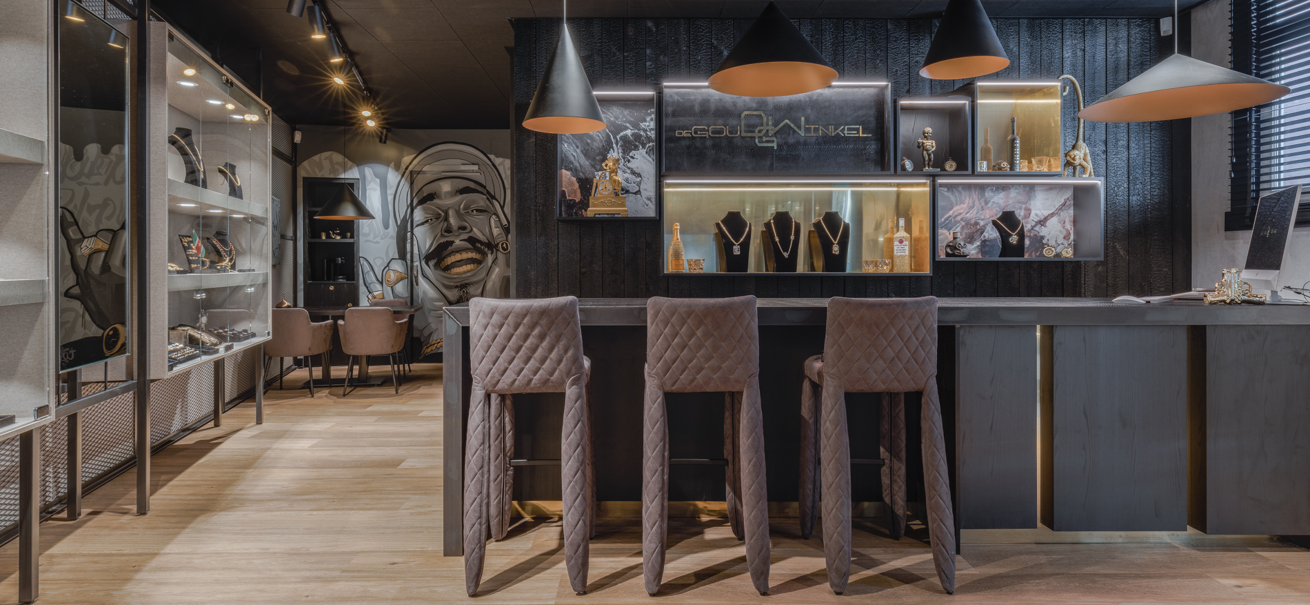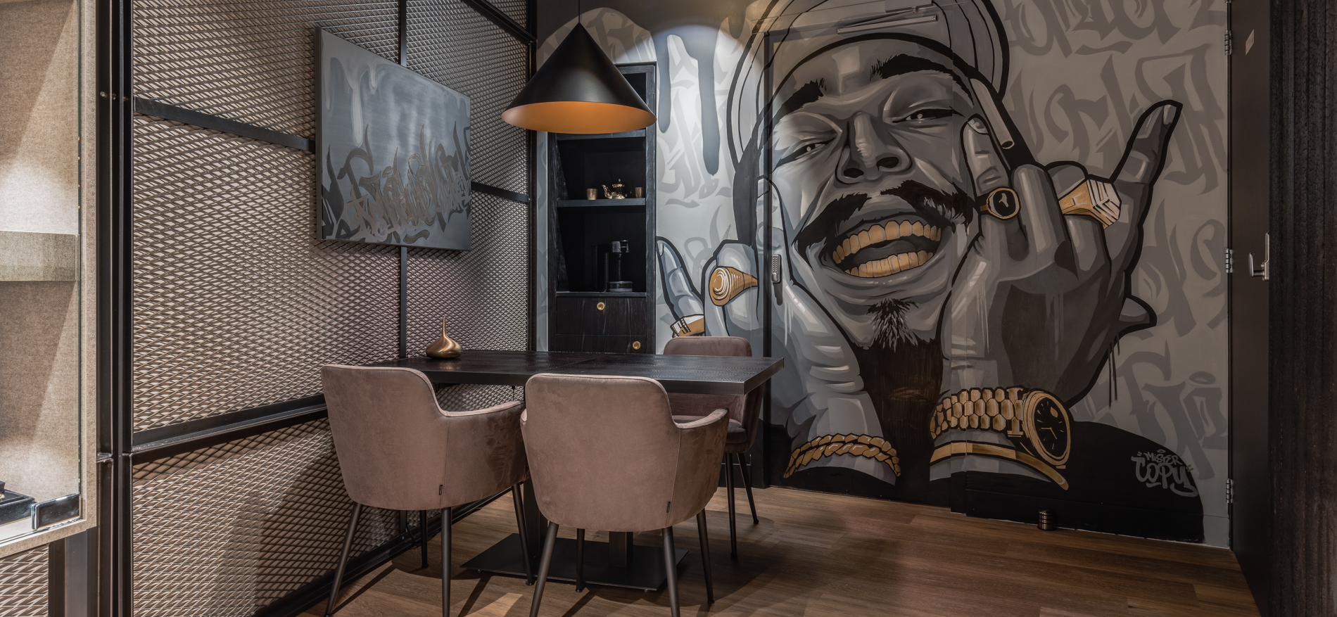 Für das breit gefächerte Publikum mit vielen Künstlern aus der Rap-Szene stehen eine Bar, eine Lounge und ein Diskussionstisch zur Verfügung. Alles überlagert von reichen und echten Materialien, die ein stilvolles Gleichgewicht schaffen. Leder, Gold, schwarz gebranntes Holz, starkes Metall und Beton sind die Materialien, die die Basis bilden. Der Schmuck wird in einer ansonsten dunklen, aufregenden Umgebung wunderbar hervorgehoben. Für den richtigen Touch hat ein internationaler Graffitikünstler ein großes Kunstwerk an der Rückwand geschaffen.