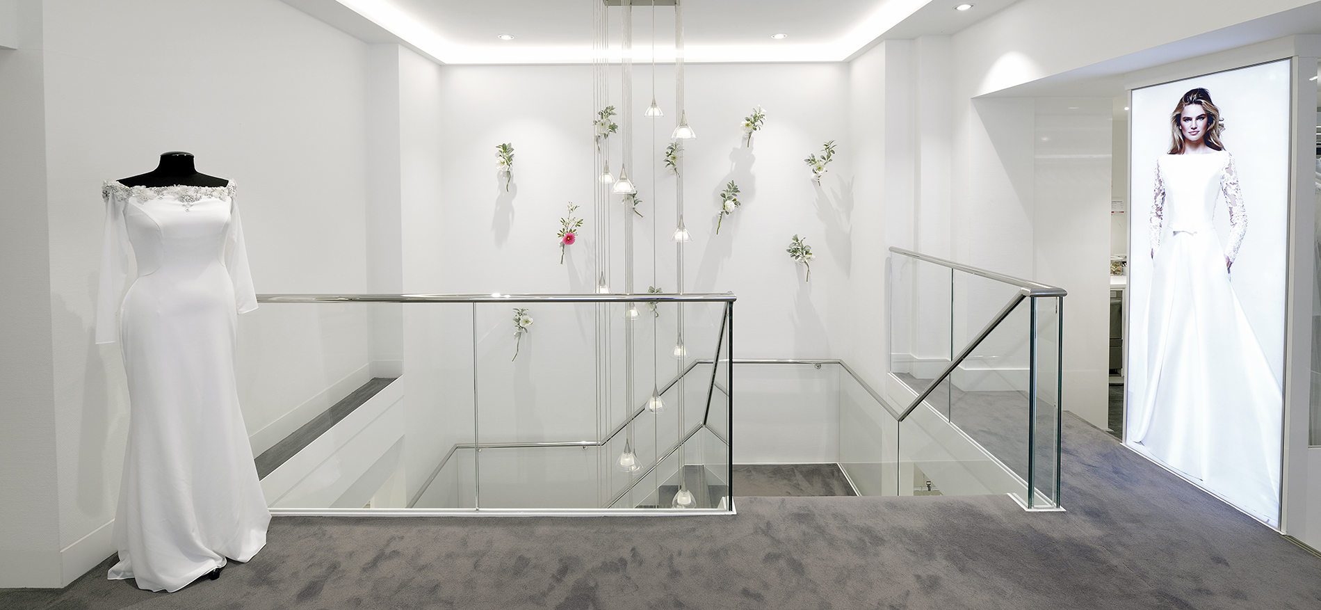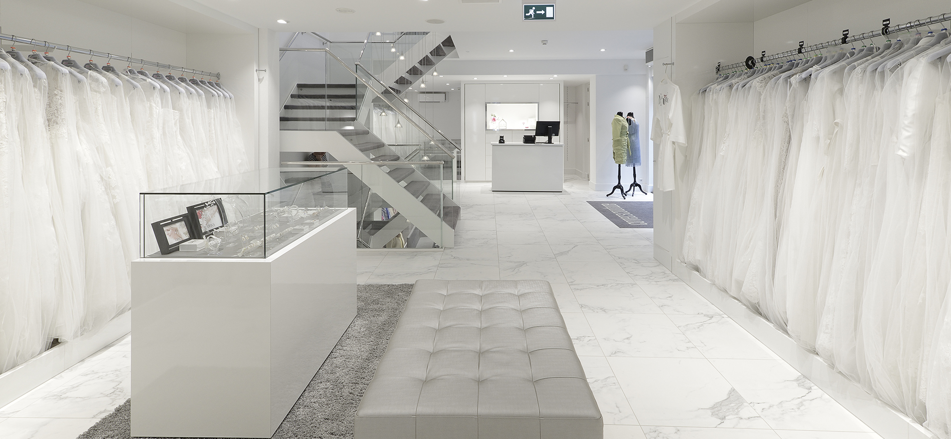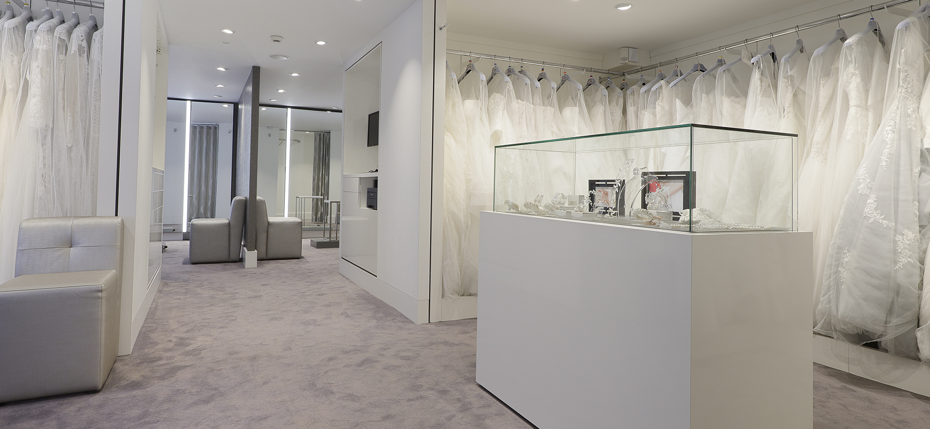 Von Anfang an hat WSB im intensiven Einvernehmen mit den Auftraggebern Hans und Alexandra den Entwurf und die Umsetzung der Ladeneinrichtung versorgt. Das direkt an eine jahrhundertalte Kirche angelehnte Gebäude hat einen Gewölbekeller und noch viele andere charakteristische alte Merkmale. Das vier Stockwerke umfassende Brautmodengeschäft wurde völlig in eine Erlebniswelt für die besten Marken auf dem Gebiet der Brautmoden umgestaltet.