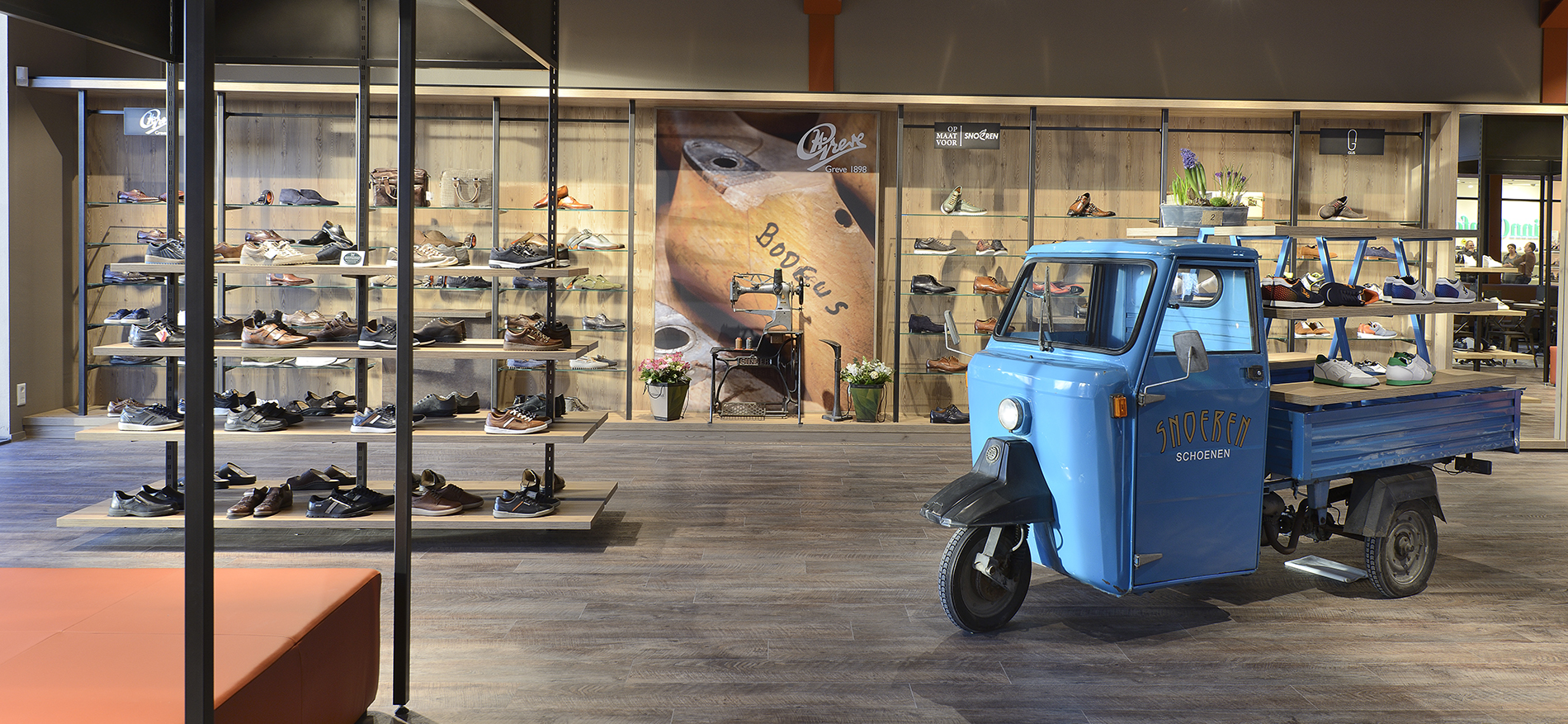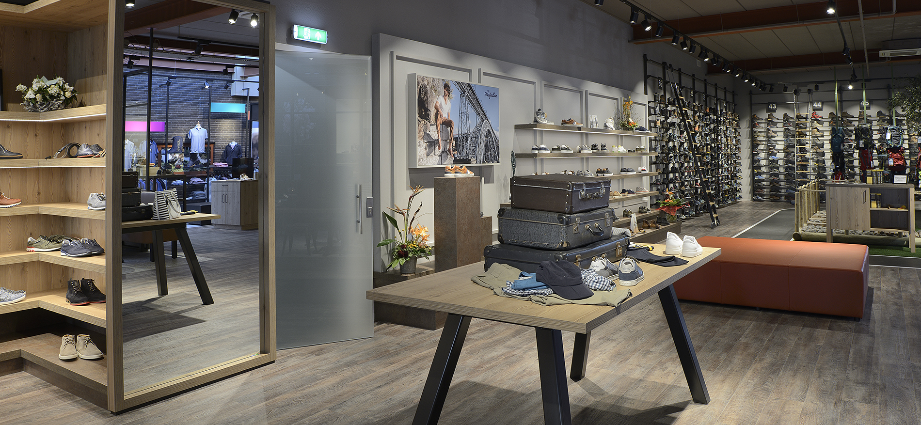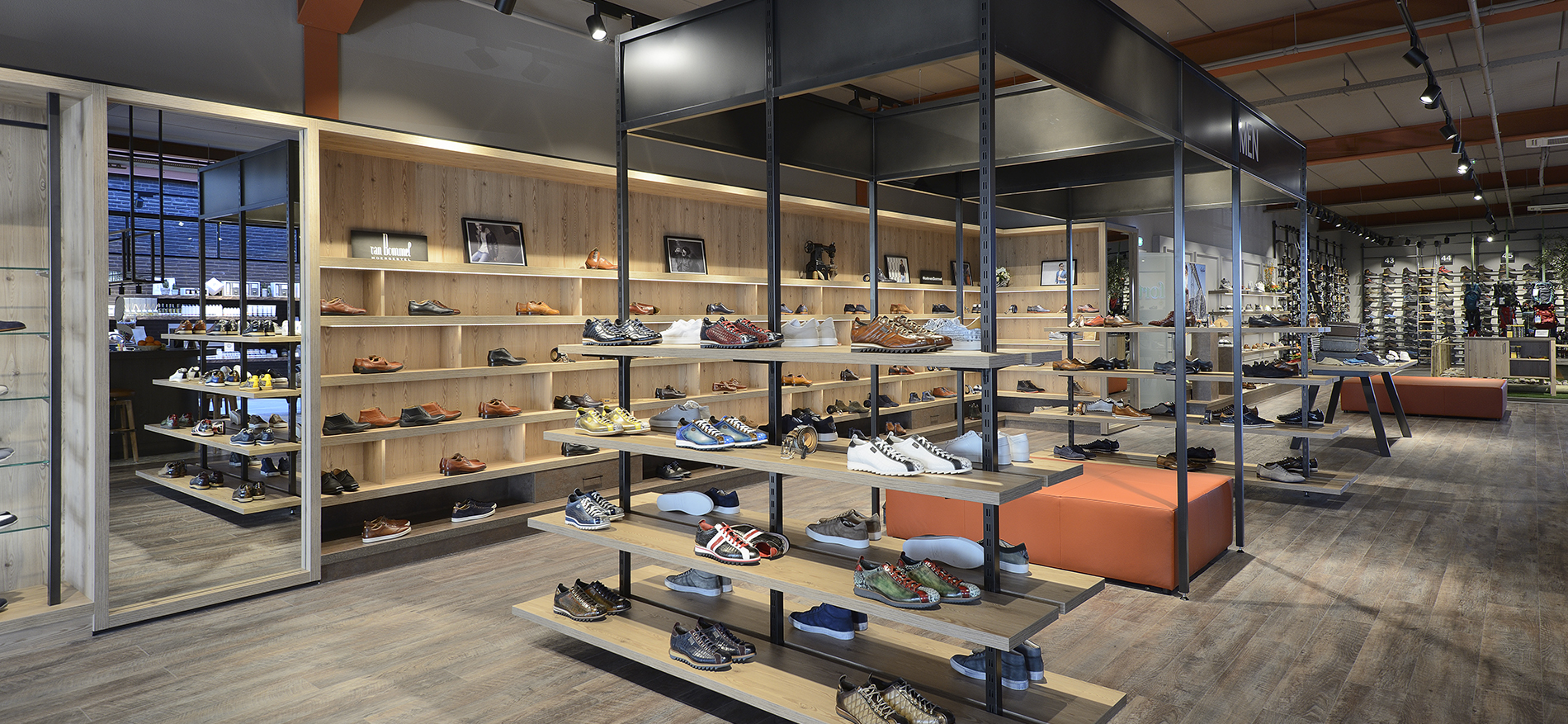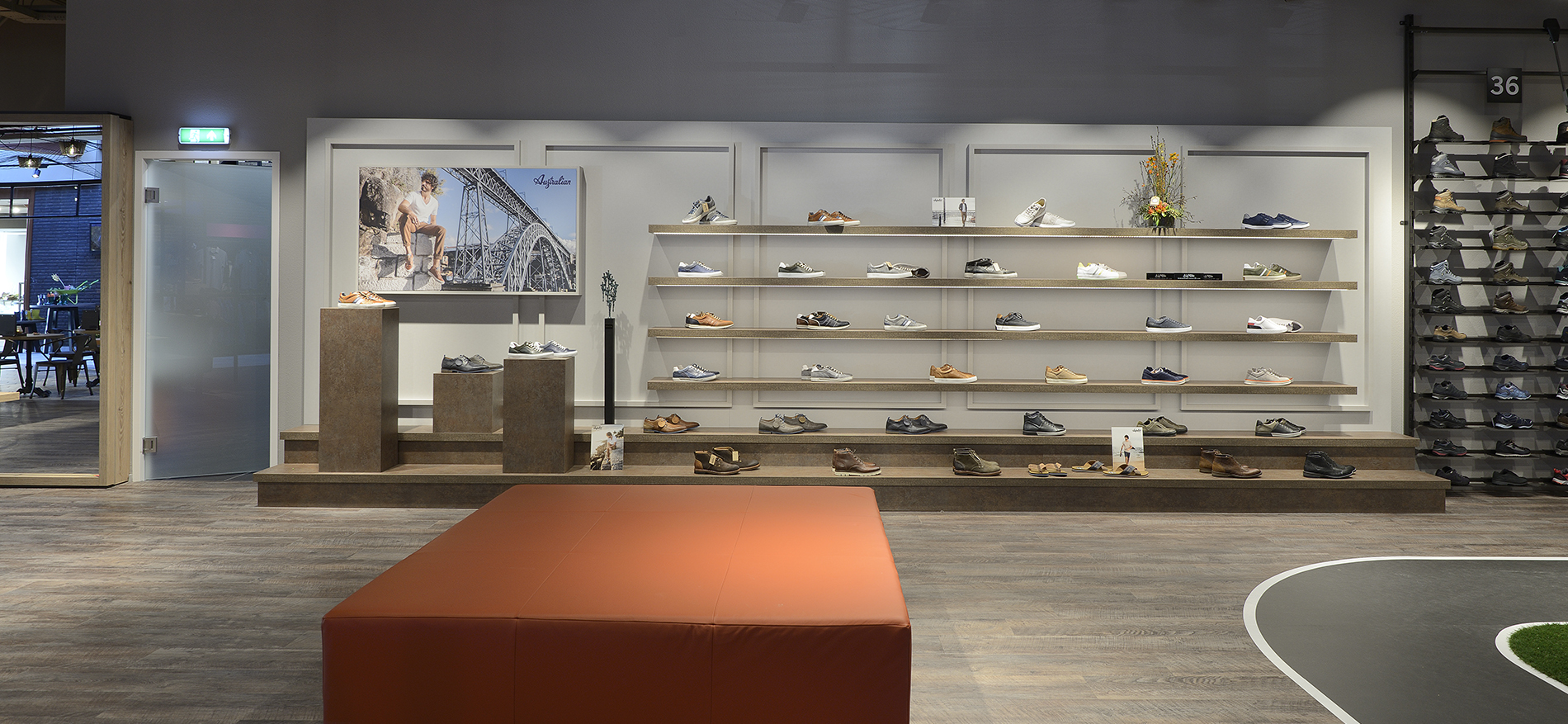 Der Ladenentwurf des Schuhgeschäfts macht den Unterschied. Da der Service besonders hochwertig sein soll, hat man sich dafür entschieden, die Rezeption, den Tresen und die Gastwirtschaft mit dem Warteraum direkt am Eingang zu konzentrieren. Das erhöht den persönlichen Charakter. Der Ausbau zur Linken dient dem großen Angebot an Herren-, Sport- und Freizeitschuhen, Mode und Zubehör sowie den Messräumen. Im 1. Stock kann man die größte Kollektion Kinderschuhe der südlichen Niederlande in eigener, Frische ausstrahlender Umgebung bestaunen. Im Gastwirtschaftstrakt wurden Mosaikfliesen verarbeitet. Große Teile der Innenausstattung sind aus robustem Lärchenholz, Bronze, Schwarzstahl und Naturgrün hergestellt worden. Die Sportabteilung hat eine weitläufige Running-Messecke. Denn Messen heißt Wissen.