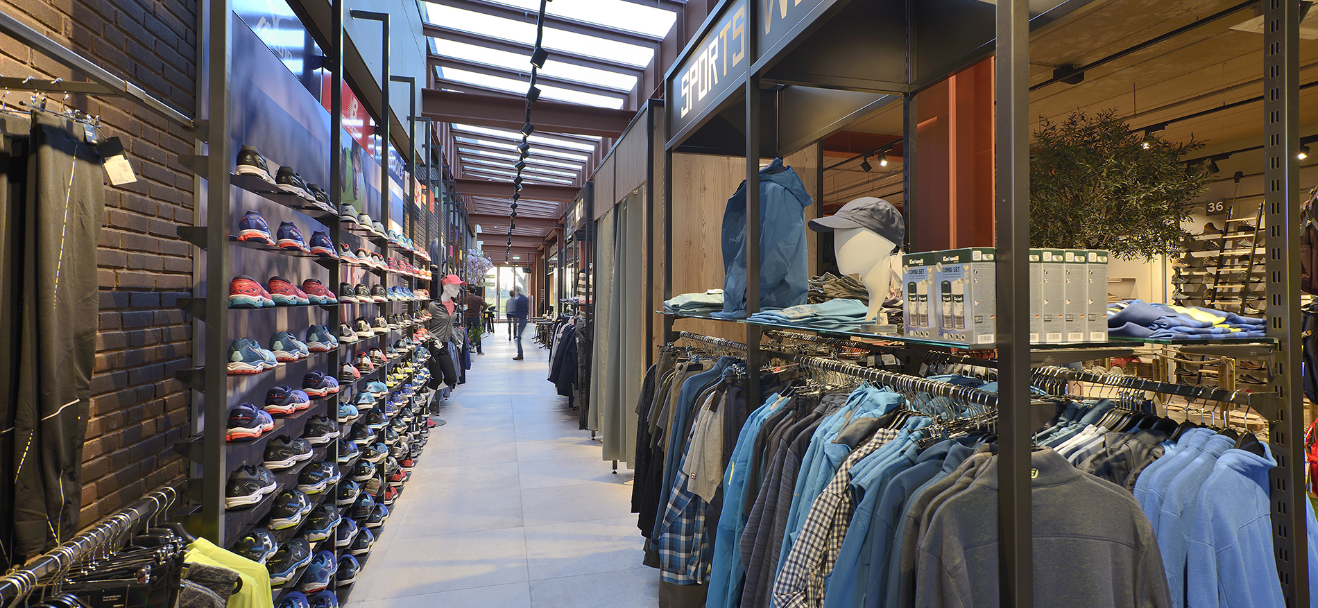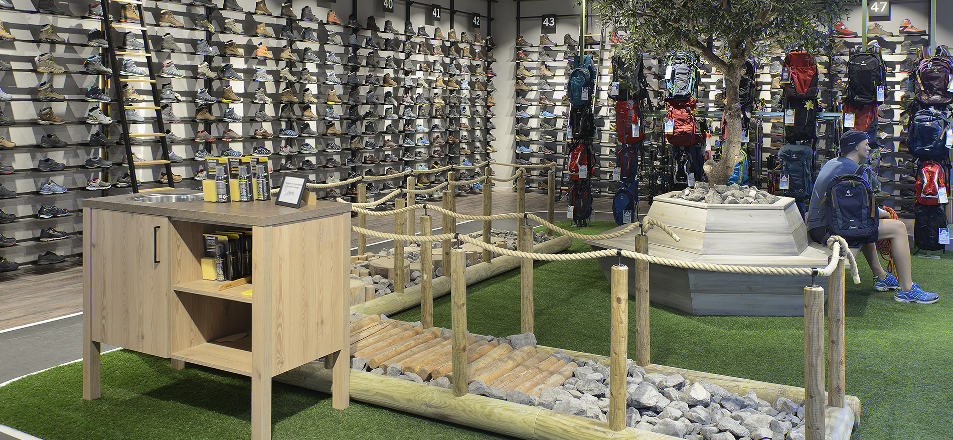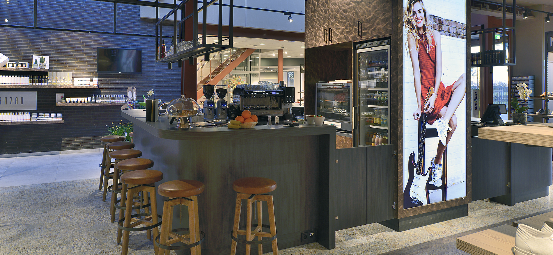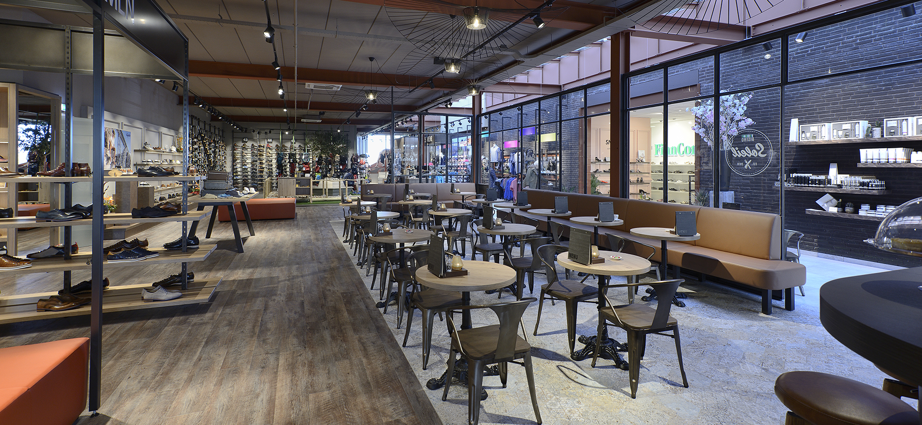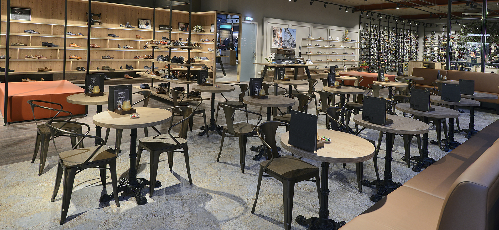 Der Ladenentwurf des Schuhgeschäfts macht den Unterschied. Da der Service besonders hochwertig sein soll, hat man sich dafür entschieden, die Rezeption, den Tresen und die Gastwirtschaft mit dem Warteraum direkt am Eingang zu konzentrieren. Das erhöht den persönlichen Charakter. Der Ausbau zur Linken dient dem großen Angebot an Herren-, Sport- und Freizeitschuhen, Mode und Zubehör sowie den Messräumen. Im 1. Stock kann man die größte Kollektion Kinderschuhe der südlichen Niederlande in eigener, Frische ausstrahlender Umgebung bestaunen. Im Gastwirtschaftstrakt wurden Mosaikfliesen verarbeitet. Große Teile der Innenausstattung sind aus robustem Lärchenholz, Bronze, Schwarzstahl und Naturgrün hergestellt worden. Die Sportabteilung hat eine weitläufige Running-Messecke. Denn Messen heißt Wissen.