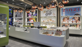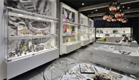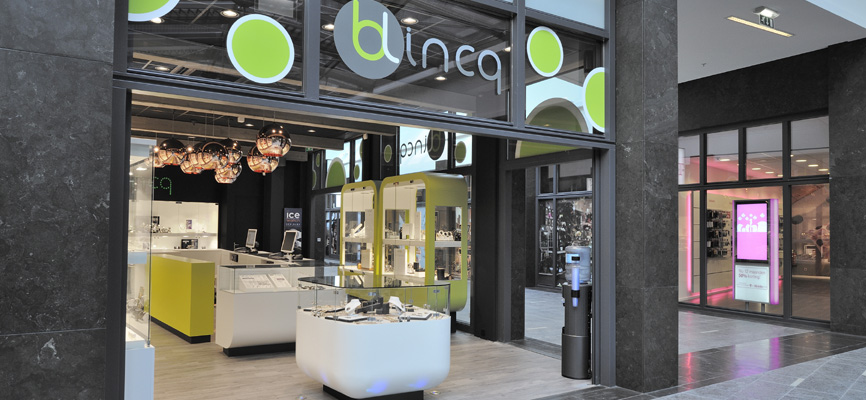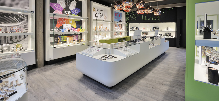 Im Fall des Juweliers aus Pijnacker sollten Ladenbau und Einrichtung folgende Botschaften vermitteln: „Wir sind jung. Wir sind angesagt. Wir sind trendy. Wir sind Marke.“ Die Rückwand des Geschäfts wurde dafür mit farbigen LEDs ausgestattet, die den Ladennamen Blincq als Eigenmarke in einem leuchtenden Sternenhimmel illuminieren. Dynamische Lichteffekte ergeben sich durch den Wechsel der Farben, zum Beispiel von Blau nach Rot. Die Decken sind dunkel gehalten. Holzelemente an Decke und Fussboden verleihen dem Geschäft einen Boutiquecharakter. Alles zusammen bildet den idealen Rahmen für die Vitrinen der starken Labels wie Zinzi, Ice Watch, Diesel, Fossil, Breil, Dji Dji, Guess, Tommy Hilfiger und viele andere.