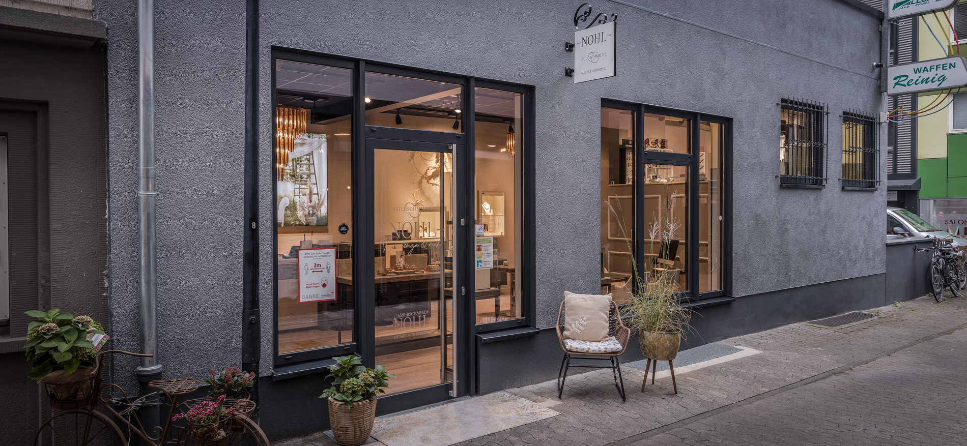 Anfang Februar 2020 kam WSB Ladenbau in Gießen mit Goldschmiede und Messerschmiede Nohl in Kontakt. Die Familie Nohl wollte den Standort wechseln und sich mehr auf den Verkauf von Eheringen konzentrieren. Am neuen Standort musste ein Eheringstudio eingerichtet werden, in dem ein kleinerer Teil des Geschäfts für den Verkauf von Jagdmessern aufgeteilt werden musste. Der Verkauf der Jagdmesser befindet sich jetzt im erhöhten Teil des Geschäfts, getrennt vom Studio. Die gesamte Verkaufsfläche beträgt 60 m2.