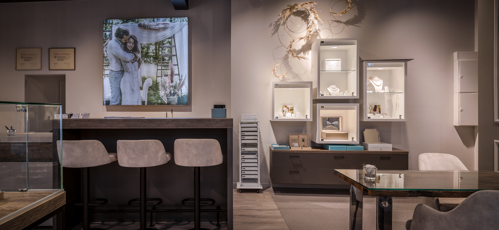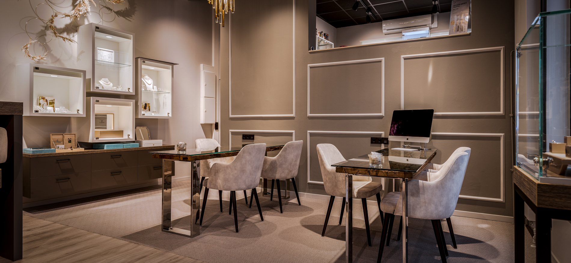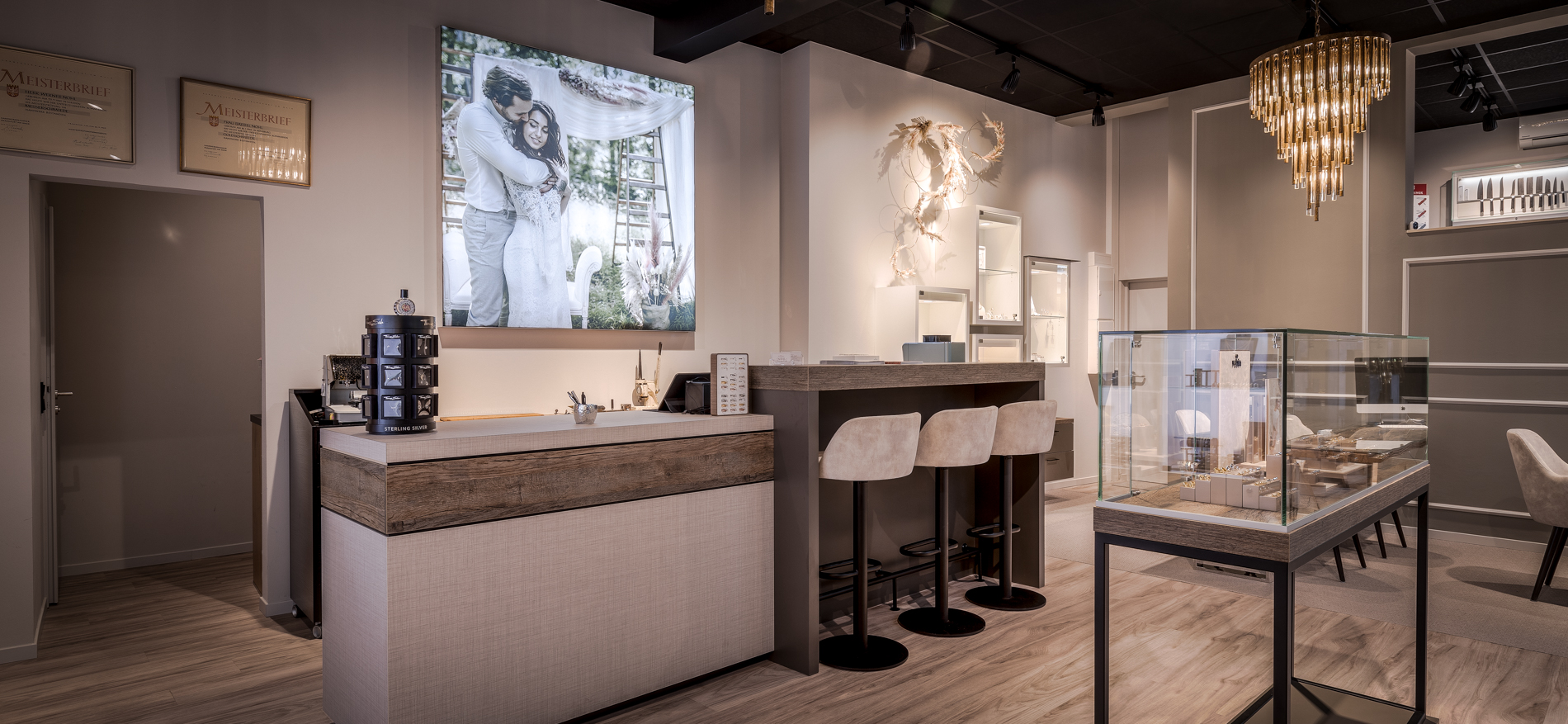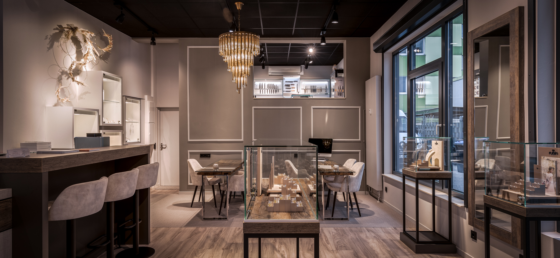 Trotz des Corona-Ausbruchs hat sich das Projekt nicht verzögert. Alle Designdiskussionen und -konsultationen fanden aufgrund der Sperrung digital und telefonisch statt. Für die Familie Nohl waren die warme Atmosphäre, das Wohnzimmergefühl und der geräumige, ruhige Beratungsbereich die Schlüsselwörter für das Design. Die 2 Beratungstische und dekorativen Kronleuchter wurden vom Kunden gekauft und sind perfekt in das Design integriert. Es ist ein großes harmonisches Ganzes geworden. Das Material und die Verwendung von Farben sind wunderschön aufeinander abgestimmt. Sogar der Goldschmiedetisch wurde in den Laden hinter die Theke gestellt, um die Handwerkskunst für die Kunden sichtbar zu machen.
