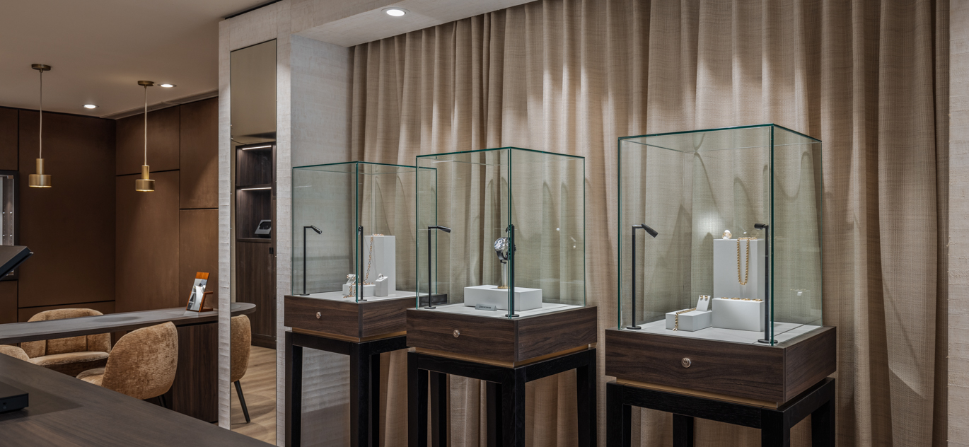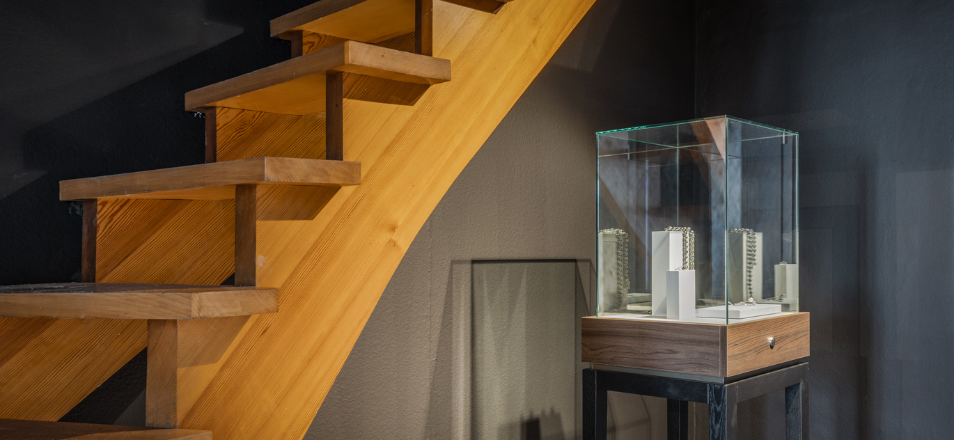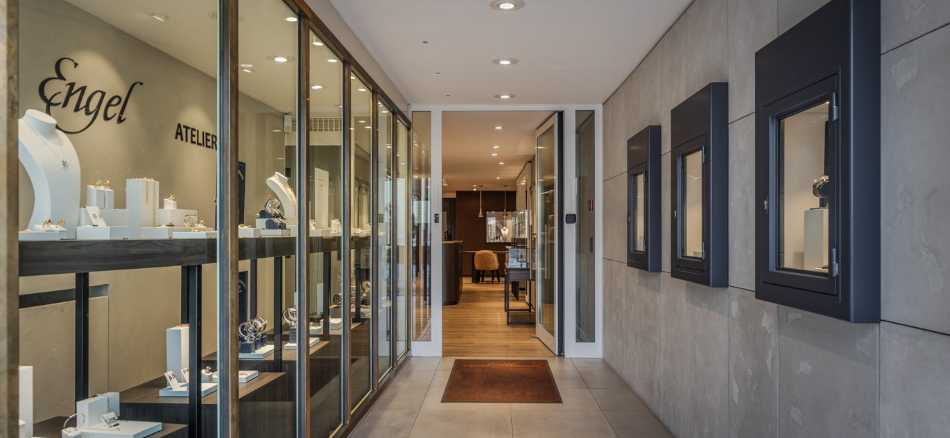 Schaufenster von Engel Juwelier mit Beton- und freistehenden Performance-Vitrinen.