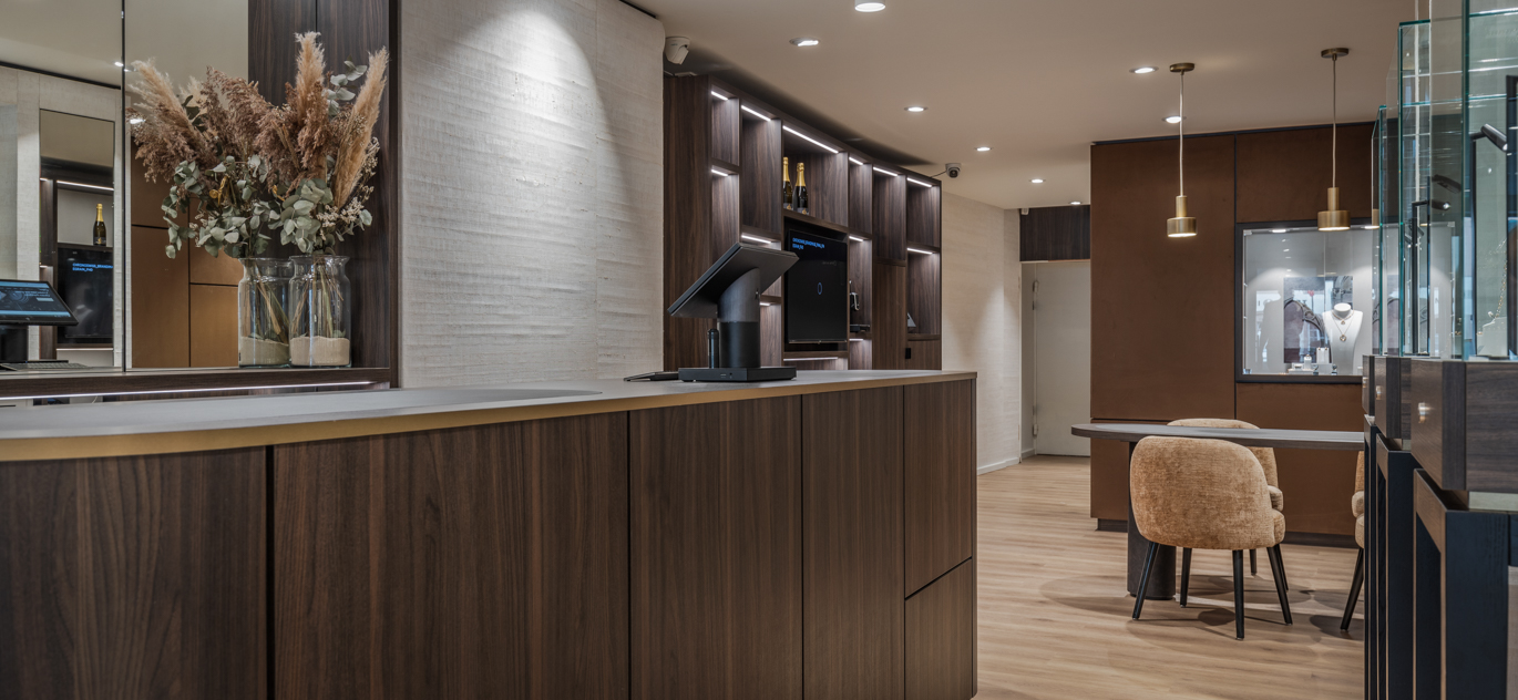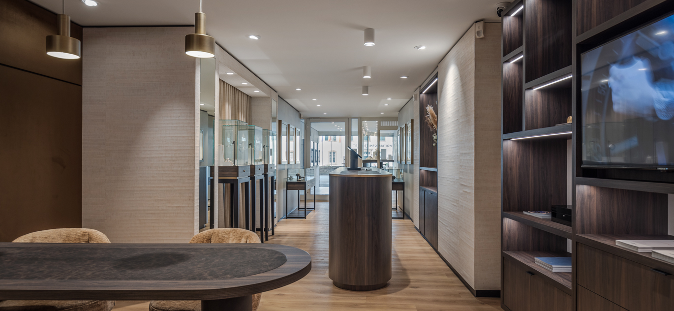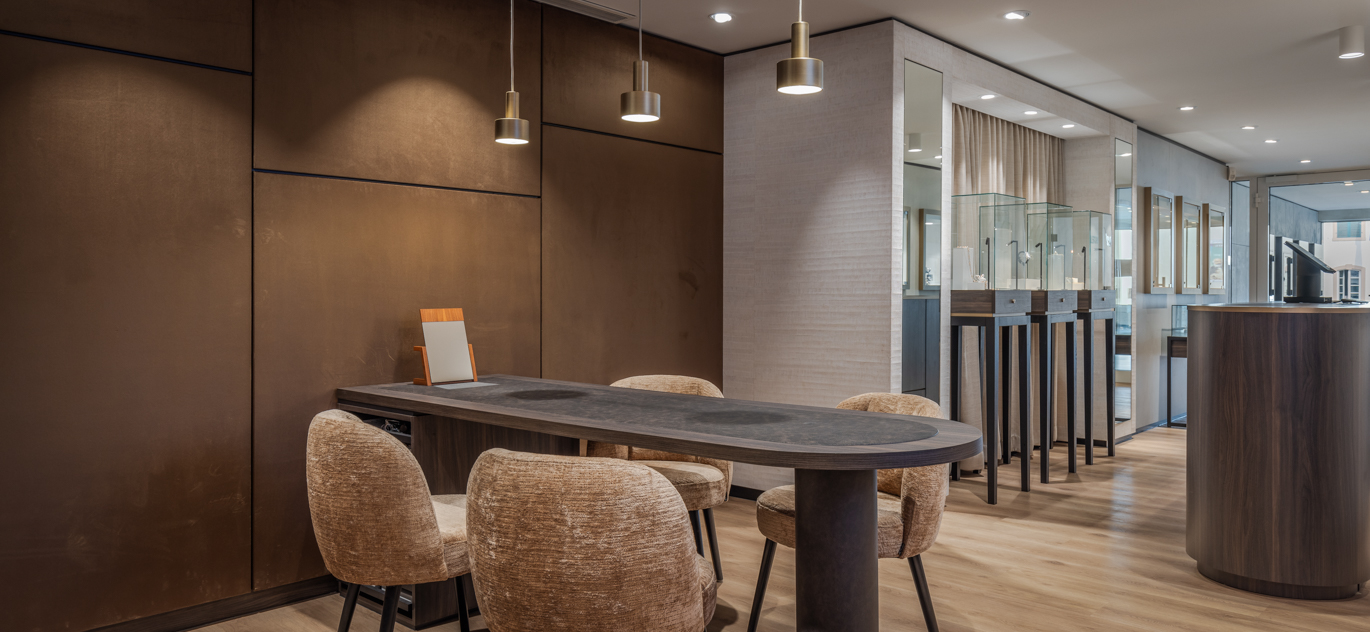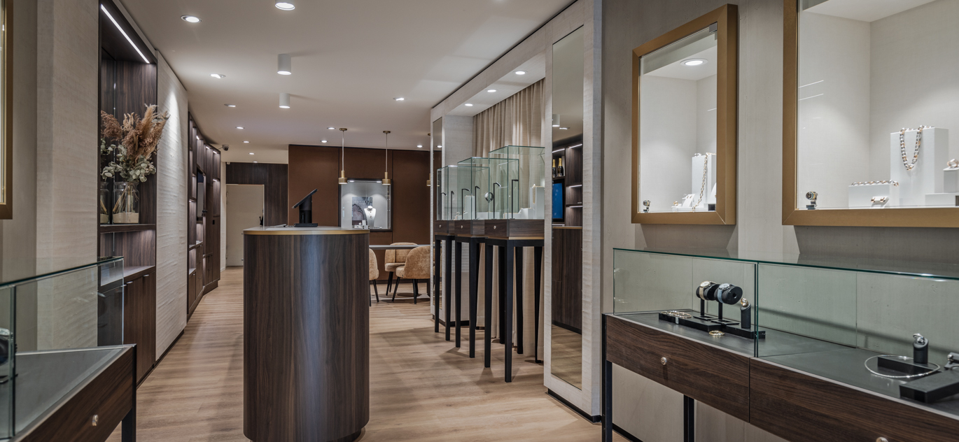 Das elegante Ladendesign spiegelt sich auch in der Inneneinrichtung wider, die mit einem Innenbereich mit großzügigen Wandvitrinen und entsprechenden Sideboards im Vorderbereich eine schöne Präsentationsfläche bietet. Eine lange und schmale Bedientheke im Mittelbereich dient zur Vorlage von Uhren und Schmuckstücken. Daran schliesst sich im hinteren Teil eine großzügige Sitzberatung an, die auch für das Trauringgeschäft genutzt wird.
