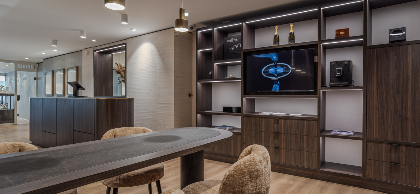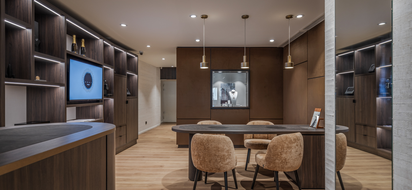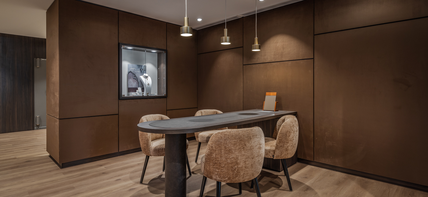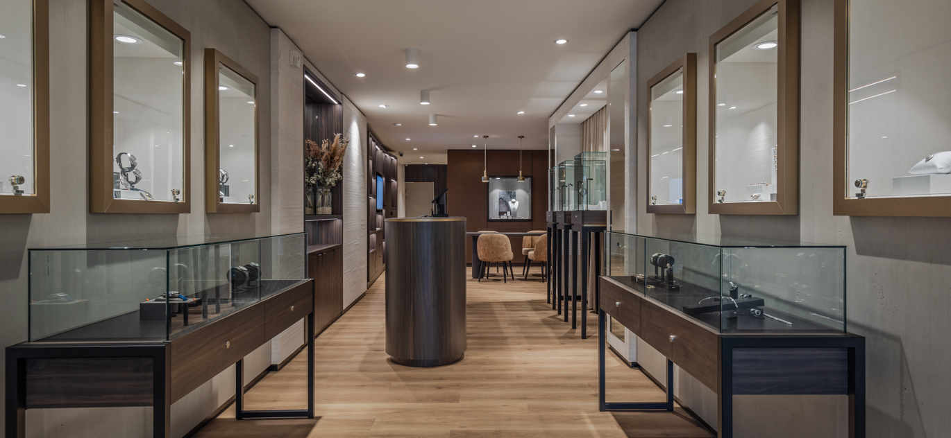 Das elegante Ladendesign spiegelt sich auch in der Inneneinrichtung wider, die mit einem Innenbereich mit großzügigen Wandvitrinen und entsprechenden Sideboards im Vorderbereich eine schöne Präsentationsfläche bietet. Eine lange und schmale Bedientheke im Mittelbereich dient zur Vorlage von Uhren und Schmuckstücken. Daran schliesst sich im hinteren Teil eine großzügige Sitzberatung an, die auch für das Trauringgeschäft genutzt wird.