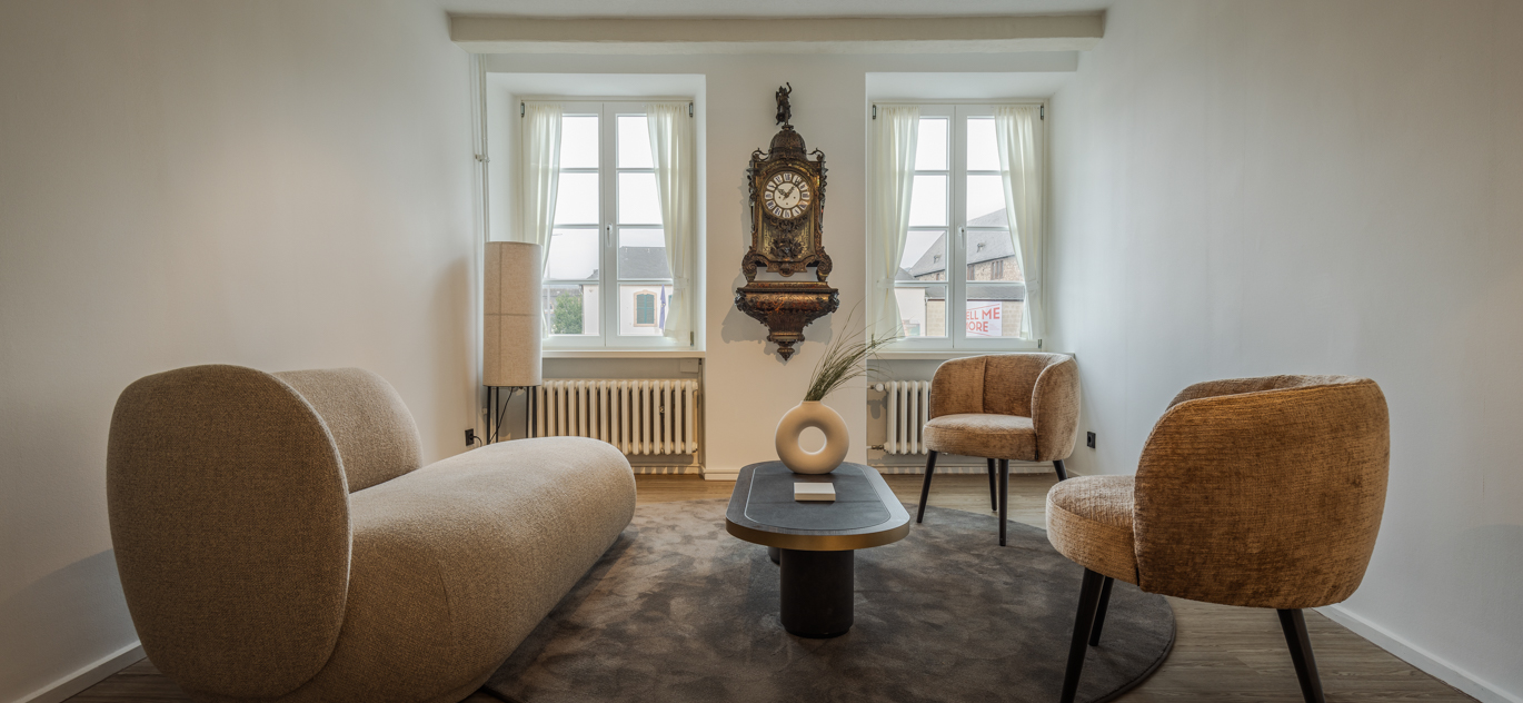 Ein Highlight ist die kleine aber feine Lounge im 1. Obergeschoß, mit direktem Blick auf die Trierer Porta Nigra. Hier hat man Zeit, dem Kunden die von Nils selbst entworfenen und gefertigten Schmuckstücke in aller Ruhe zu präsentieren.