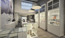 Eigenständige Atmosphäre>> Referenzen für Erfolg versprechende Ladenbaulösungen, auch für kleine und mittelständische Juweliergeschäfte, kann WSB vielfach aufführen. So hat der niederländische Ladenbauer jüngst Reyersen von Buuren in Utrecht zu modernen Erscheinungsbildern verholfen. Die neu gestalteten Geschäfte kommen nicht nur bei Stammkunden sehr gut an sondern auch bei jungen Neukunden. Auf dem deutschen Markt ist WSB dank Deutsch sprechender Kundenberater ebenfalls schon länger aktiv.