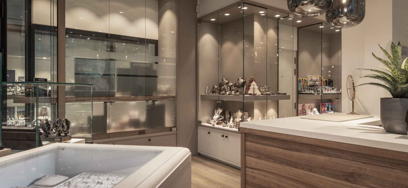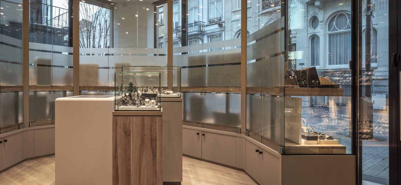 Die Pläne für diese Renovierung wurden vor fünf Jahren erstellt und nachdem die erforderliche Baugenehmigung von der Gemeinde Mechelen erhalten wurde, konnte das WSB-Team mit der Arbeit beginnen. Das Ergebnis ist ein schlüsselfertiges Projekt, vom Abriss bis zur Schlüsselübergabe bei der Eröffnung. Ein wichtiger Aspekt des Designs war die Rückkehr der Vitrinen rund um das Fenster, die Neugier wecken und Kunden dazu einladen, ihre erste Wahl aus einer Auswahl von Marken wie Rado, Balmain und Pandora zu treffen.