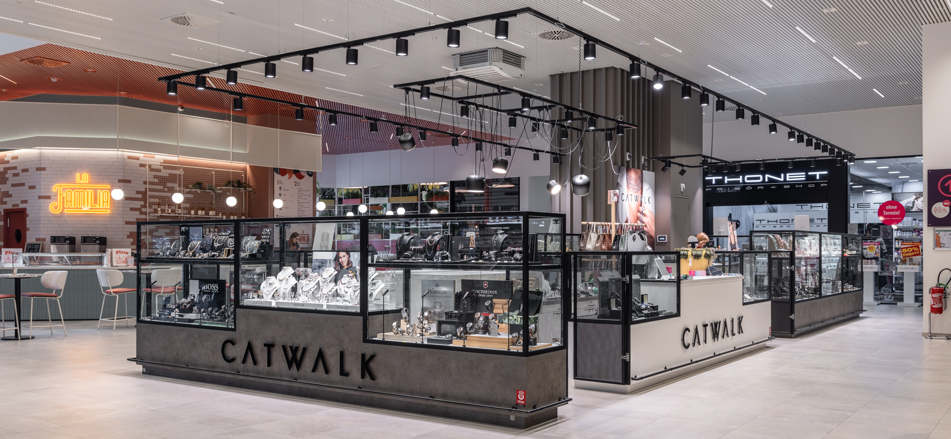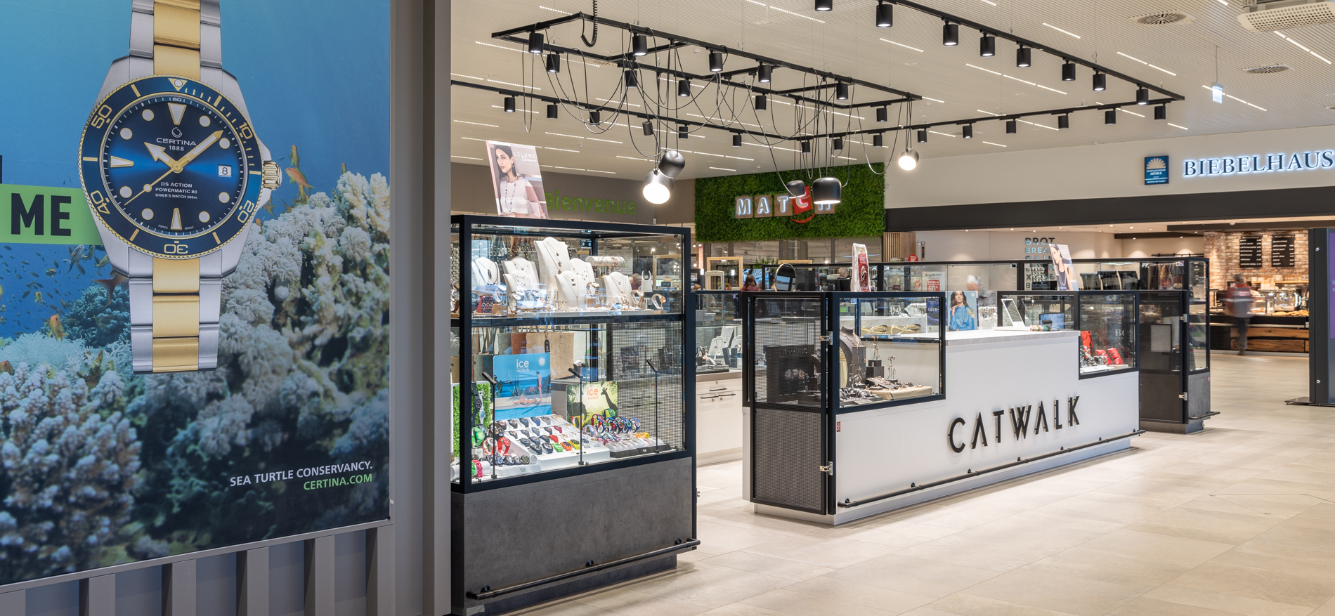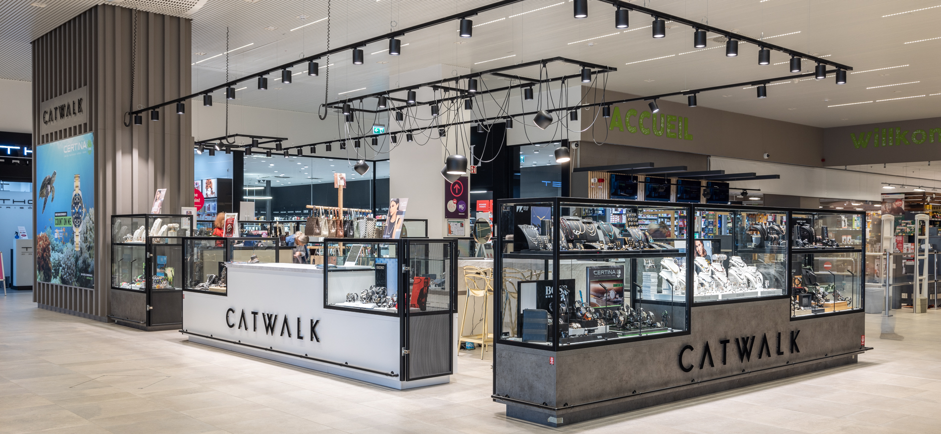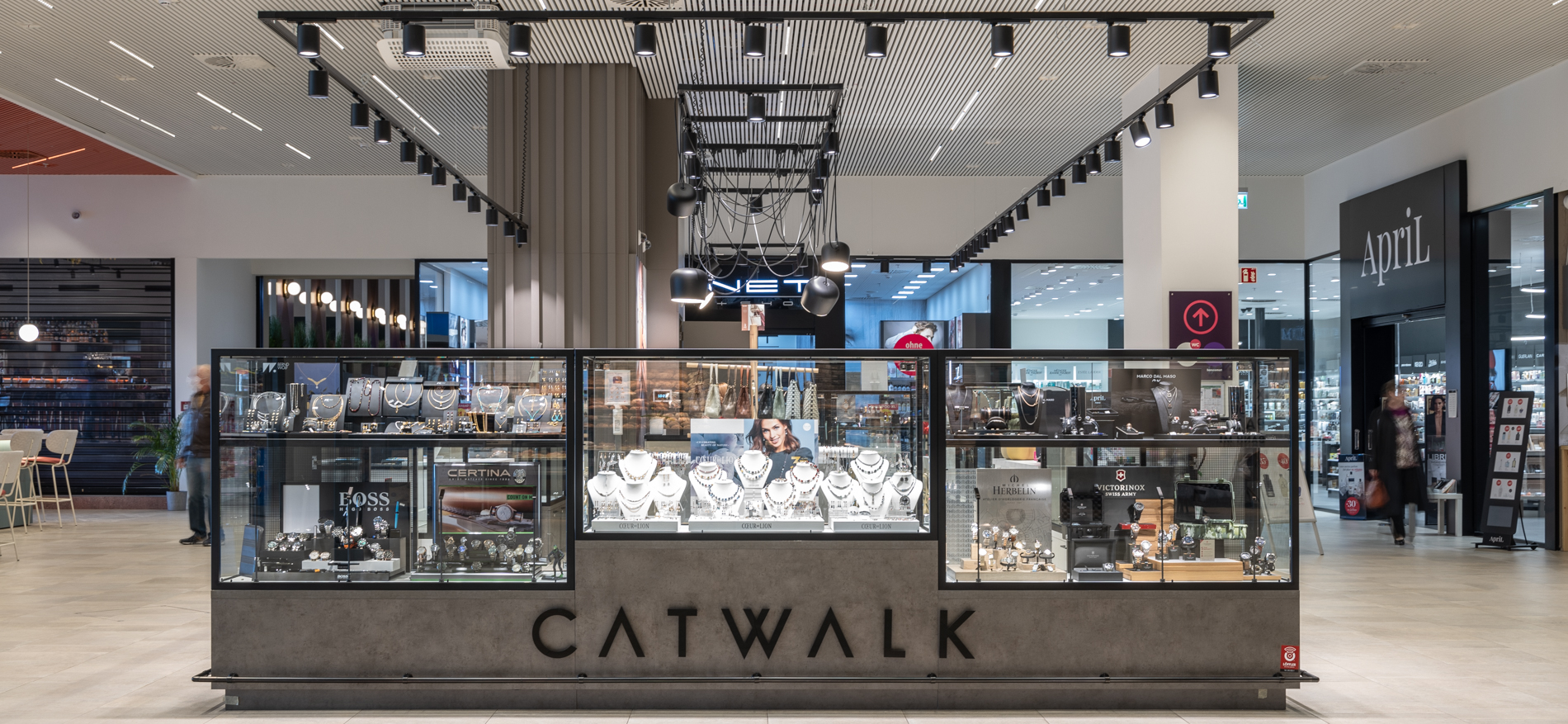 Das Copal Shopping Center in Grevenmacher stand vor einer Komplettsanierung. Davon war auch der Juwelier CATWALK (von Juwelier Hoffmann) betroffen, der dort seit Jahren mietete. Roxanne und Jeff, die nächste Generation bei Hoffmann, beauftragten WSB mit der Umsetzung eines außergewöhnlichen Konzepts mitten im Einkaufszentrum.