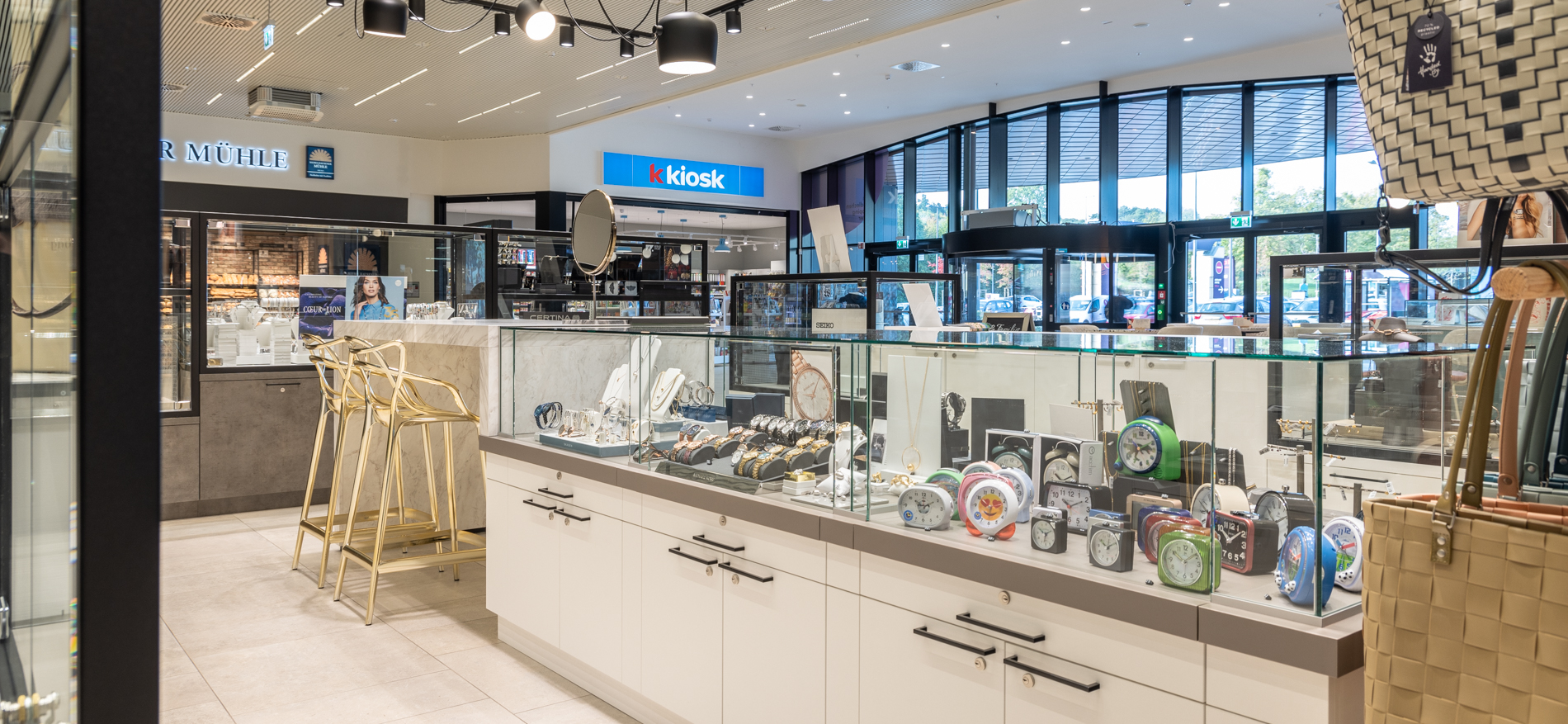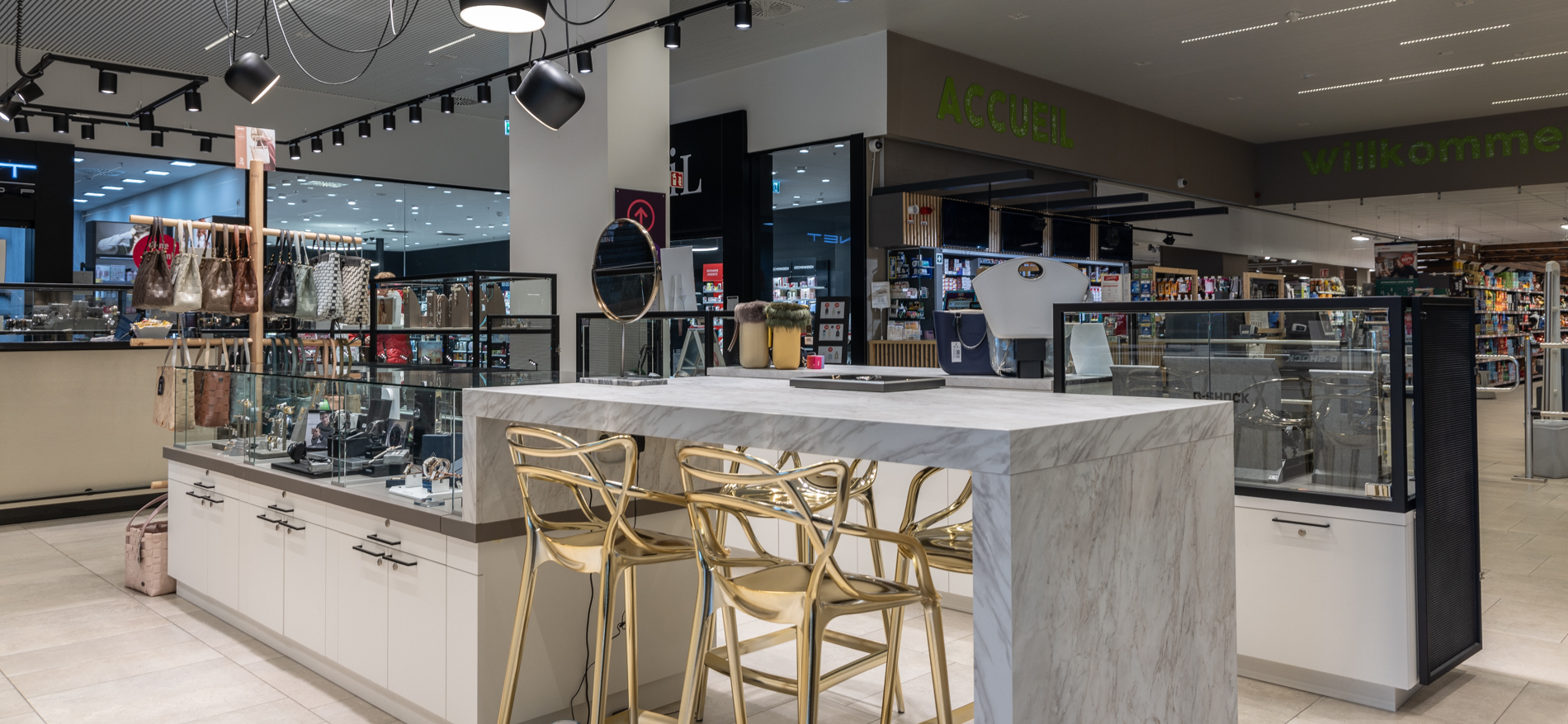 Hier können Kunden die Ware von allen vier Seiten betrachten und den Innenbereich auch mit Einkaufswagen zweimal von zwei Seiten für eine Beratung betreten. Helle Flächen kombiniert mit schwarzen Stahlvitrinen und einem optimalen Lichtkonzept. Dies kombiniert mit Designlampen für stimmungsvolles Licht. Ein Beratungstisch mit hohen, goldfarbenen Designstühlen sorgt im Inneren für ein weiteres Highlight.