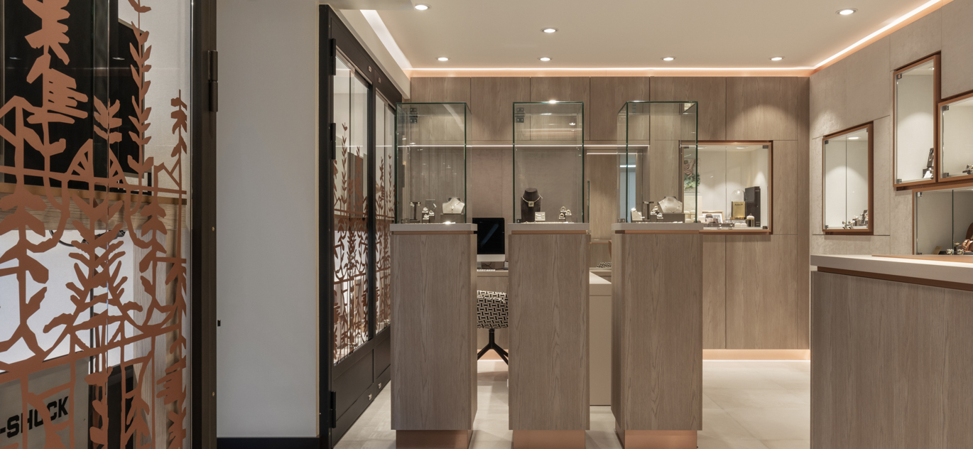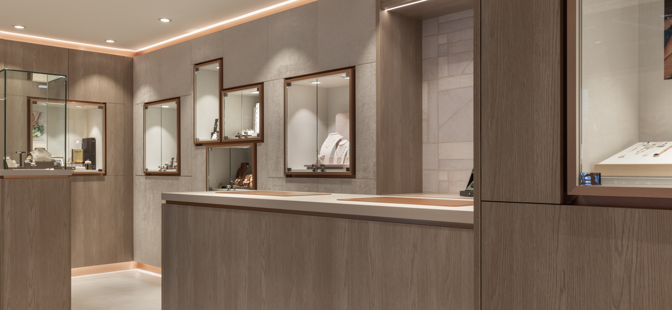 Rick Blankenstijn von WSBdesign.com: „Der alte Laden hatte etwas nüchterne Töne, es gab nicht viel Auslage. Unser Ladendesign basiert auf schönen leichten und edlen Stoffen. Der von unseren Innenarchitekten ausgewählte Holzton in Kombination mit dem warmen Roségold verleiht diesem Laden eine weiche und warme Ausstrahlung.