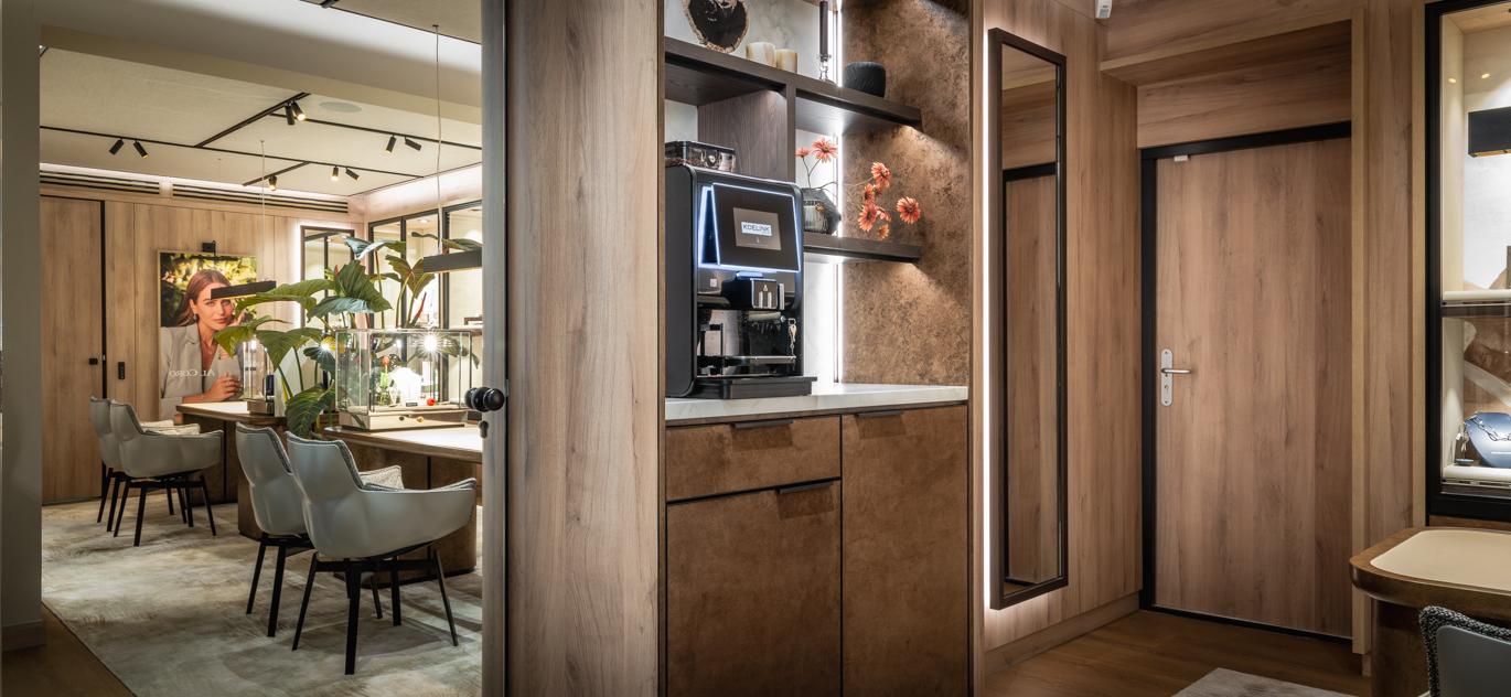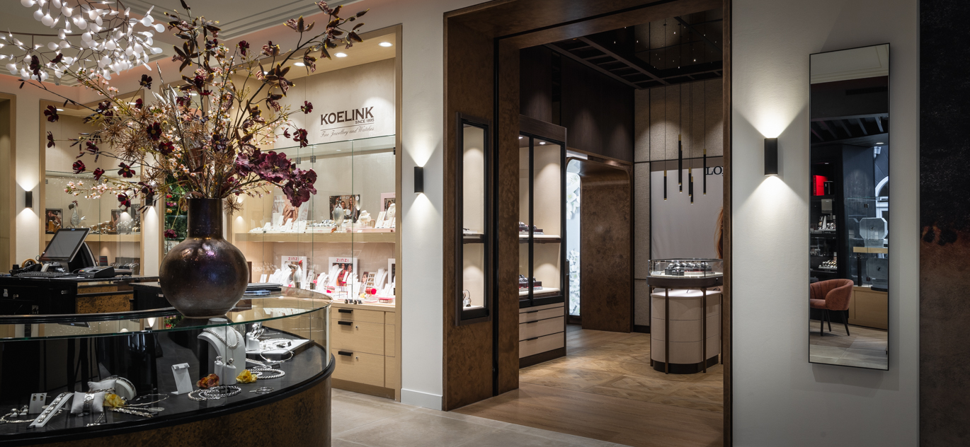 Seit 1895 ist Juwelier Koelink in Enschede eine Institution, und mittlerweile führt die vierte Generation das Unternehmen. Vor einigen Jahren renovierte WSB den Juwelierladen in Enschede. Aufgrund des Erfolgs wurde der Juwelier kürzlich erweitert. WSB hat diese Erweiterung entworfen und realisiert, sodass sie perfekt zum Stil des bestehenden Geschäfts und der neu hinzugefügten Breitling Store passt.