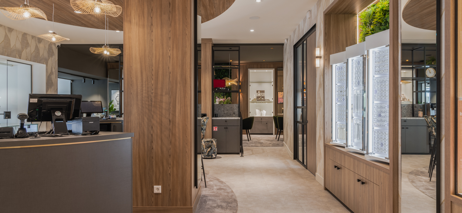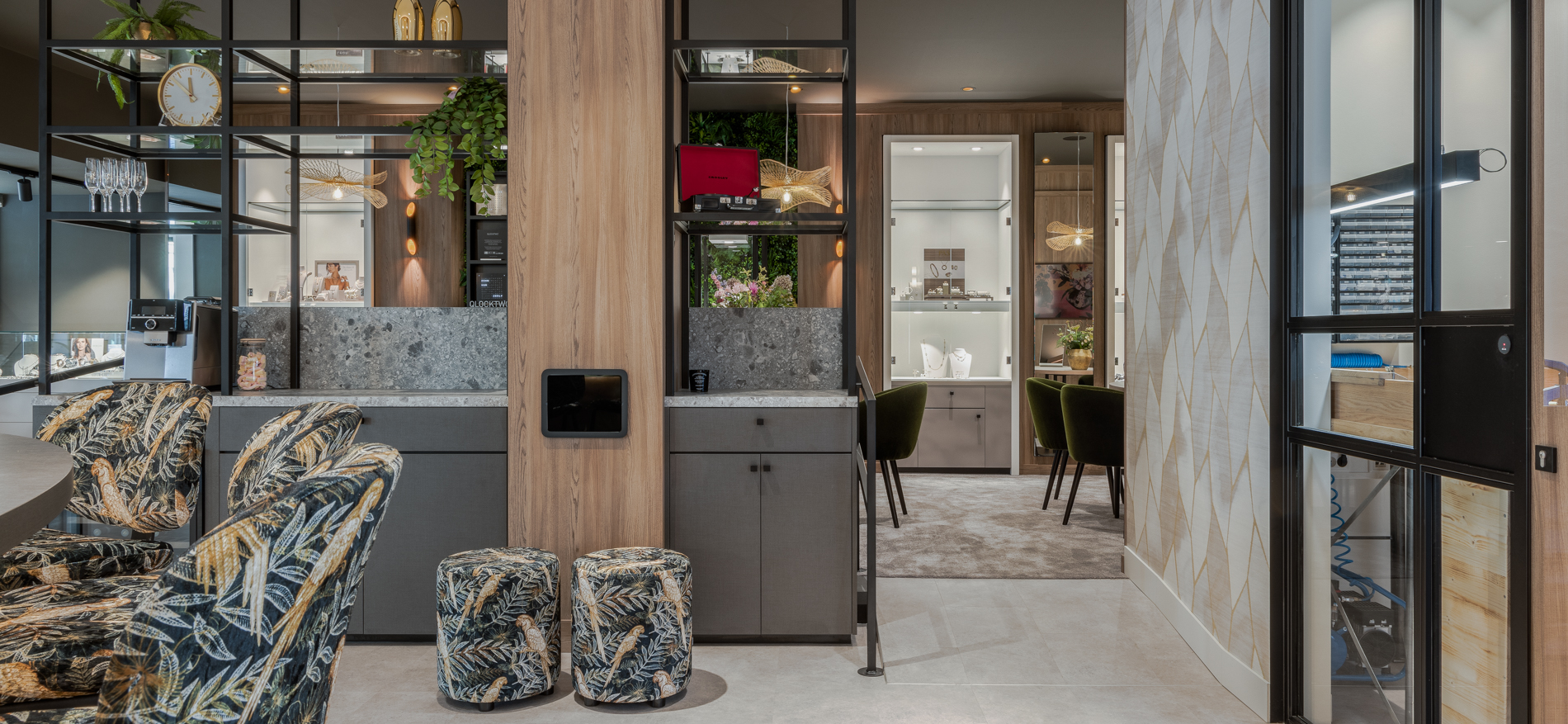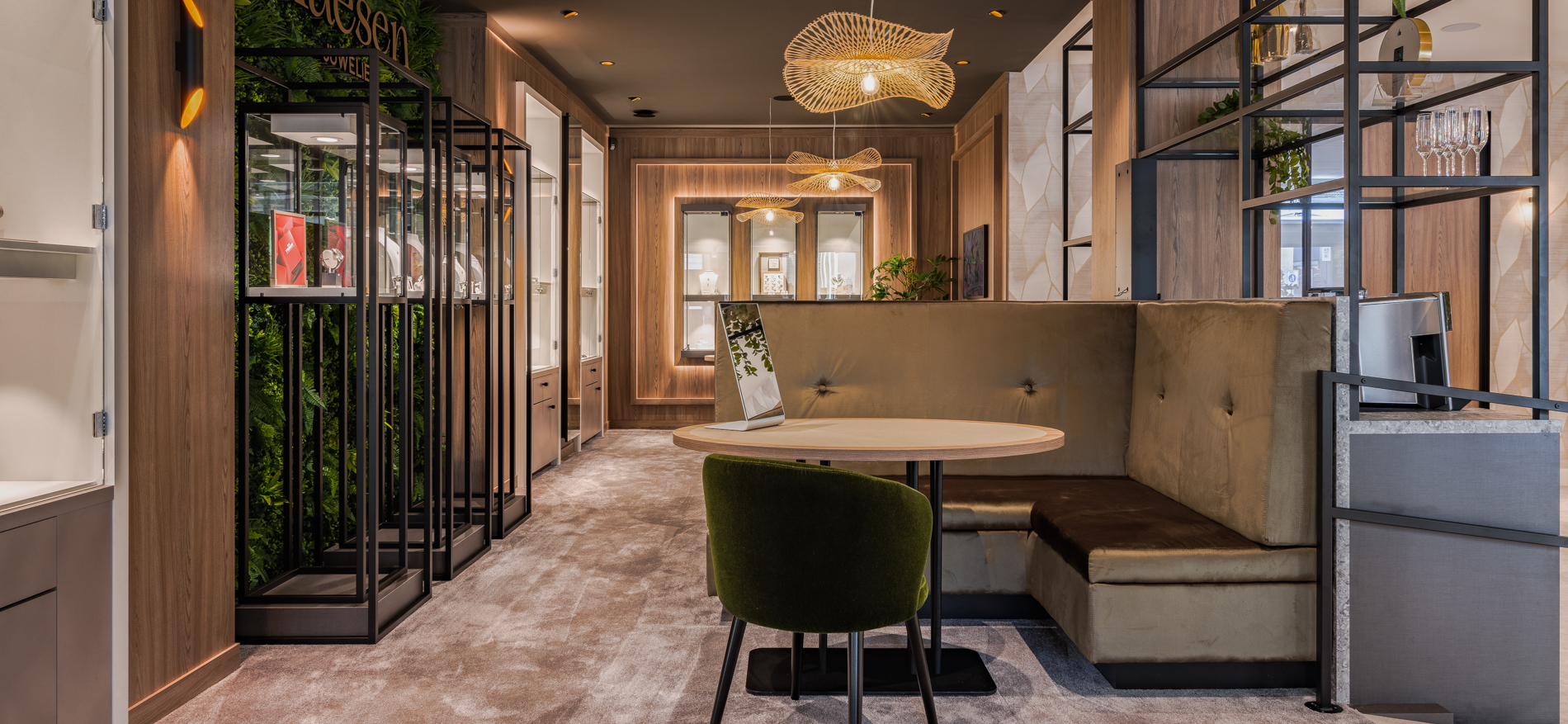 Die Gemeinde Valkenburg pflegt gern ein Gemischtwarenladen-Image ohne grelle Werbung. Die Farben von Marlland werden im Design sehr geschätzt. Die Philosophie wurde bei der Gestaltung der Außenfassade in Kombination mit einem Fokus auf Sicherheit und Einbruchhemmung umgesetzt. Der Laden selbst hat ein gemütliches Design, viele ruhige, natürliche Töne in Kombination mit dem schönen Walnussholz werden mit goldenen Details und eleganten Stoffen durchsetzt. Die Höhenunterschiede im Laden wurden genutzt, um eine charmante Sitzecke zu schaffen, in der Robert, Francien und die Kunden in Ruhe reden, schauen und auswählen können.