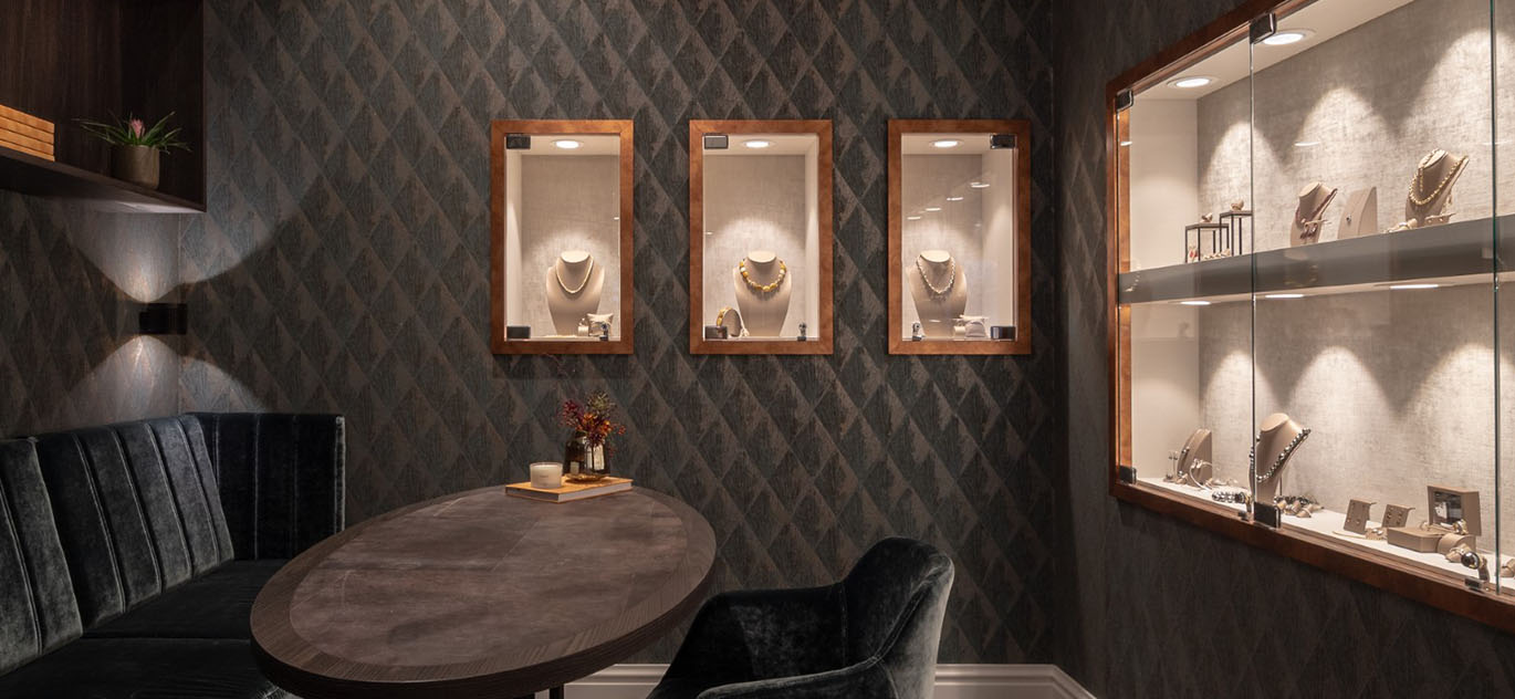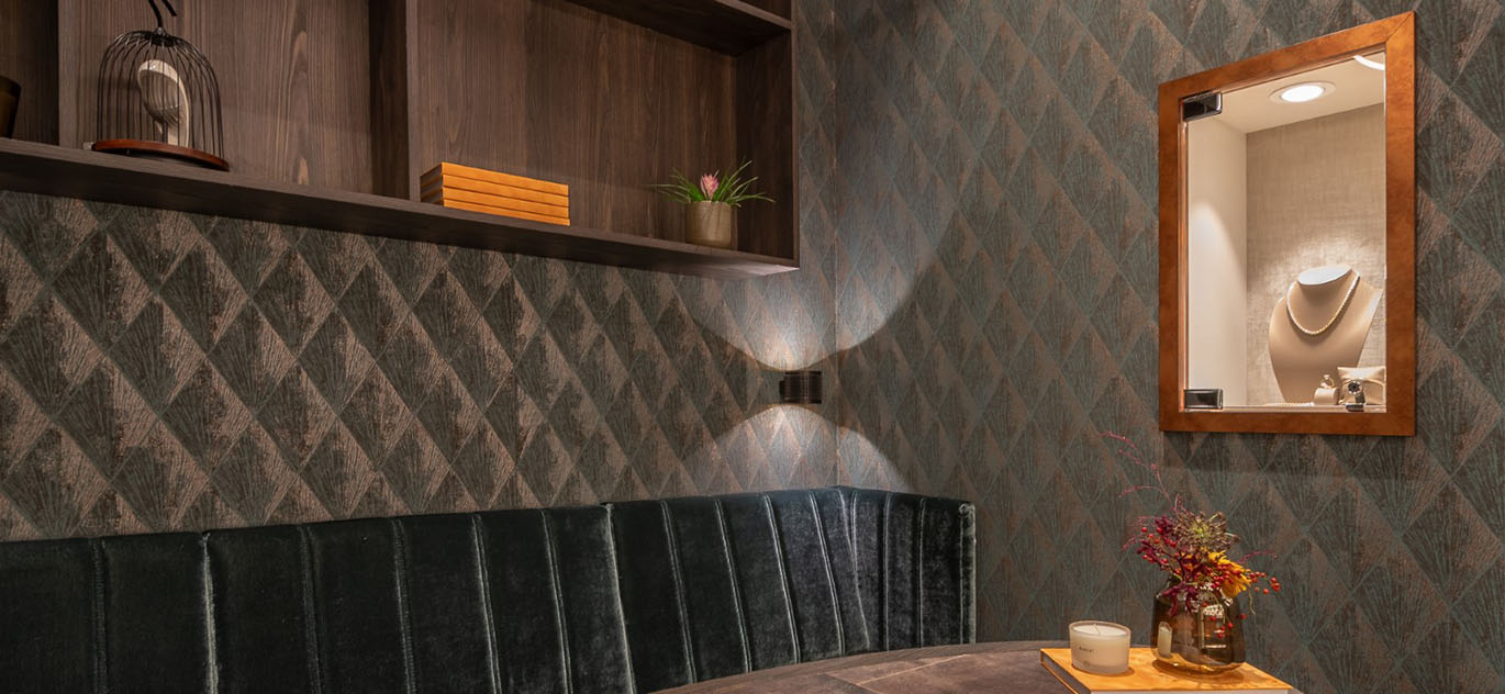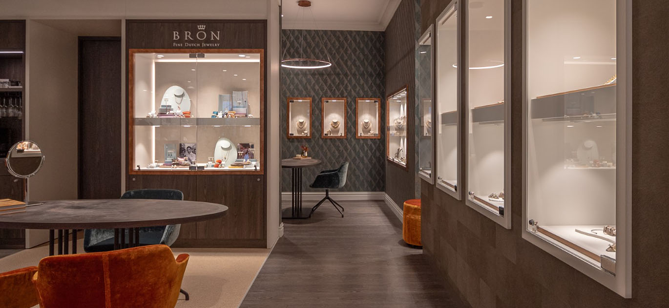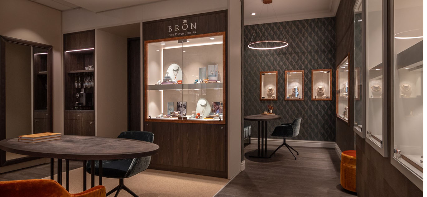 Rick Blankenstijn von WSB: „Ronald und Jacqueline lieben schöne, detaillierte Atmosphären. Daran hat sich seit 2011 nichts geändert und wird sich sicherlich auch in der Neugestaltung der Ladeneinrichtung im Jahr 2023 widerspiegeln. Der zentrale Bereich und die Präsentation der Schmuckstücke in den Vitrinen sind nun wieder schicker und luftiger mit natürlichen Materialien wie Alphenberg-Leder, Messingdetails, warmen Alcove-Polstern und indirekten Lichteffekten. Das Licht ist zudem modern, sparsam und stimmungsvoller. Der Sitzbereich im hinteren Bereich ist charakteristisch für das luxuriöse Ladendesign: funkelnde Tapeten, weiche Materialien und dezente, aber reich verzierte Möbel.