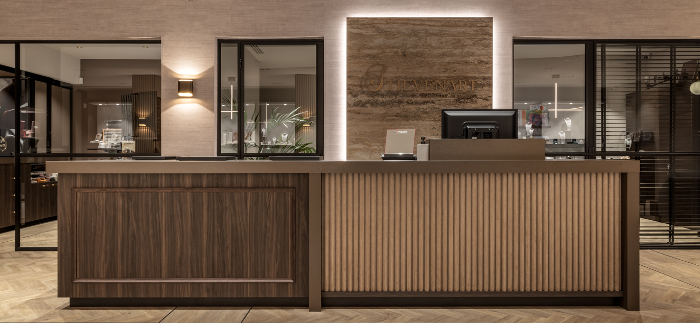 Die jüngste Zusammenarbeit zwischen Stievenart und Rick Blankenstijn von WSB führte zu einem wunderschönen Geschäft, in dem ein durchdachtes Design und eine intelligente Wegeführung dem Kunden das perfekte Erlebnis beim Kauf eines passenden Schmuckstücks bietet.