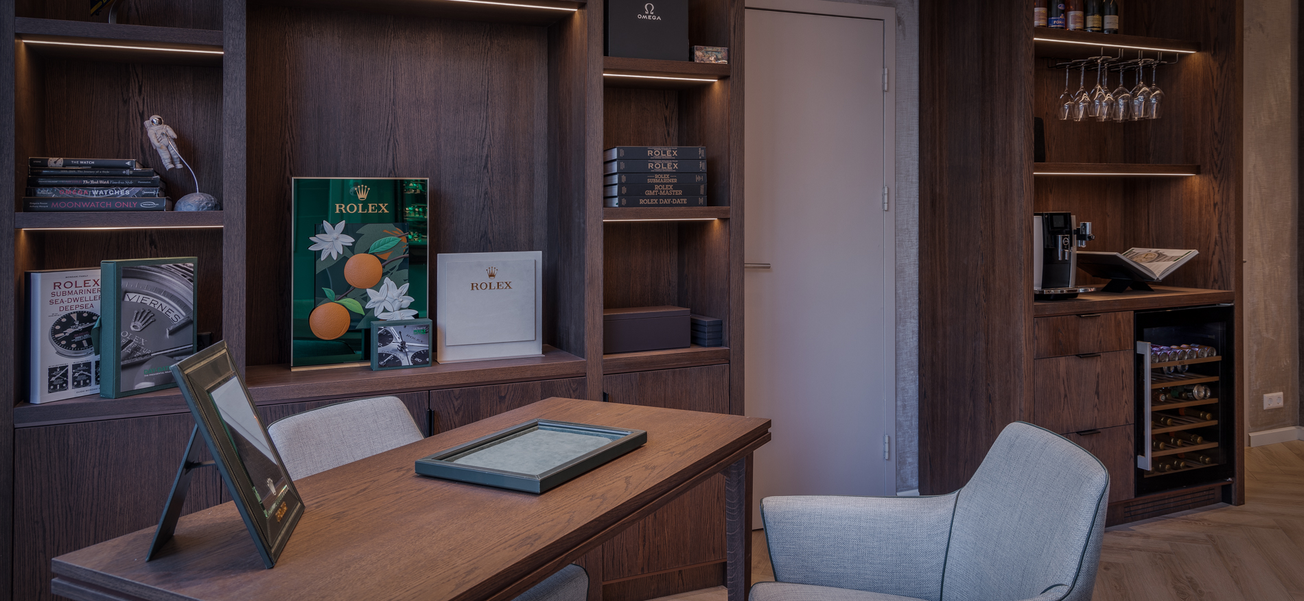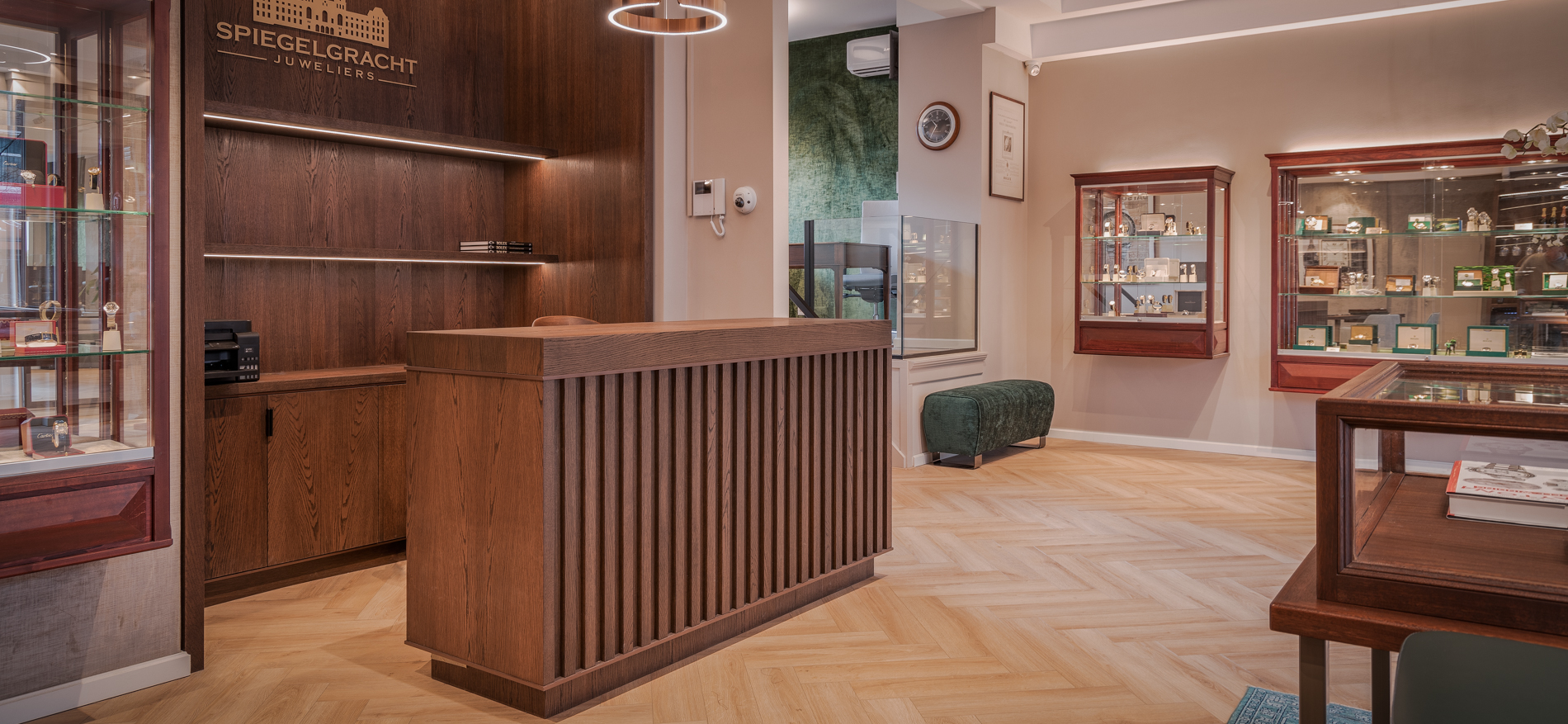 Das WSB-Designteam hat einen Laden mit angenehmer klassischer Atmosphäre und mit Details von Amsterdam entworfen. Wir haben neue Möbel mit Vintage-Möbeln gemischt. Durch die Verwendung eines hellen Bodens und heller Wände wirkt das Ganze zugänglich. Die Wände sind mit edlen Velours-Tapeten verkleidet, diese Tapete bringt Leben und Struktur ins Ganze. Dabei geht es nicht darum, viele Uhren zu präsentieren, sondern darum, die richtige Atmosphäre zu schaffen. Es macht Freude, bei Spiegelgracht einzukaufen, und deshalb haben wir uns auf eine warme, freundliche und zugängliche Atmosphäre mit dem Charme konzentriert, der zu Luxus Uhrenmarken passt.