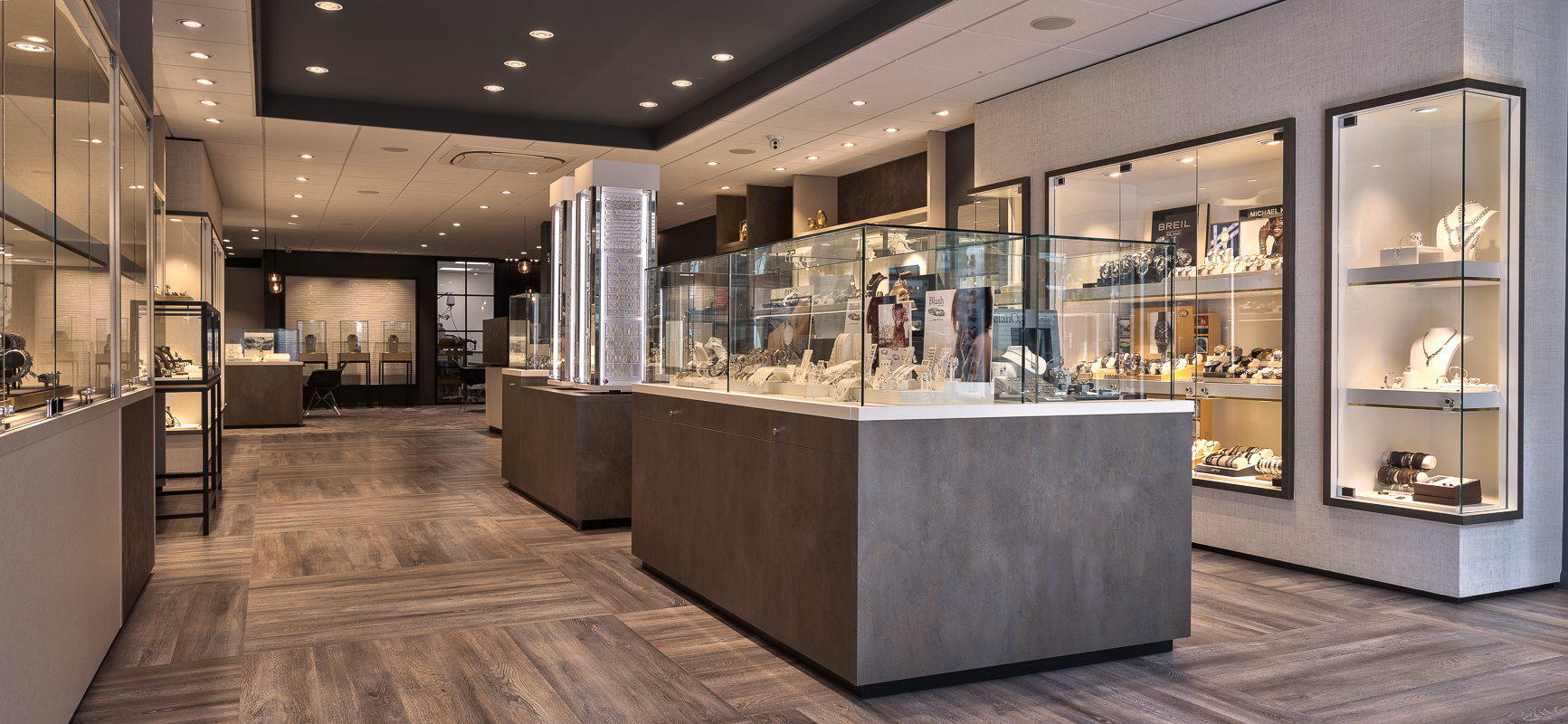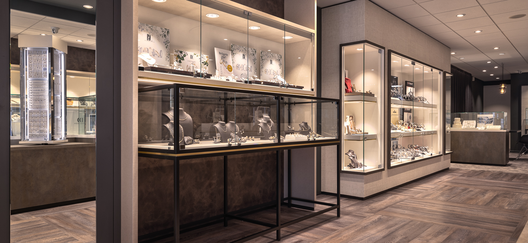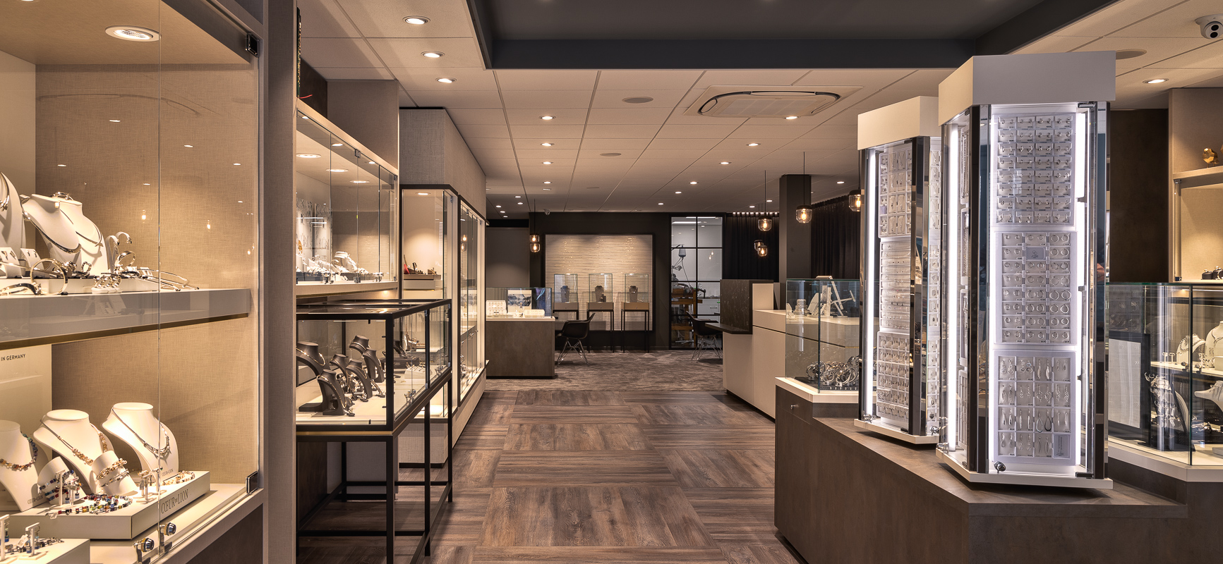 Interiorkonzept für ein Juweliergeschäft in Harderwijk mit Holzboden und vielen Vitrinen.