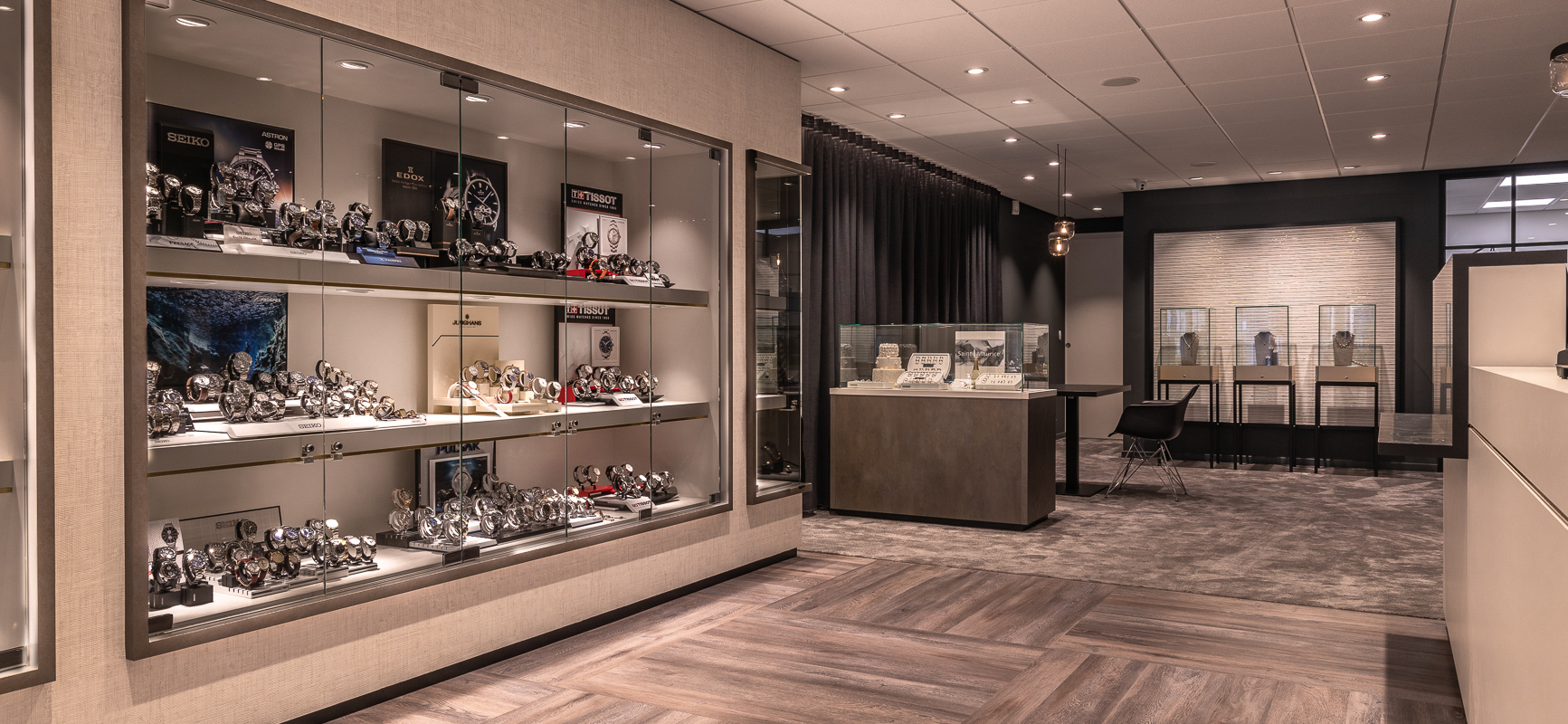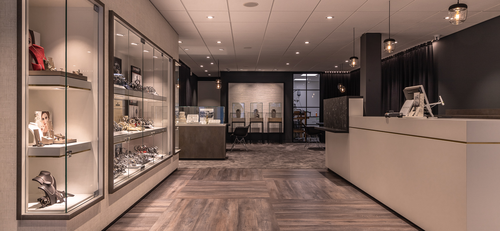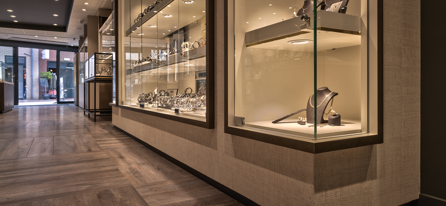 Interiorkonzept für ein Juweliergeschäft in Harderwijk mit Holzboden und vielen Vitrinen.