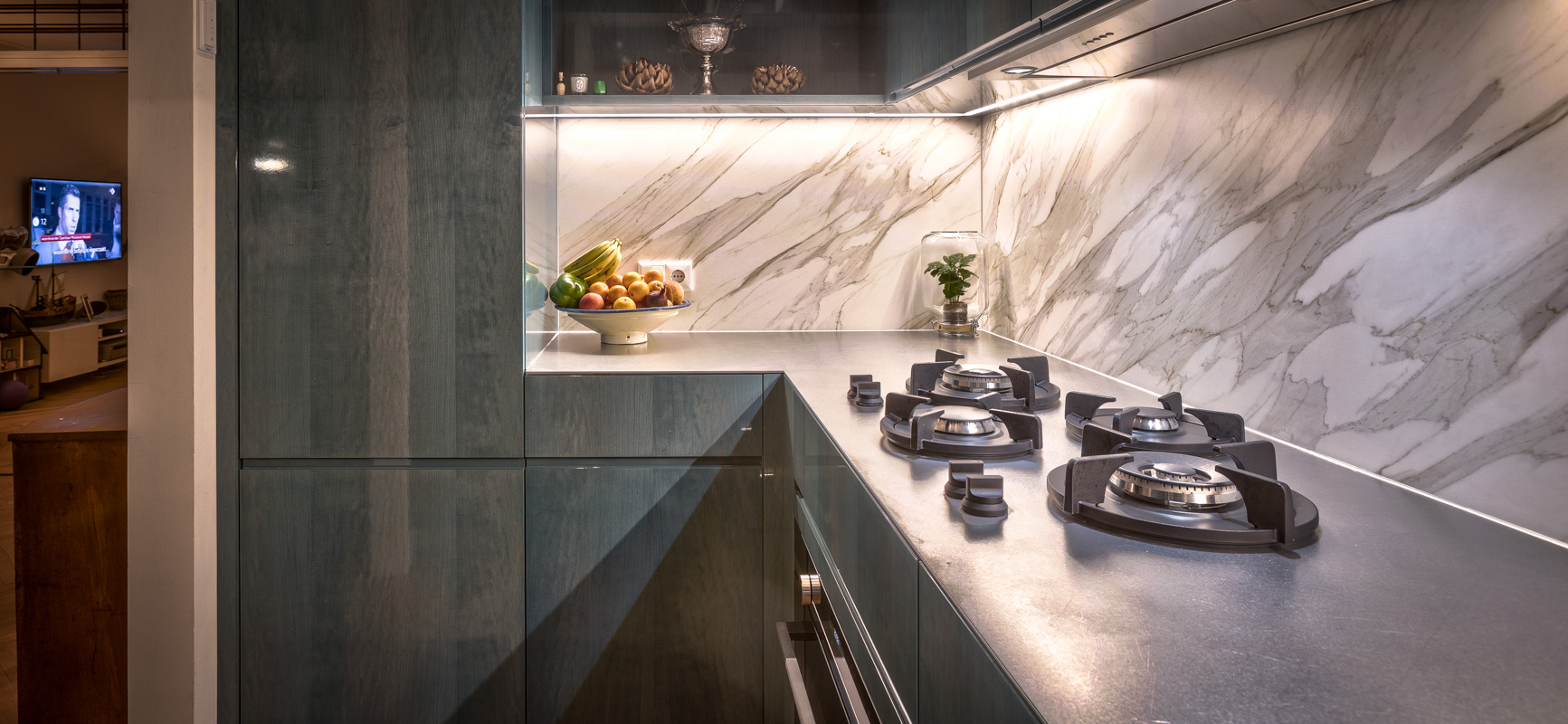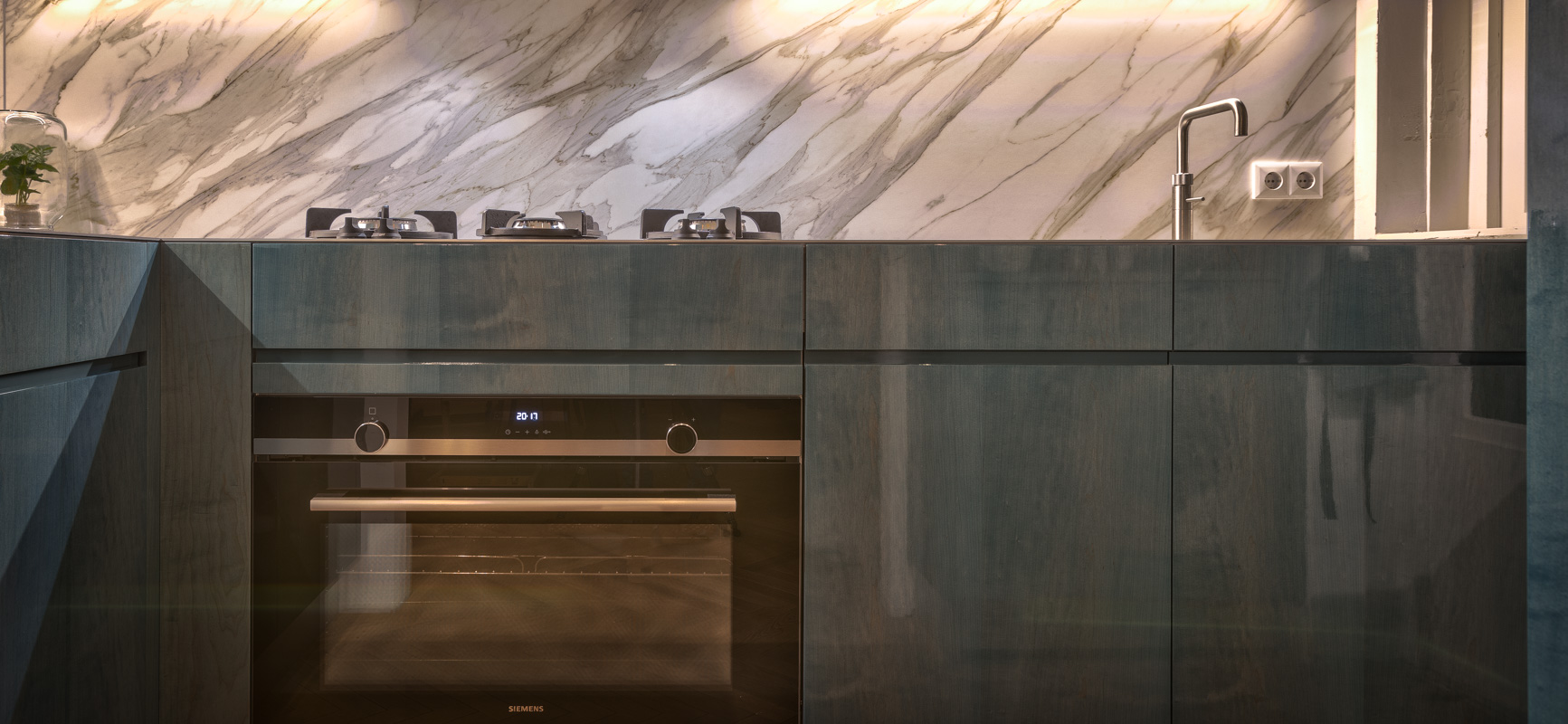 Unser Kunde beauftragte Emyko Residential Interior Design mit der Erstellung eines Entwurfs für ein innovatives, individuelles Interieur. Die Küche ist modern, verfügt aber über einen natürlichen Unterbau aus Spezialholzfurnier. Ahornfurnier, hochglanzpoliert.